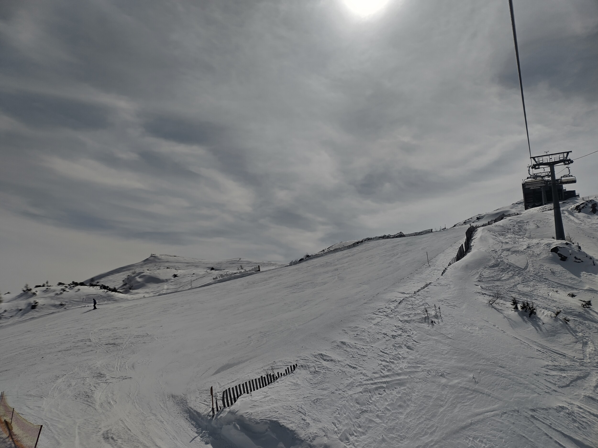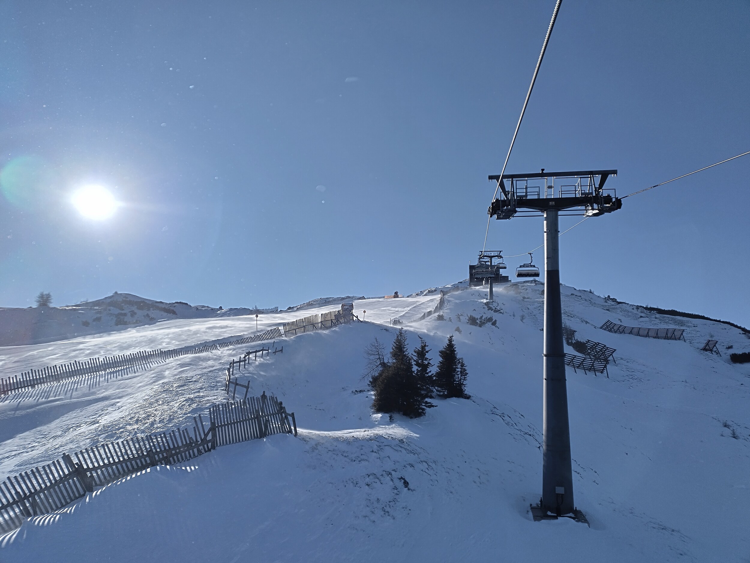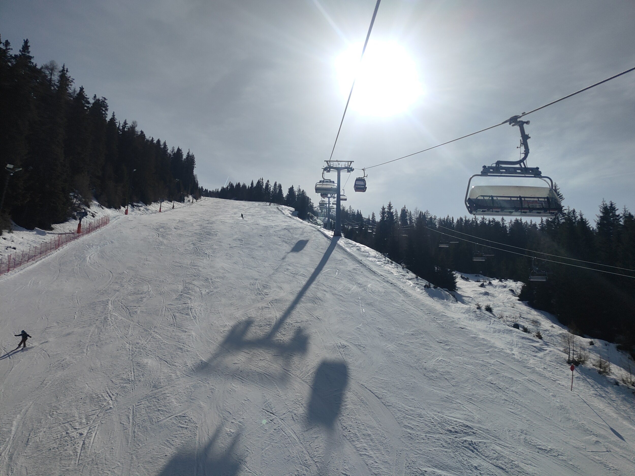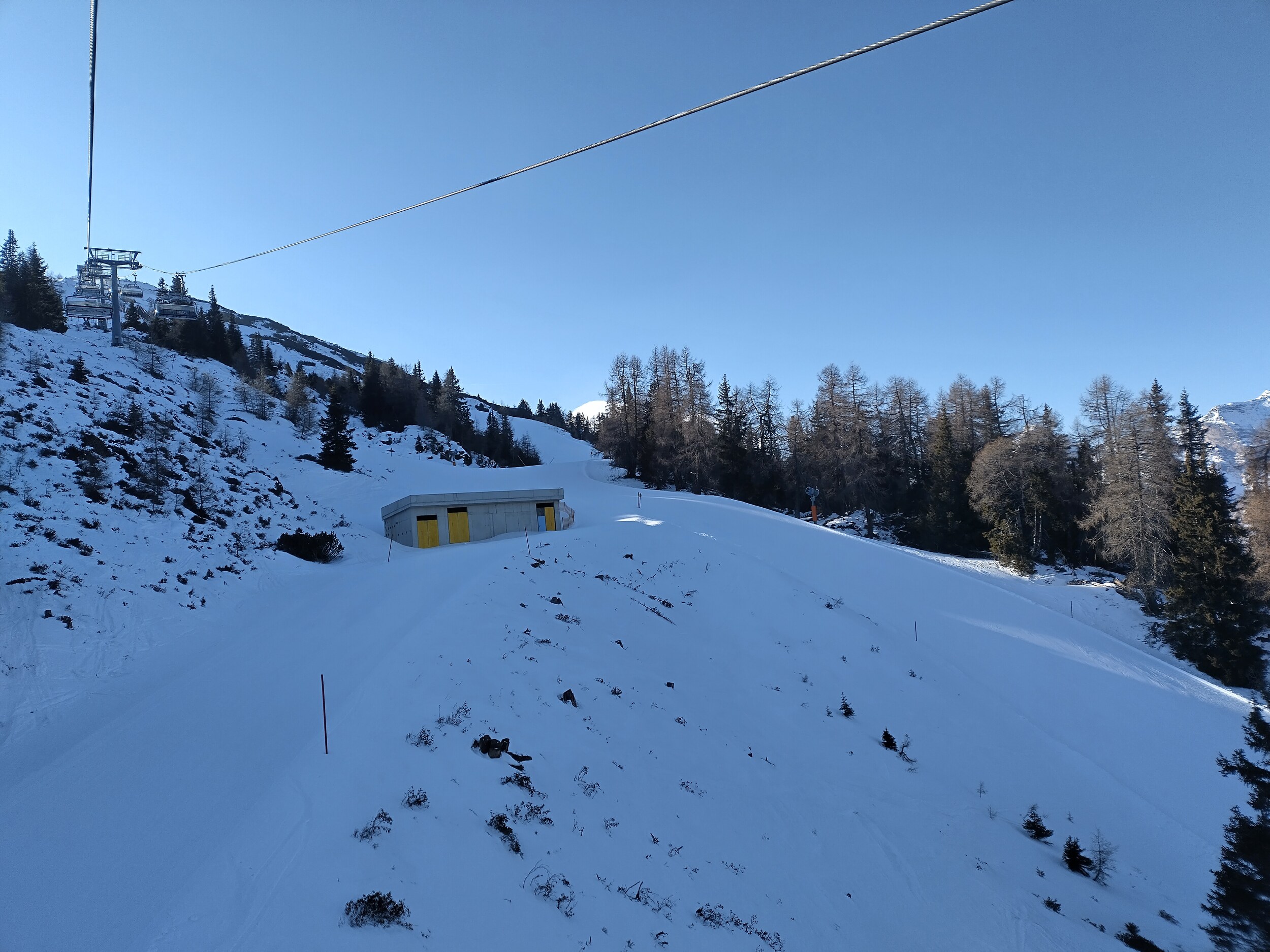 Tatsächlich unter der Europabrücke liegt aber die Talstation zum kleinen Skigebiet auf der Bergeralm. Eine Gondelbahn hoch zur Bergeralm, von dort als direkte Verlängerung ein längerer Sessellift und zwei kleinere Lifte - that's it, weil heute der Skilift ganz oben (Hochsonnlift) zu ist.