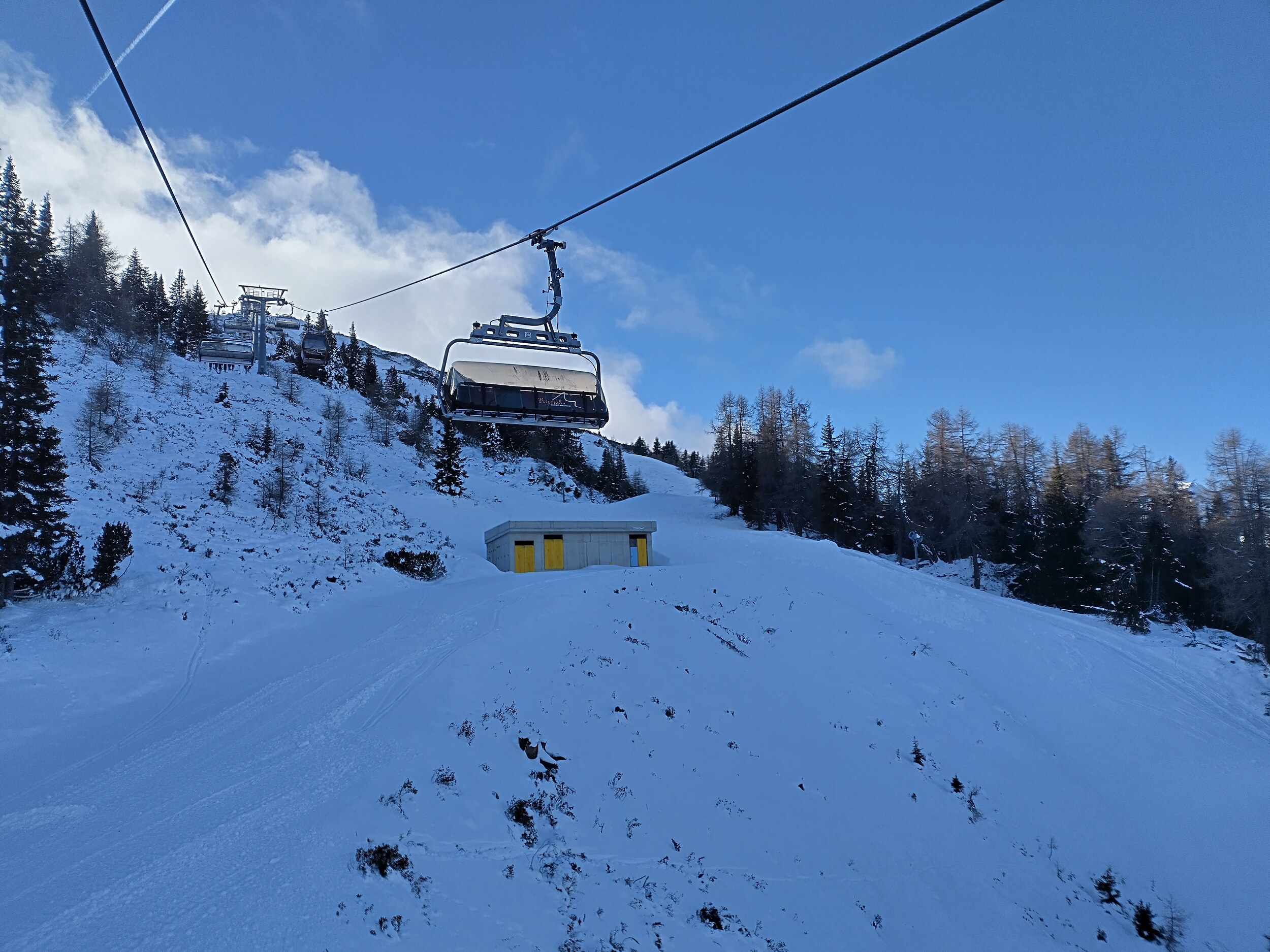 Sitze gerade in der allerletzten Gondel nach oben. Gondel lief durchgehend in sehr zügigem Tempo, das gefällt mir.