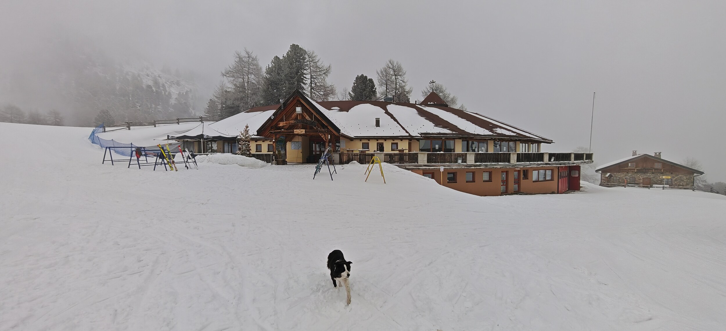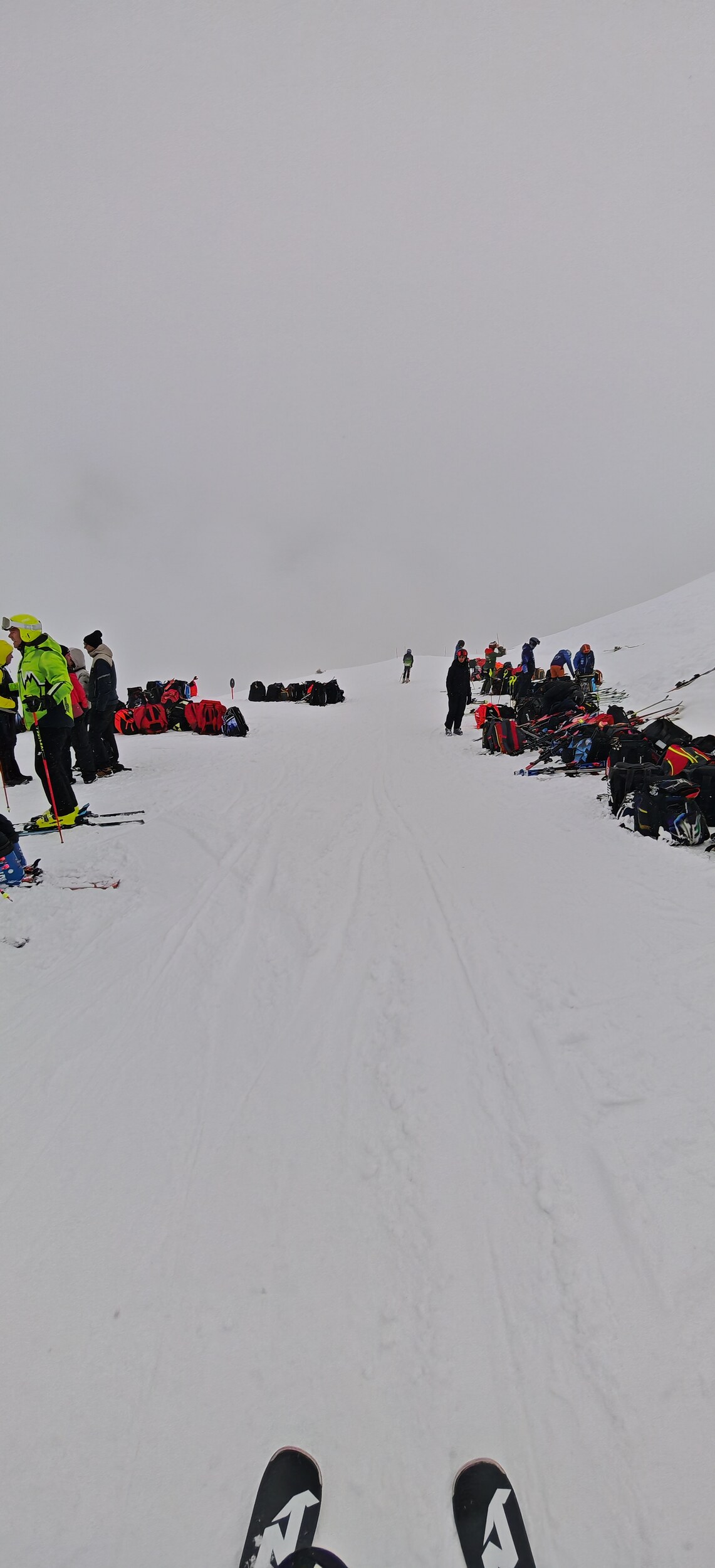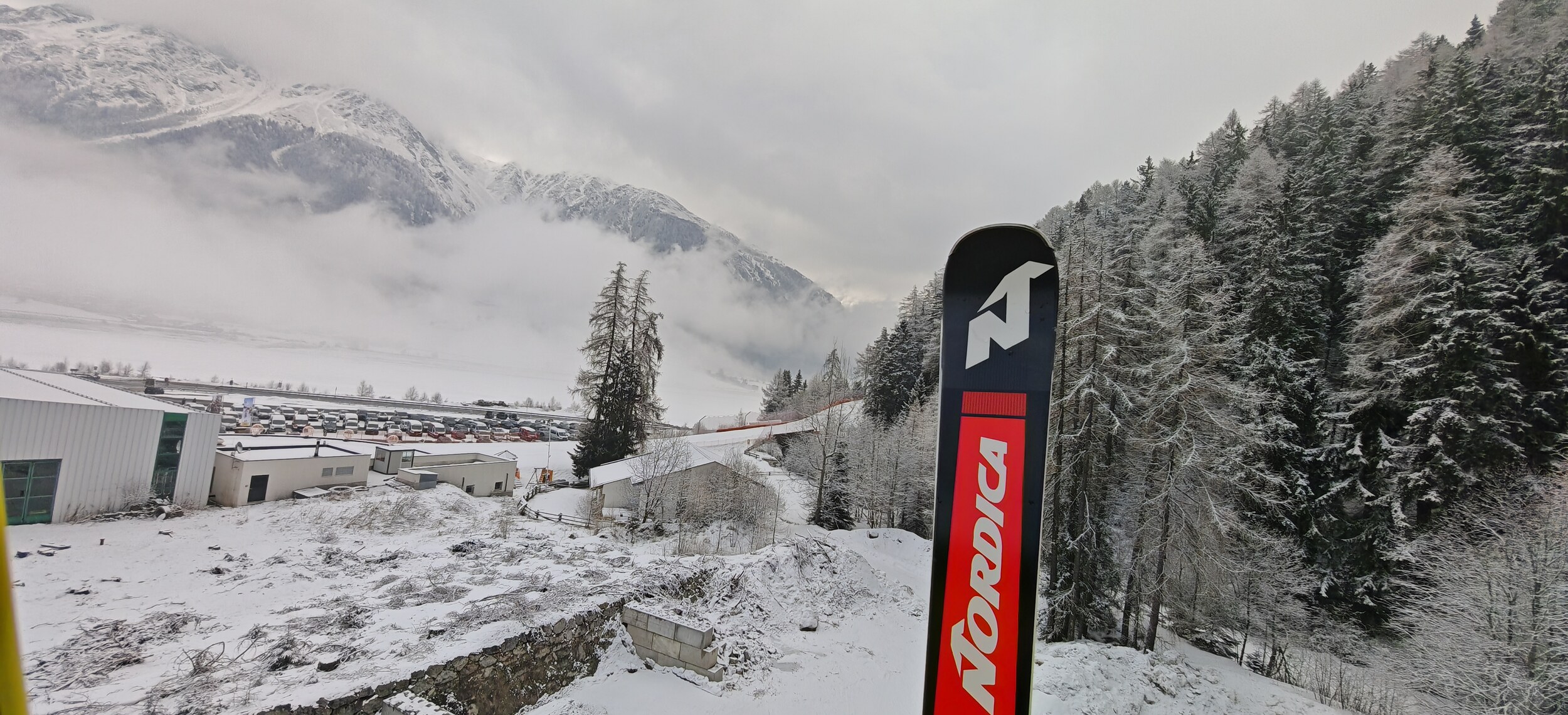 Besonders die Piste 7 ist enttäuschend, da sie eigentlich meine Lieblingspiste gewesen wäre. Die aktuelle Mischung aus harten Schneeplatten und frischem Schnee obendrauf macht aber wenig Spaß.: Die schwarze 8 wurde über Nacht präpariert und ist ein Traum, also fahre ich sie gleich nochmal. Schade nur, dass das der einzige langsame Lift in der Gegend ist und die schwarze 9 vom interaktiven Pistenplan in Wirklichkeit gar nicht existiert. Neben der schwarzen Piste 7 findet ein Clubrennen statt (Clubs aus Bruneck, Seiser Alm,...) und wie immer bedeutet das, dass der Liftausgang und der Zugang zur Piste durch Rucksäcke blockiert sind (Als ich das nächste Mal vorbeikam, konnte ich kein Foto machen, weil alles komplett versperrt war...). Die Verbindungspiste ist sehr flach, aber eine Verbindung auf Skiern ist immer besser als eine nur mit dem Lift. Oben am Haideralm: Die einzige Aussicht, die ich hatte, bot sich mir von der Verbindungsgondel aus; alle anderen Ausblicke waren durch Nebel versperrt.