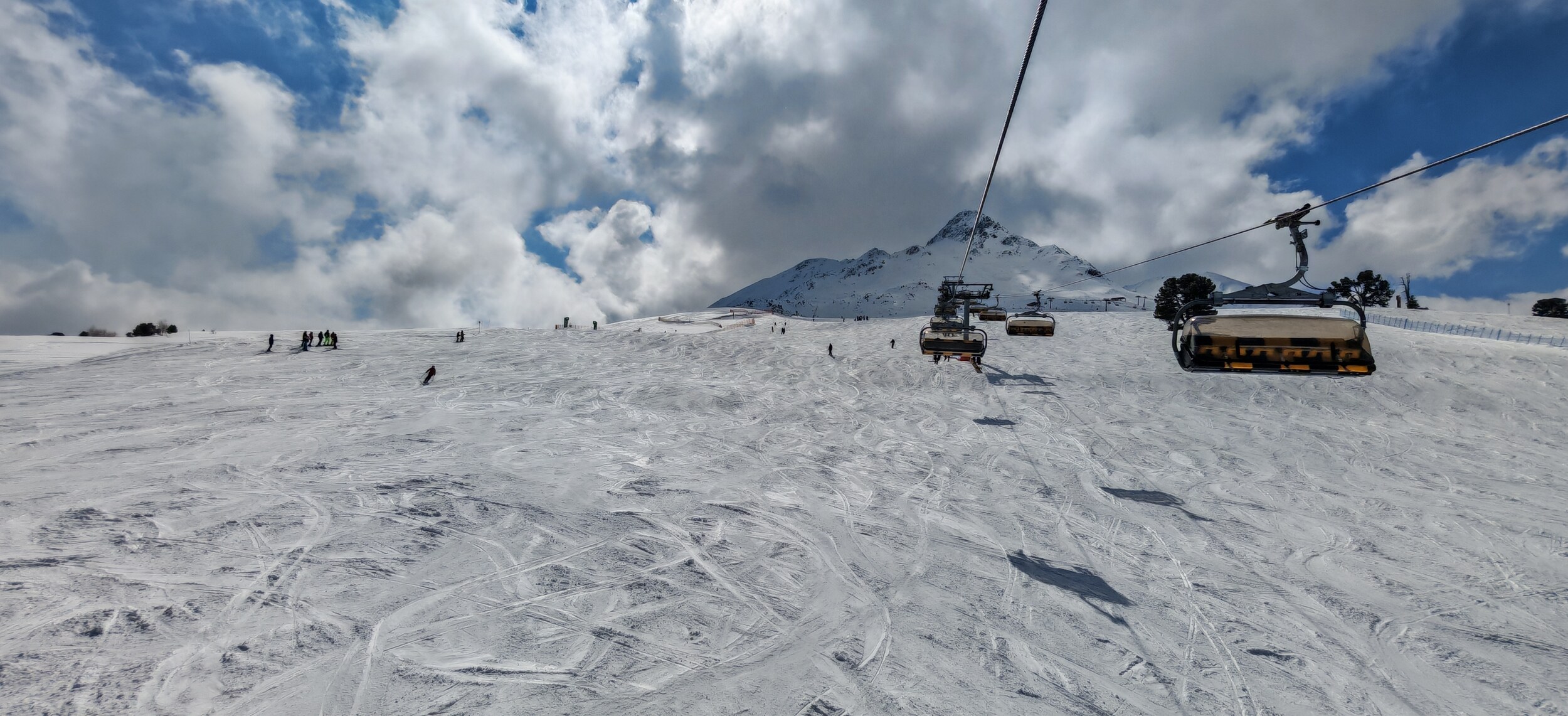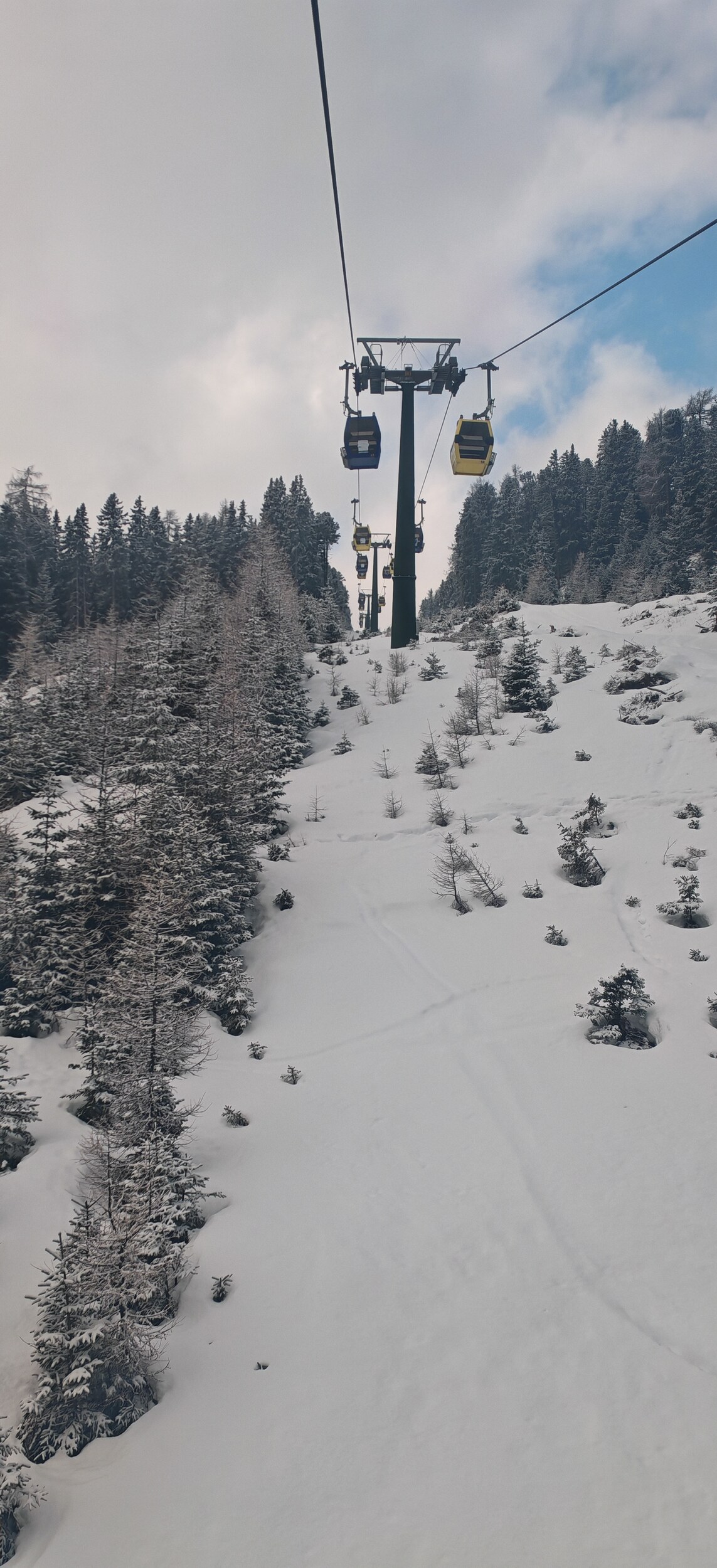 Sehr positiv ist jedoch, dass die Gondel trotz geringer Auslastung mit einer beachtlichen Geschwindigkeit von 21 km/h fährt. Das Wetter bessert sich jetzt schnell: Die letzten zwei Stunden waren ein Carvingtraum.