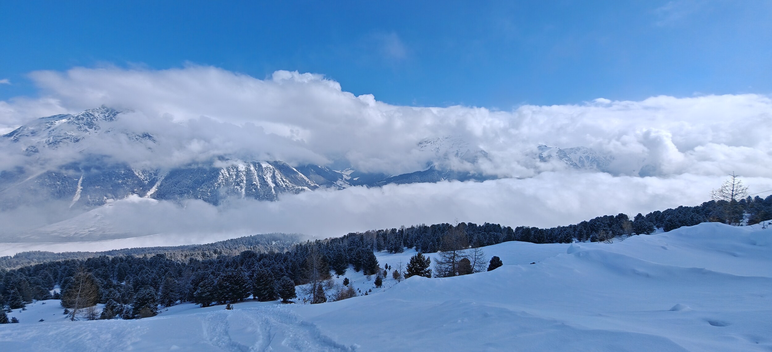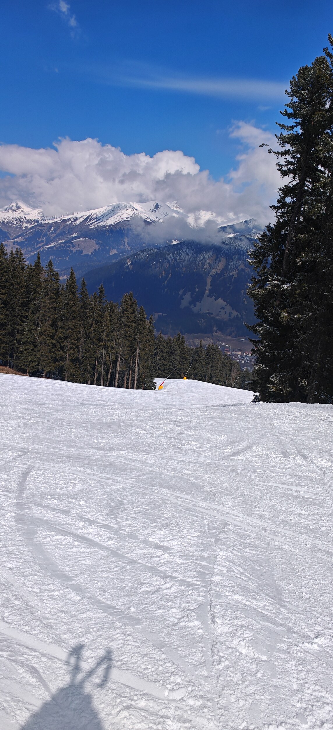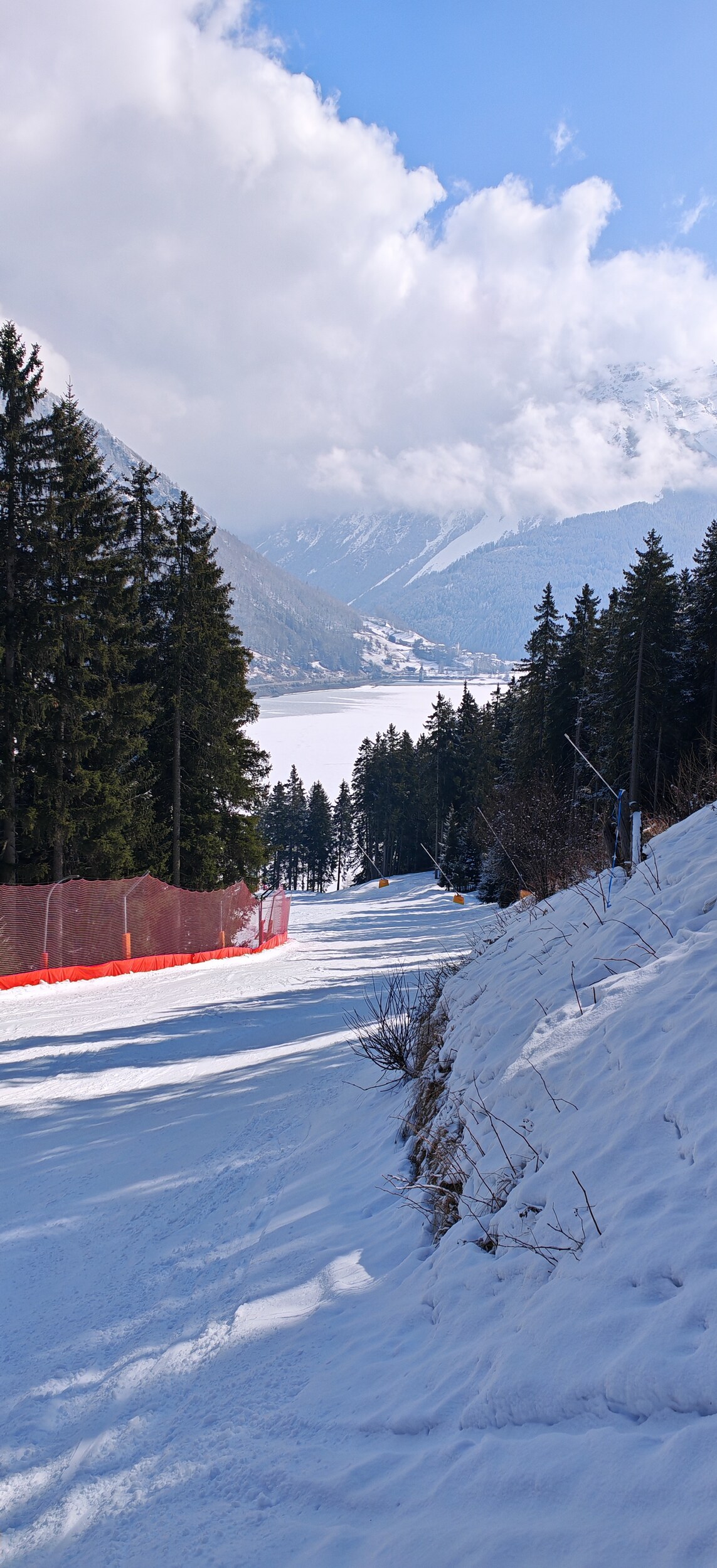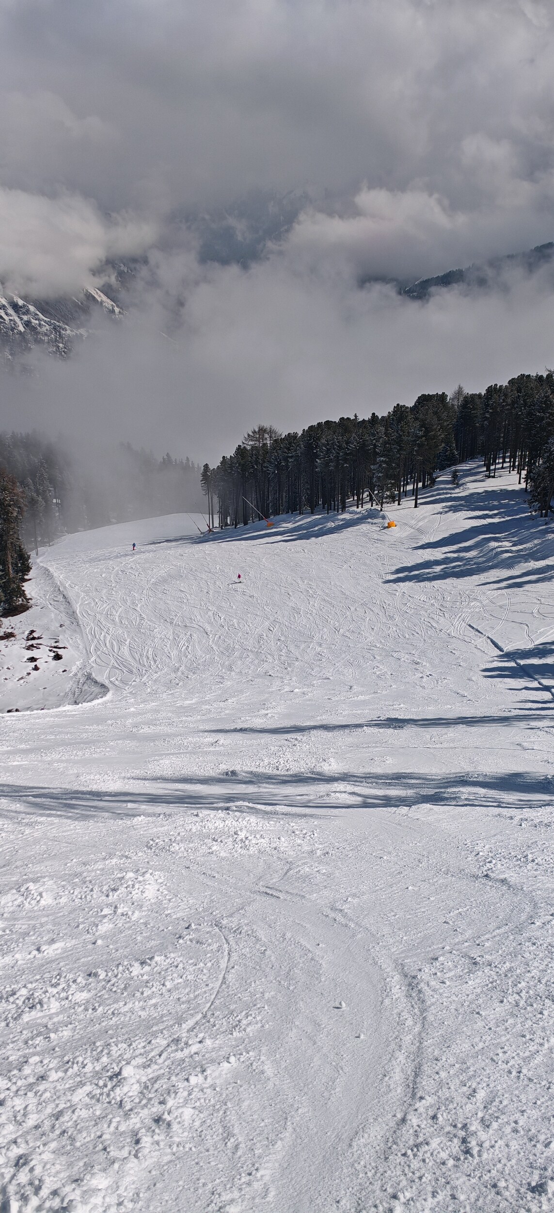 Als wir heute losfahren, schneite es seit ca einer halben Stunde dicke Flocken. Die Straße war winterlich weiß. Talabfahrt St Valentin mit Schnee bedeckt, es muss oben am Berg wohl auch nachts geschneit haben. Pisten heute generell sehr schnell aufgefahren, da nach dem Neuschnee keine Präperierung mehr. Immerhin die Schneekanonenhügel auf der Talabfahrt waren verteilt. Ab ca 10.15 strahlender Sonnenschein, welcher bis ca 14.30 anhielt. Dann kroch der Nebel vom Tal hoch. Ende des Skitags um 15.10.