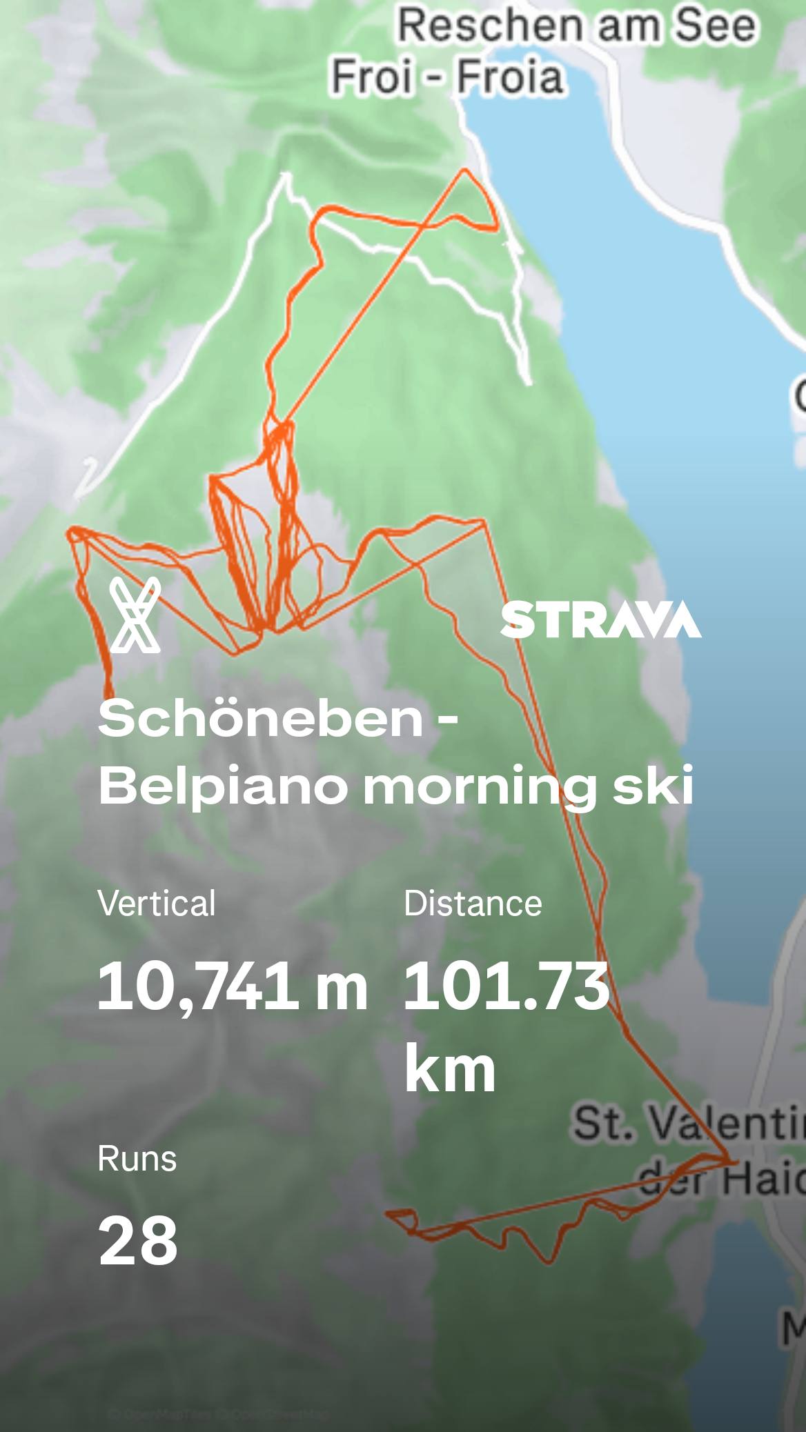Start an der Haideralmbahn mit Talabfahrt zur Verbindungsbahn. Deutlich weniger Neuschnee als gestern früh. Da es rund um die Uhr weiterschneite, Talabfahrten nach Reschen und 1 x Jochbahn. An der Talabfahrt nervt die Treppe hoch zum Einstieg in die Gondelbahn. Pisten deutlich besser als gestern. Nach der Pause nochmals Talabfahrt und Jochbahn und dann zurück nach St. Valentin. Skiausrüstung der Kinder abgeben direkt neben dem Hotel. Neue Skischuhe für mich gekauft. Morgen Heimfahrt.