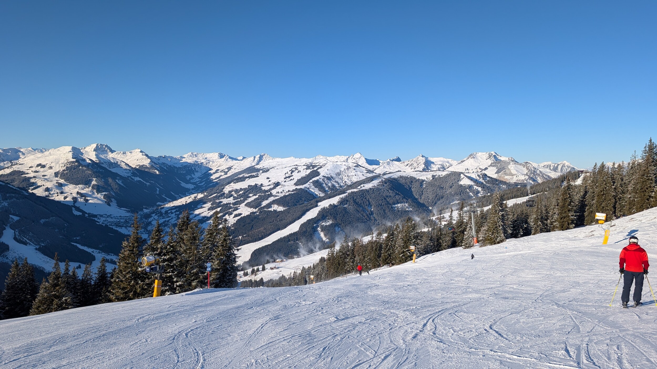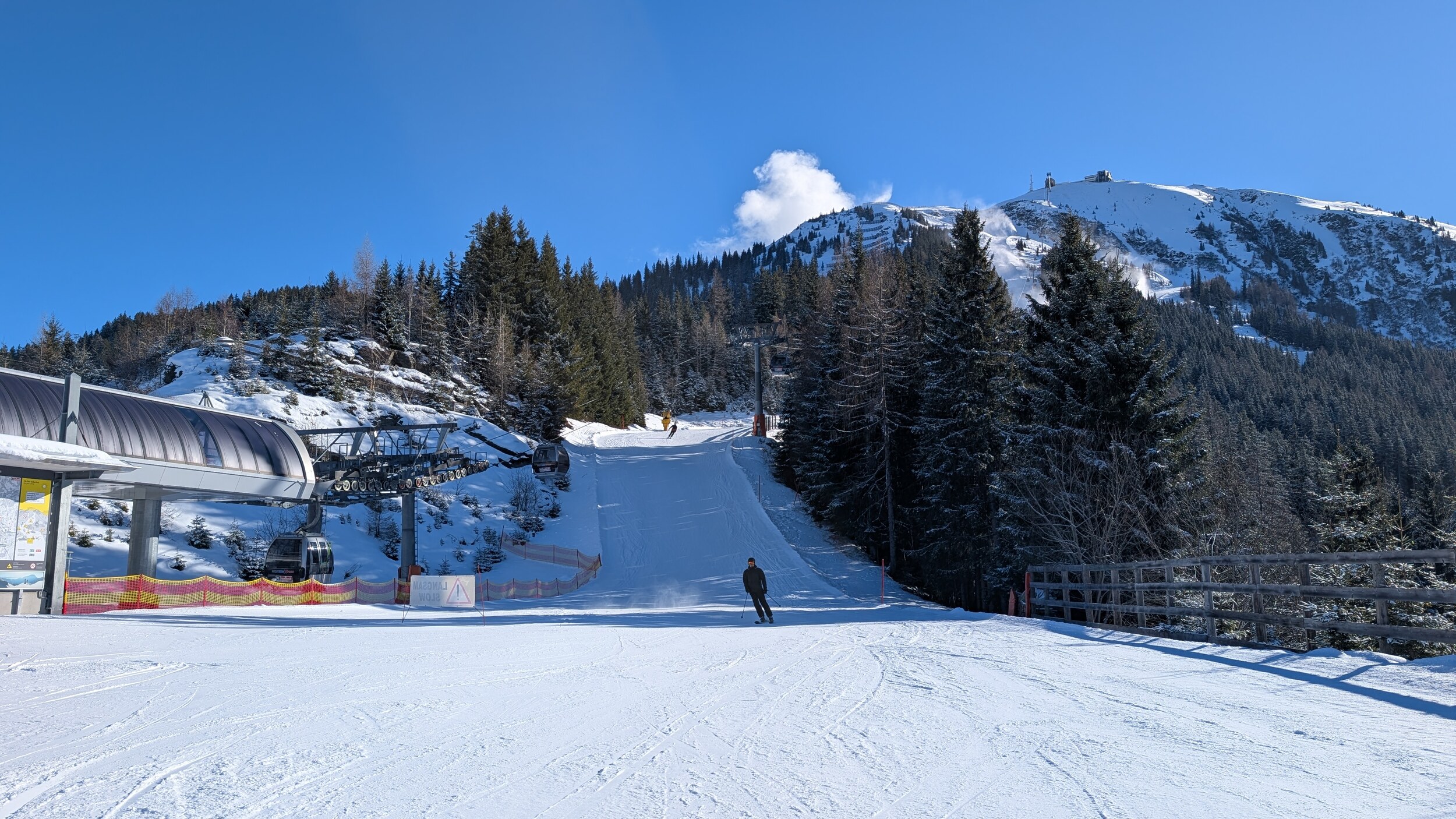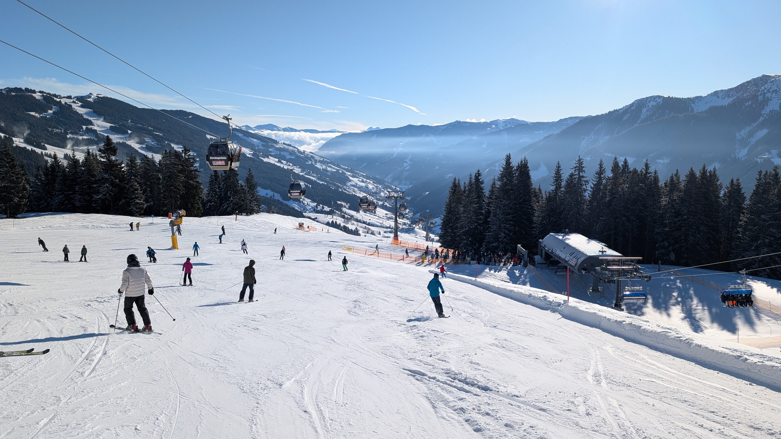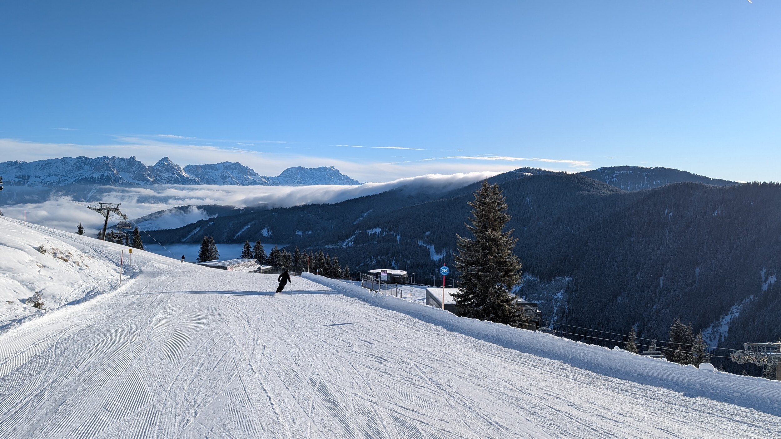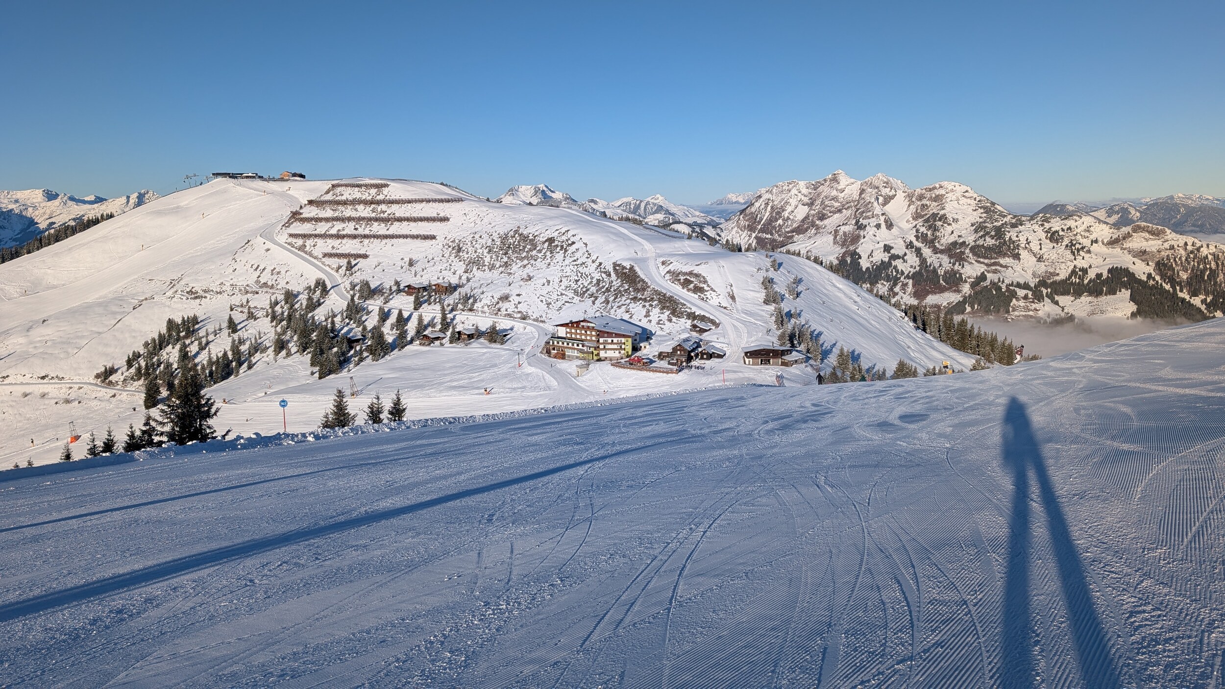 Saalbach Zentrum ( Kohlmais und Panorama 6er) am Nachmittag dann dichtes Gewusel, großteils Anfänger unterwegs dort. Die Abfahrt am Bernkogel ausgelassen (Ausblick aus der EUB hat gereicht), die hab ich noch nie gut erlebt, wahrscheinlich bin ich immer zur falschen Zeit dort. Schattberg und Fieberbrunn am späteren Nachmittag angenehm.