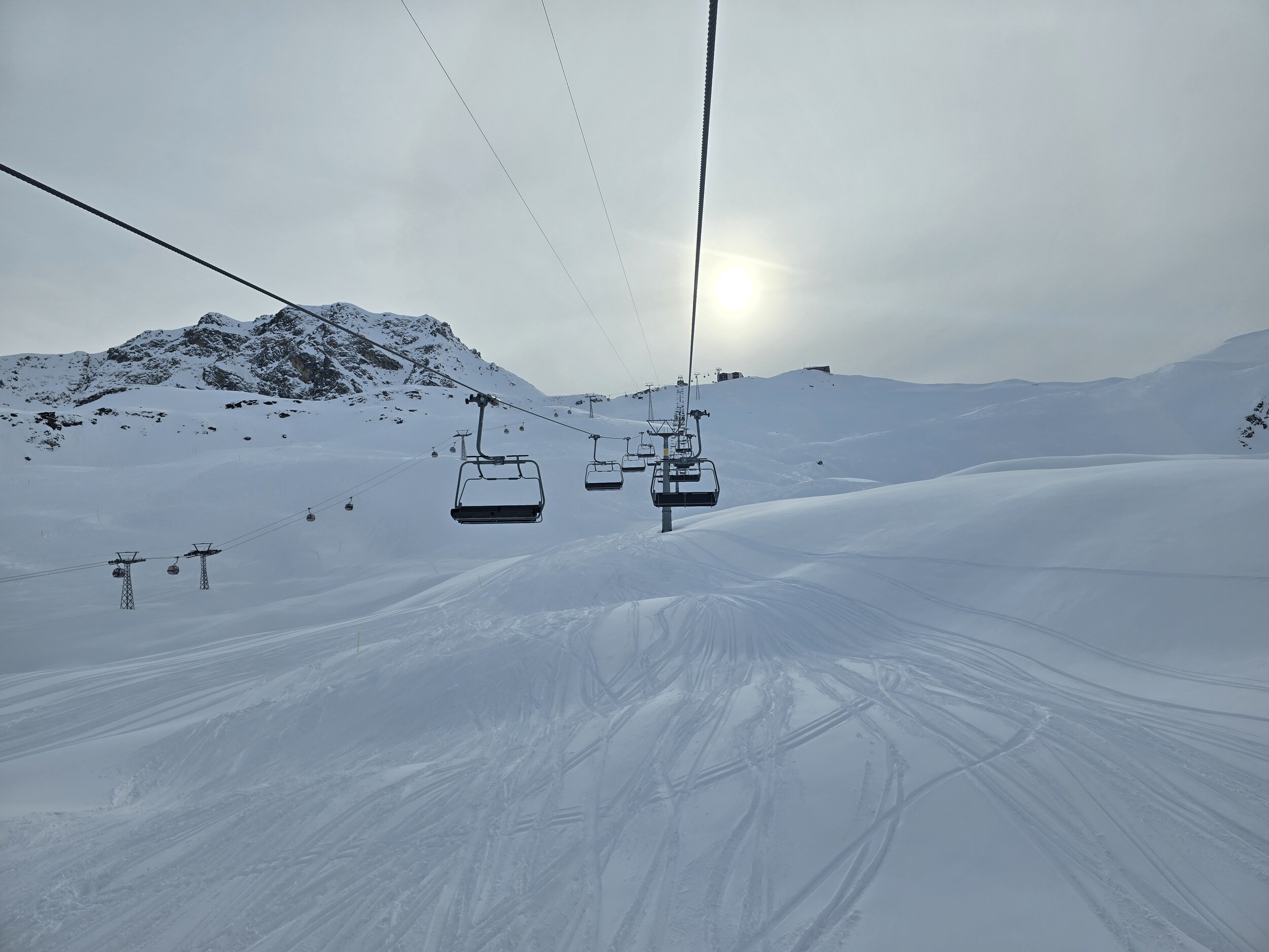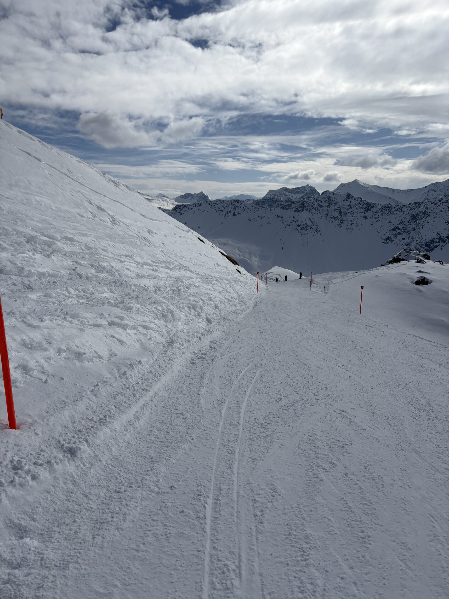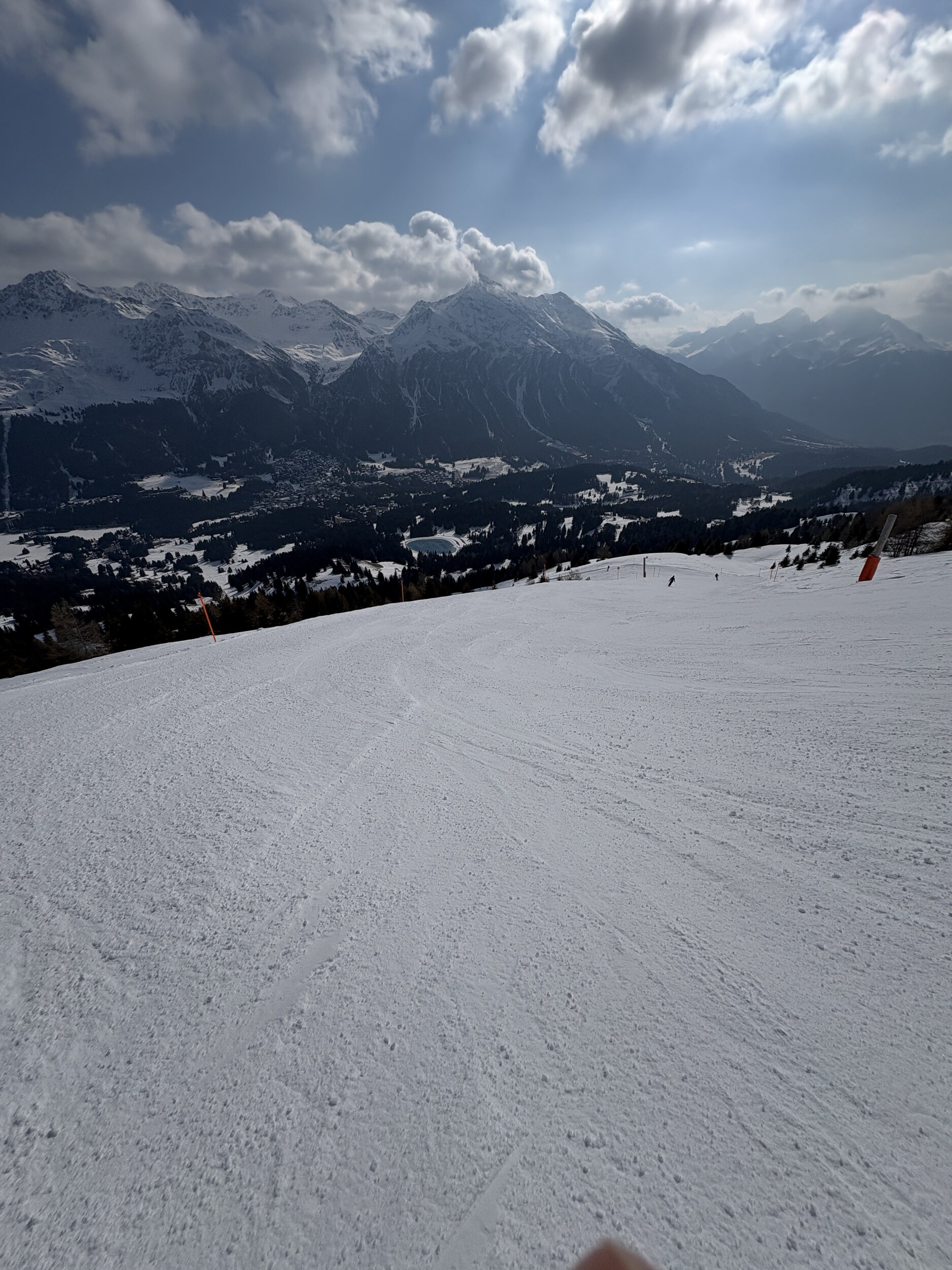 ins Hauptskigebiet gekämpft. Aber dort war es natürlich auch nicht besser, schwere, feuchte Neuschneepisten halt. Der Wechsel auf die Ostseite hat dann leider auch keine Verbesserung gebracht, auch hier zu warm, am Motta wurden um 11:00 Uhr 8 Grad plus angezeigt. Und für die Ostseite recht viel los. Am Weisshorn Speed ging noch eine Runde Off-Piste.