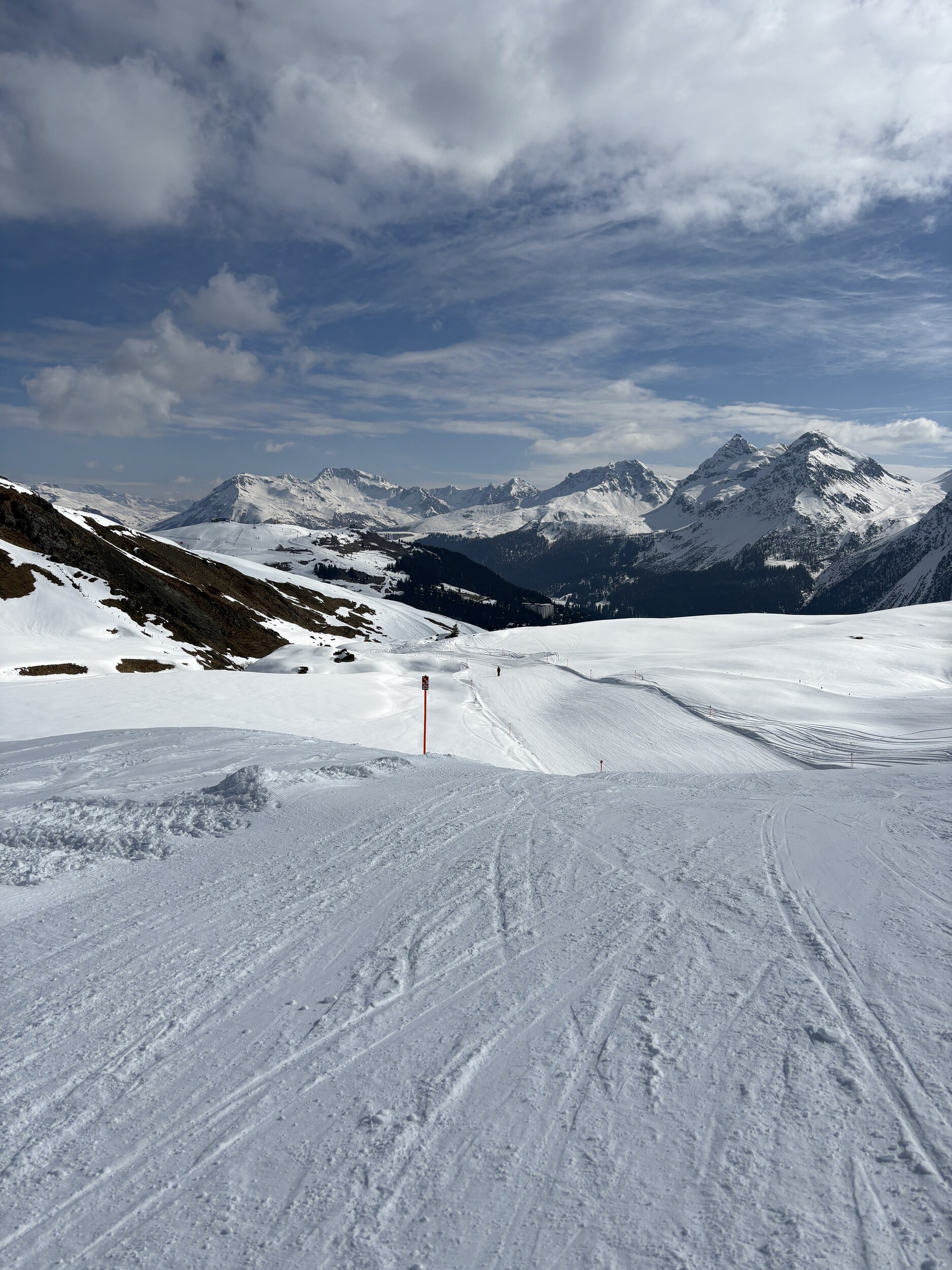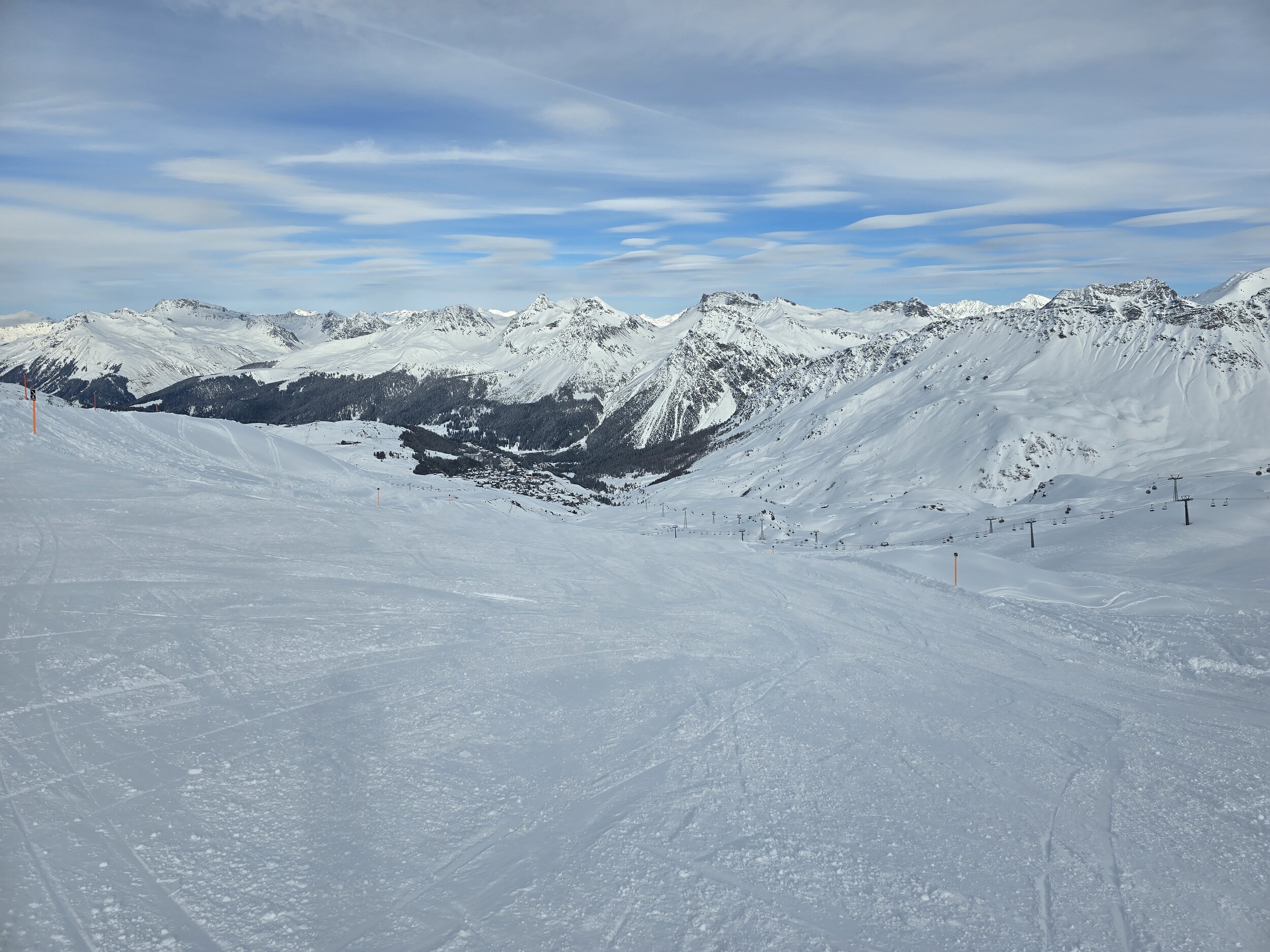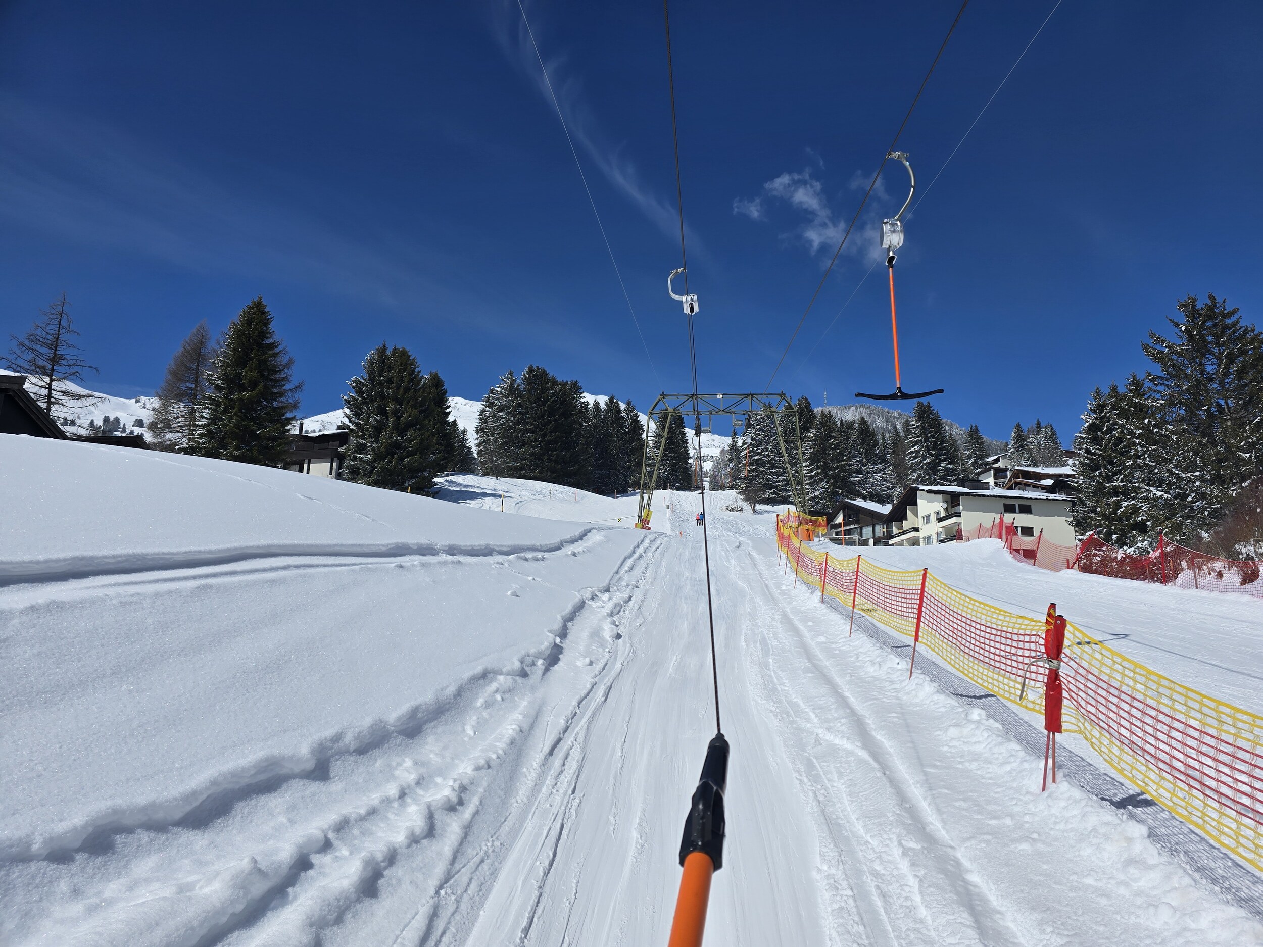 Insgesamt ein sehr guter Tag heute, es sind dann doch rund 19'000 Höhenmeter geworden. Die Schneeverhältnisse sind für Ende März einfach genial, auch wenn die Kombination von hart gefrohrener Unterlage und Neuschnee relativ rasch zu Haufenbildung führt. Mir fällt in Arosa-Lenzerheide aber immer wieder auf, dass sich die Leute sehr schlecht verteilen, da die meisten das Gebiet in derselben Reihenfolge befahren (Start auf der Westseite der Lenzerheide, dann Wechsel nach Arosa und zum Schluss Ostseite Lenzerheide). Falls man aber wie ich heute antizyklisch unterwegs ist, hat man meist viel Platz am Lift und auf den Pisten.