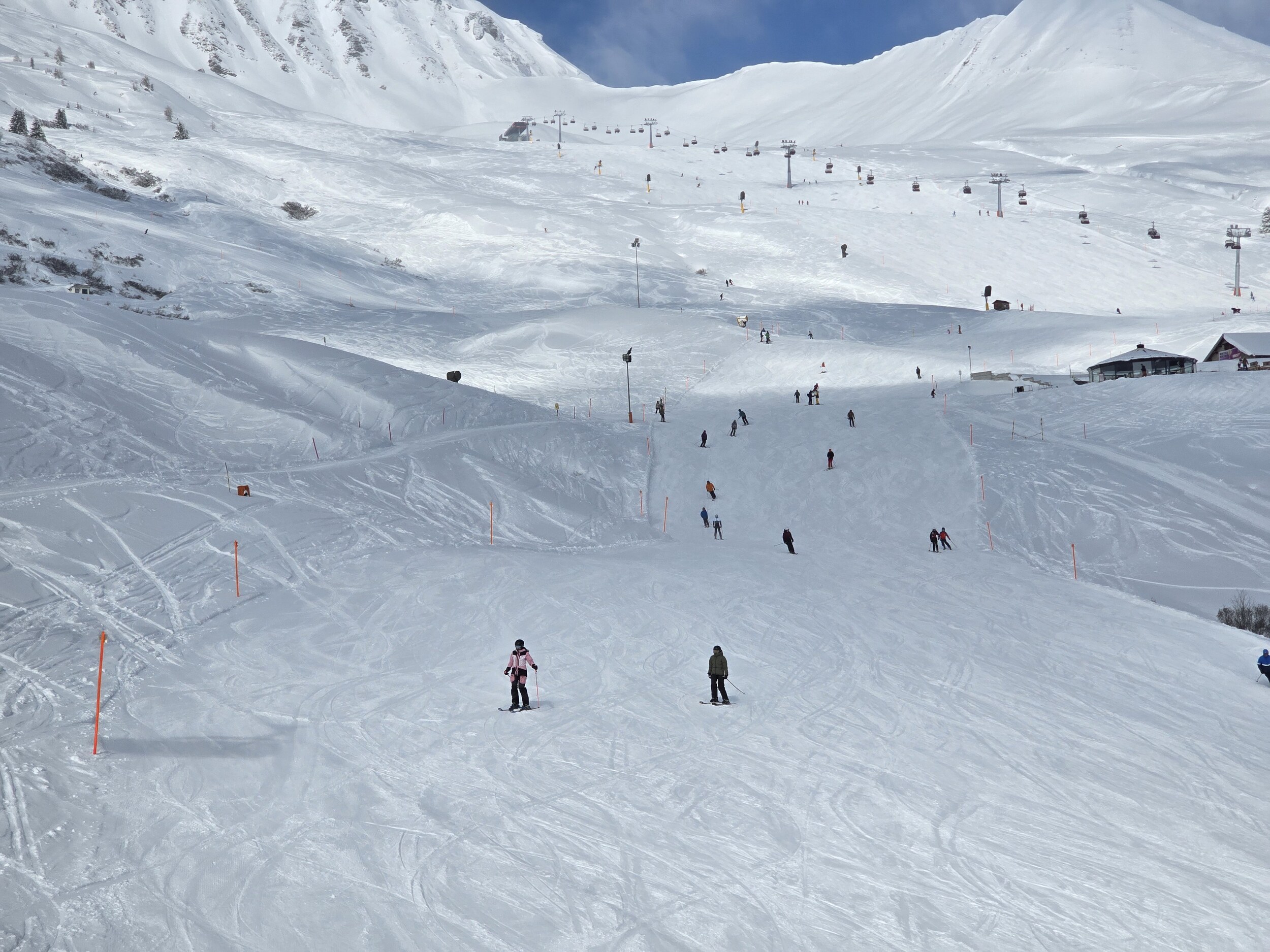 Es war aber schon früh so warm, dass der Schnee schnell recht schwer wurde und somit auch das Fahren echt anstrengend. Irgendwann nachdem soweit alle Lifte geöffnet waren haben wir uns übers Portal