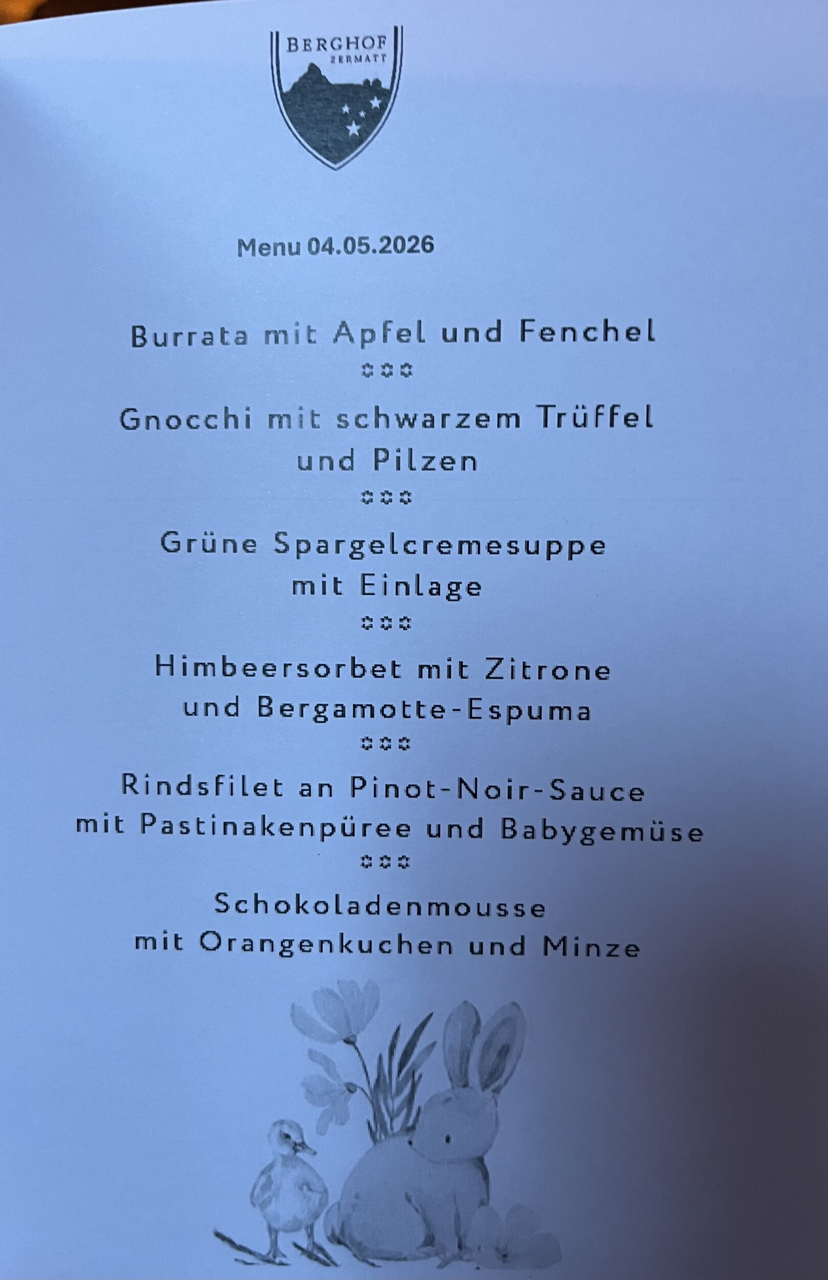 Den leckeren Hotel-Kuchen lassen wir mit einem Hugo begleiten. Blöd, dass wir die kurzen Hosen vergessen haben: Mein Lieblingsplatz im Ruheraum ist auch heute frei: Das Ostermenü sucht seinesgleichen. Auch wenn der Trüffel-Hund offenbar erfolglos war und es statt schwarzem Trüffel schwarzen Knoblauch gibt: Meine hier geäusserte Kritik an diesem Hotel, aber auch unsere Freude, hat über verschlungene Wege
