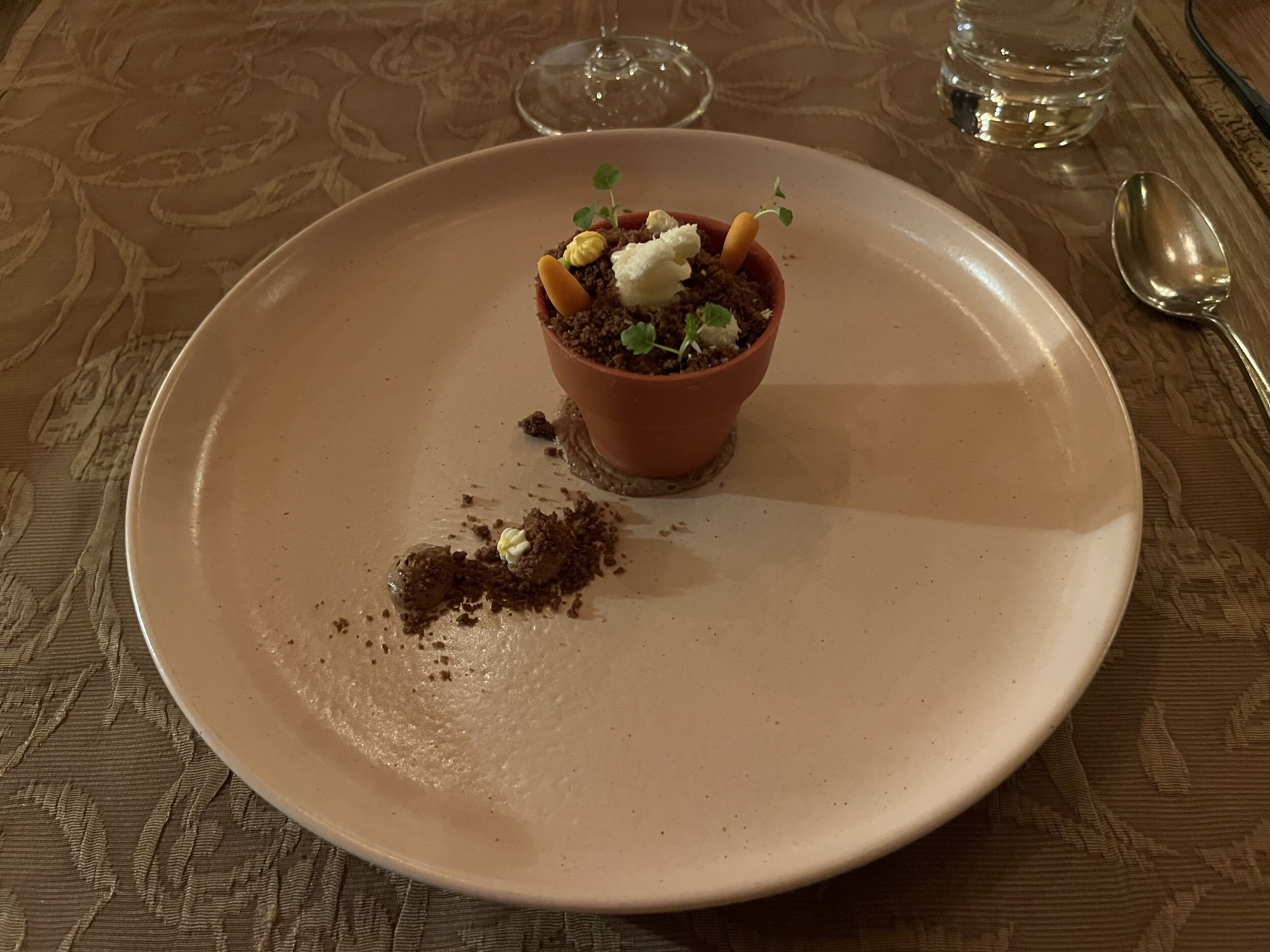 Der Küchenchef ist super kreativ. Ist das nicht süss? Das Blumentöpfli ist aus Schokolade, die klitzekleinen Rüebli sind aus Marzipan. Das ist ja eine „Gfetterliarbet“ sondergleichen. Wow!