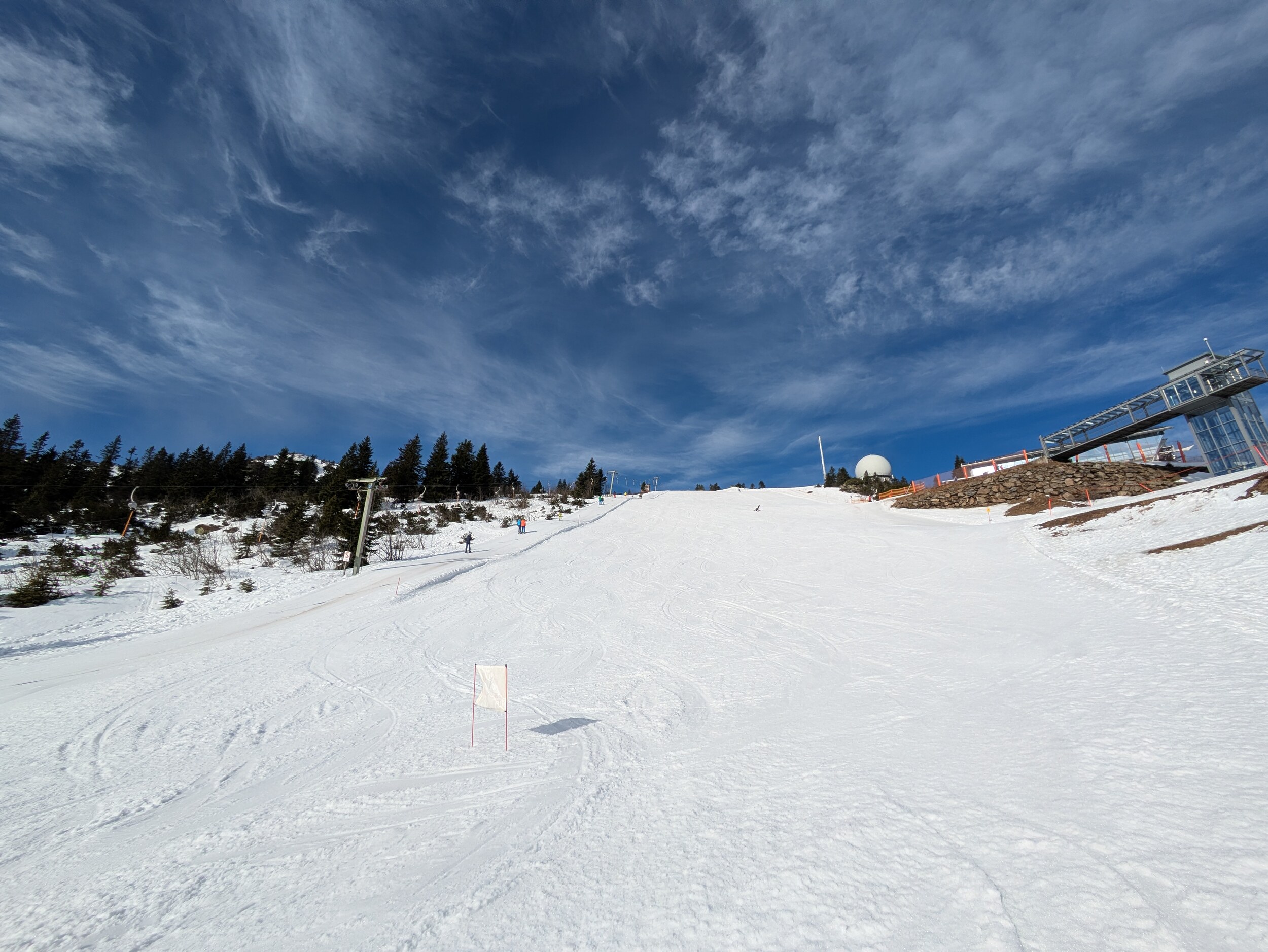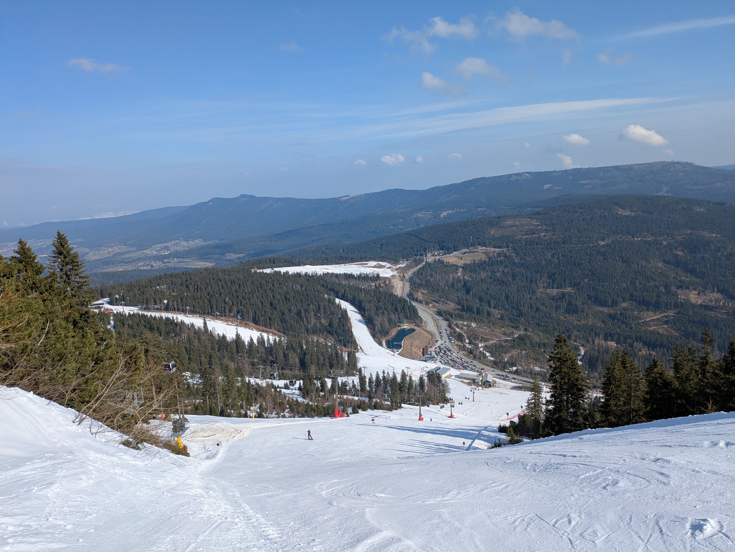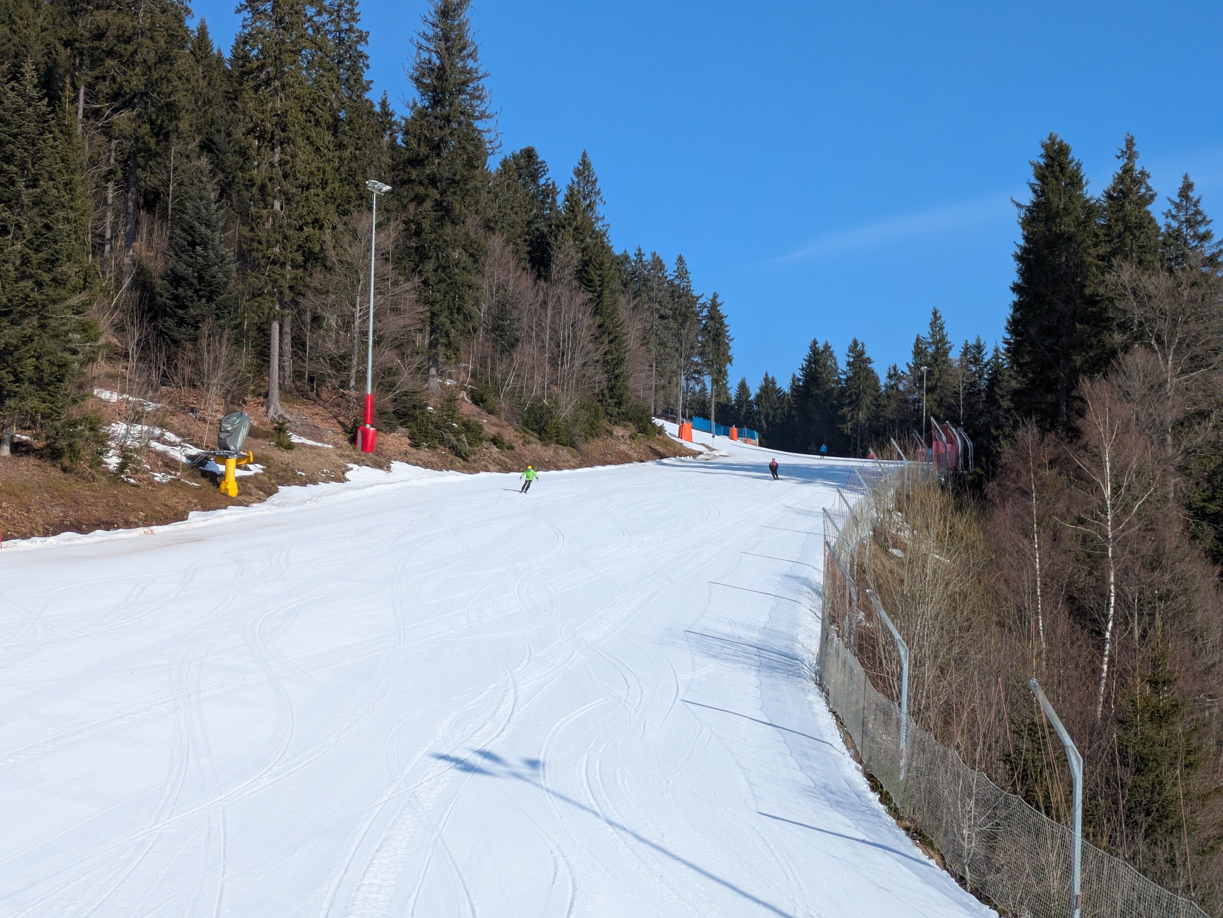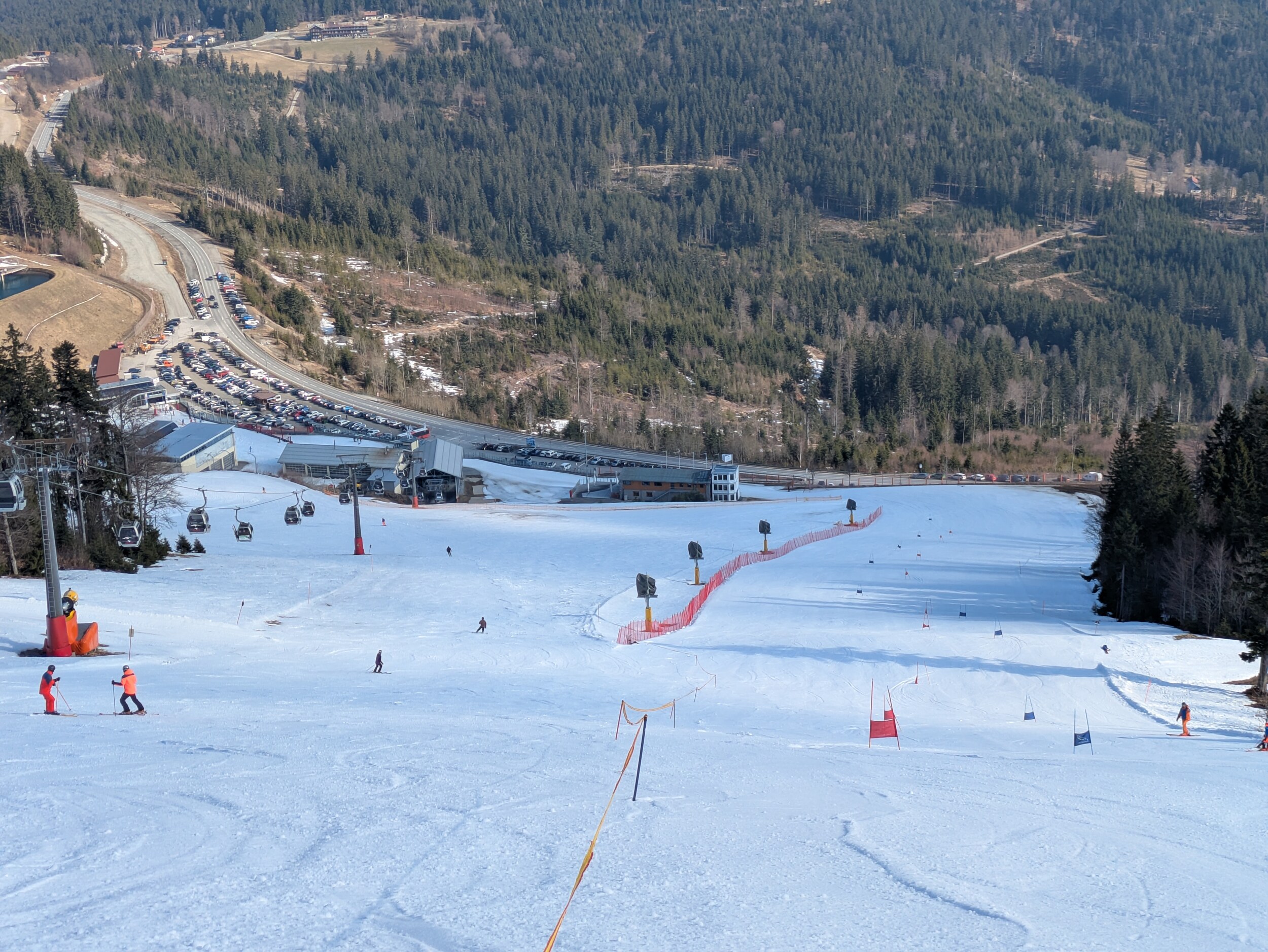 Präpariert am Morgen waren noch die Böhmerwaldabfahrt und der Osthang. Ein paar Raupenspuren gab's netterweise auch in der Bayerwaldabfahrt, Sonnenhang und Familienabfahrt. Der Schnee würde sogar noch immer für Vollbetrieb reichen. Es war direkt ab Morgen butterweich.