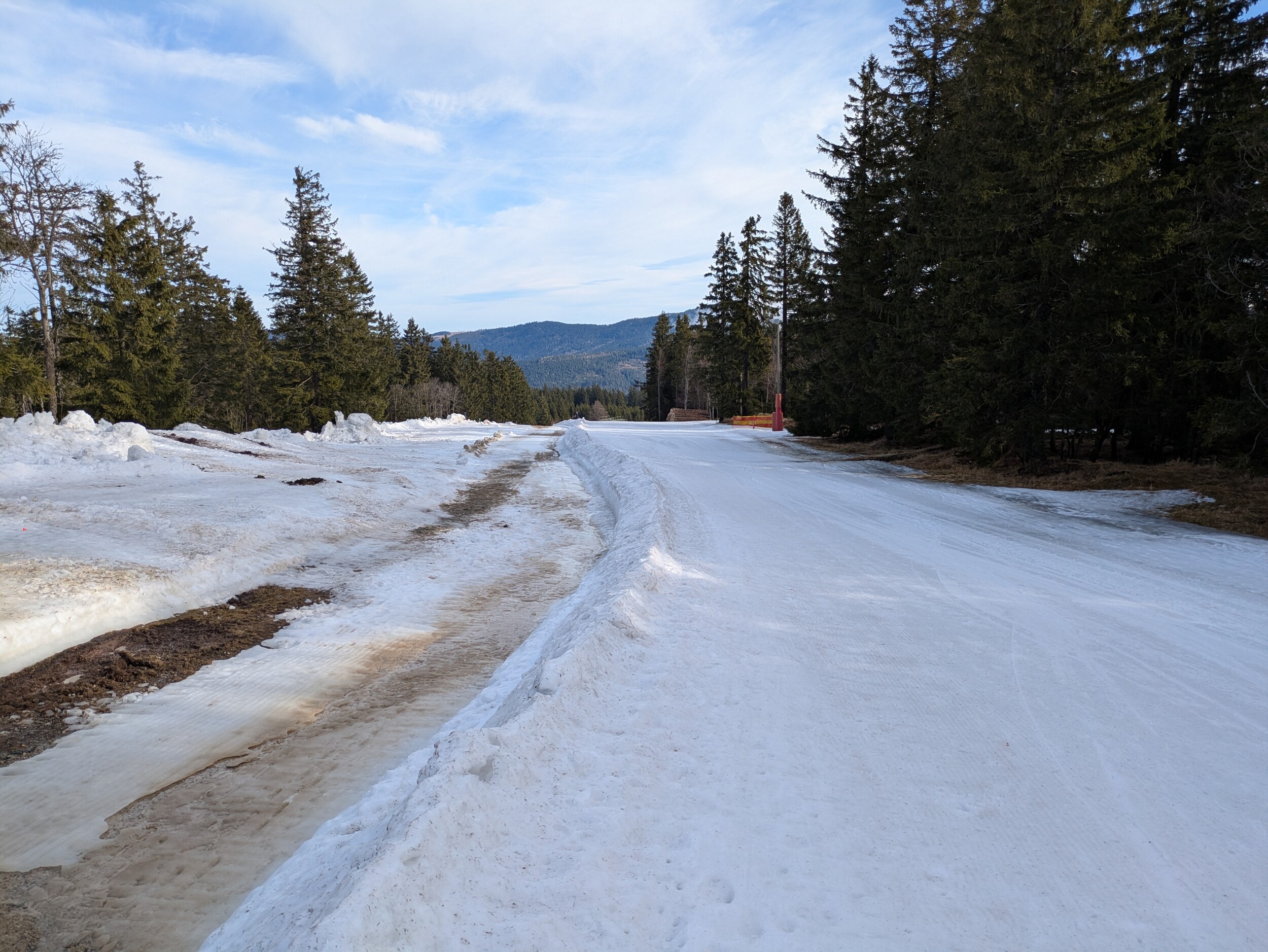 Vom Neuschnee der letzten Woche ist nicht mehr viel übrig geblieben. Es hat drei Tage ordentlich reingeregnet. Natürlich waren die Pisten in der Sonne schon ab Morgen relativ weich. Die Schneemengen auf den Pisten sind aber noch immer absolut ausreichend.