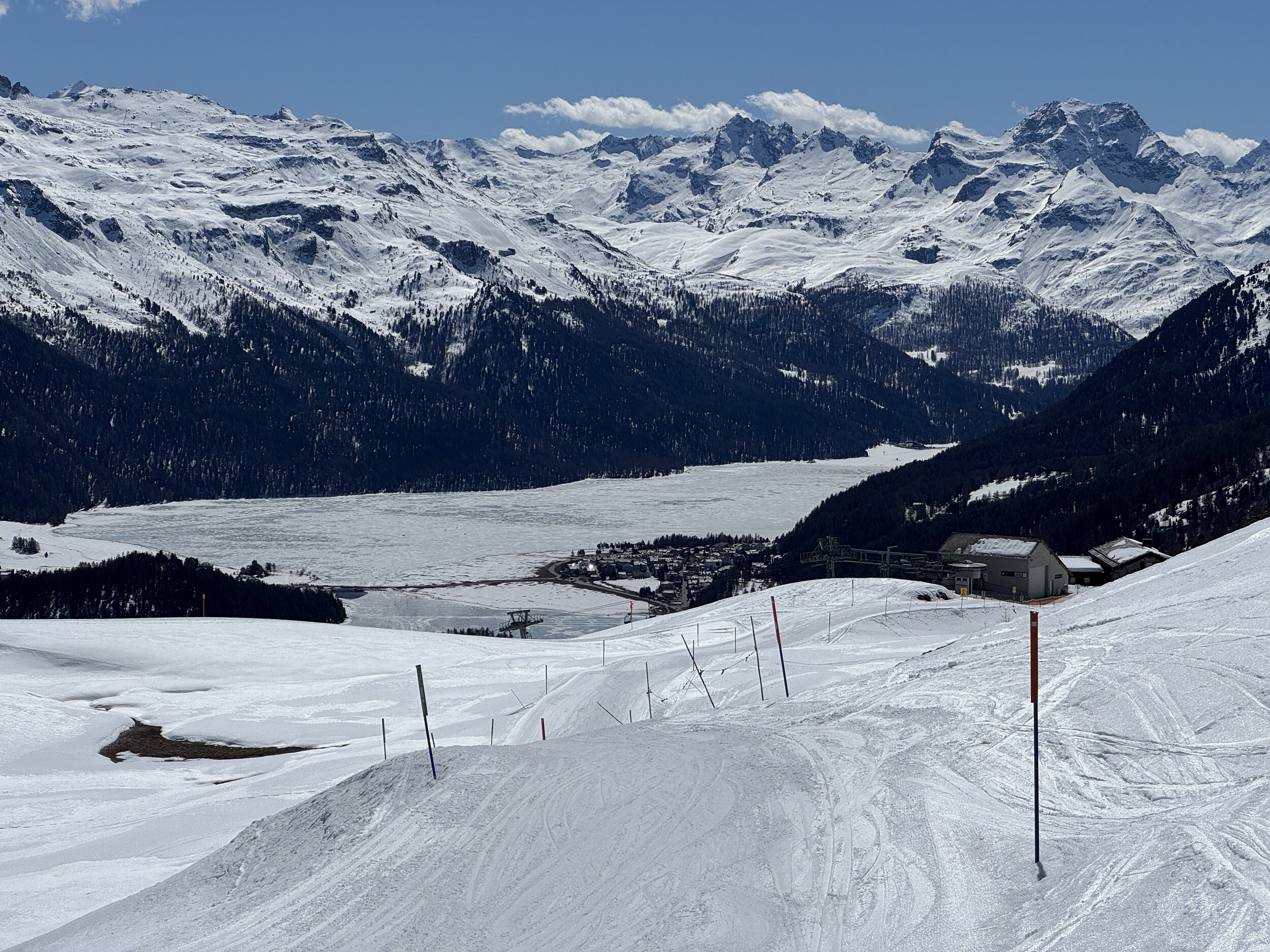 Deshalb halt zurück und dafür den Furtschellas-Teil noch erkunden Sogar die Talabfahrt war da morgen noch in einem sehr guten Zustand. Die rote von der Bergstation war oben gut, und weiter unten im engen Teil etwas ruppig und teilweise vereist. Am späteren Nachmittag habe ich dann noch zur Corviglia gewechselt. Die seeseitigen Pisten waren da wohl auch wegen der Tageszeit schon sehr weich und abgefahren.