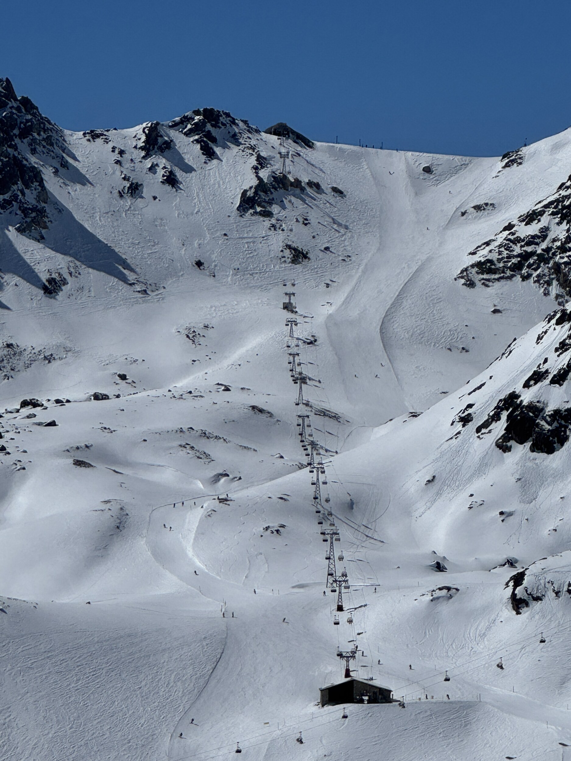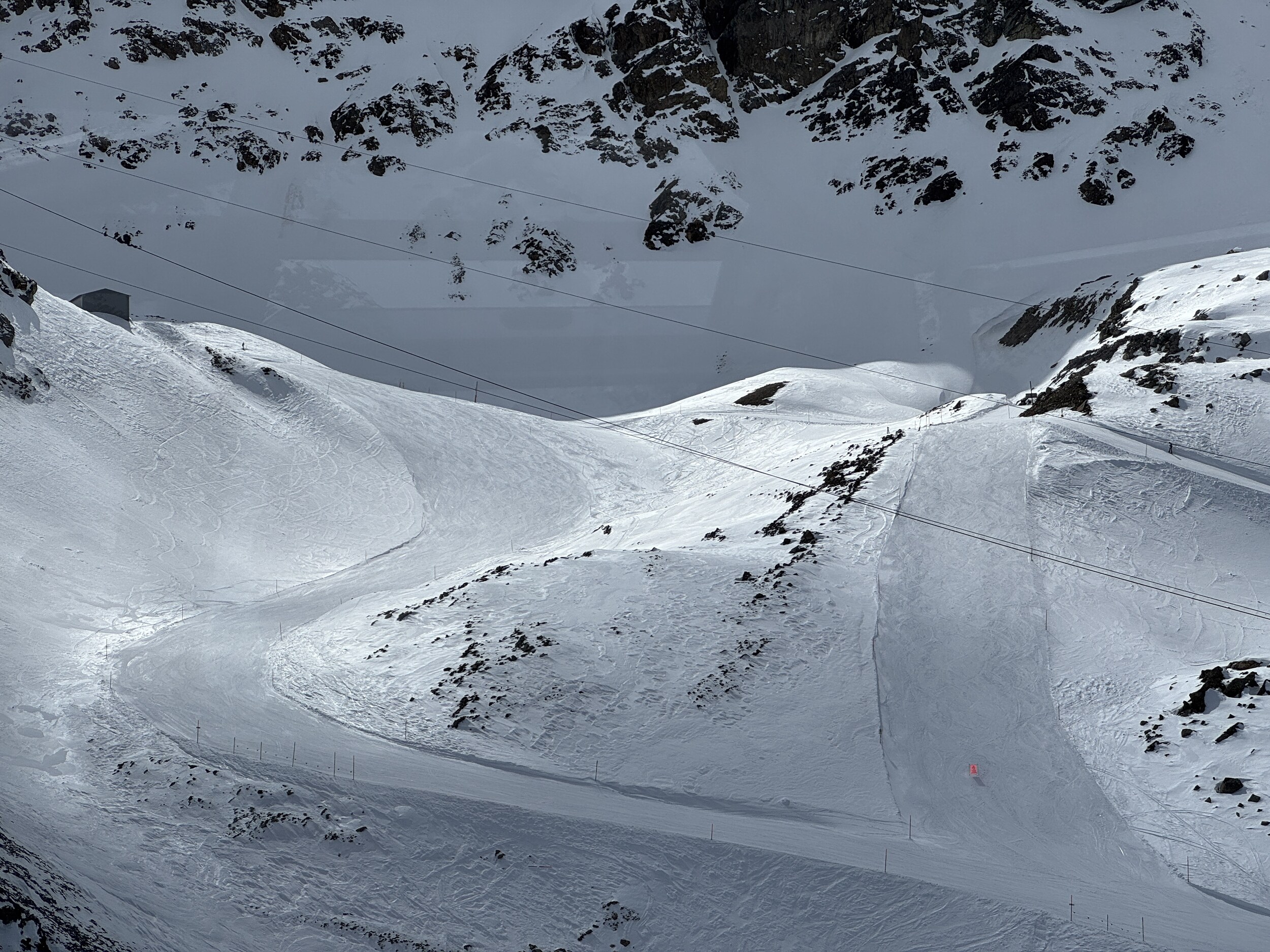 Die Gletscherabfahrt ist eigentlich geschlossen, angeblich wegen Schneemangel. Aber nachdem ich im Tal massenweise Tourengeher sehe, wage ich sie.