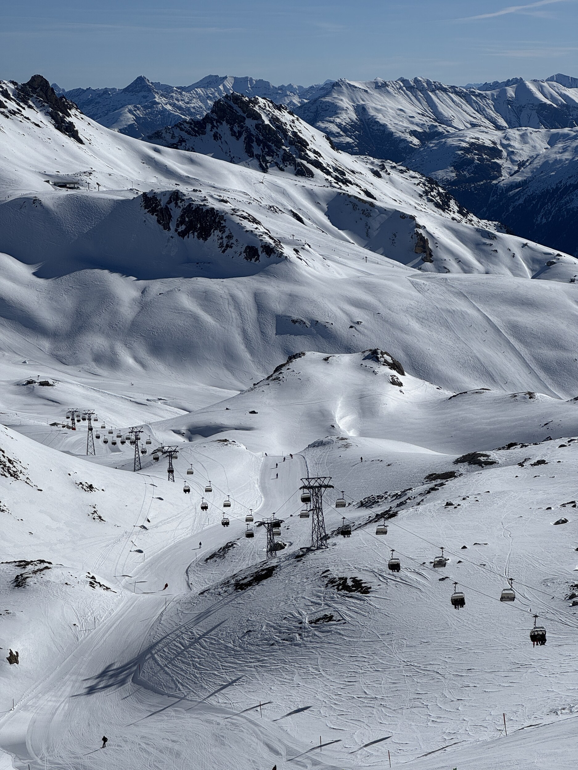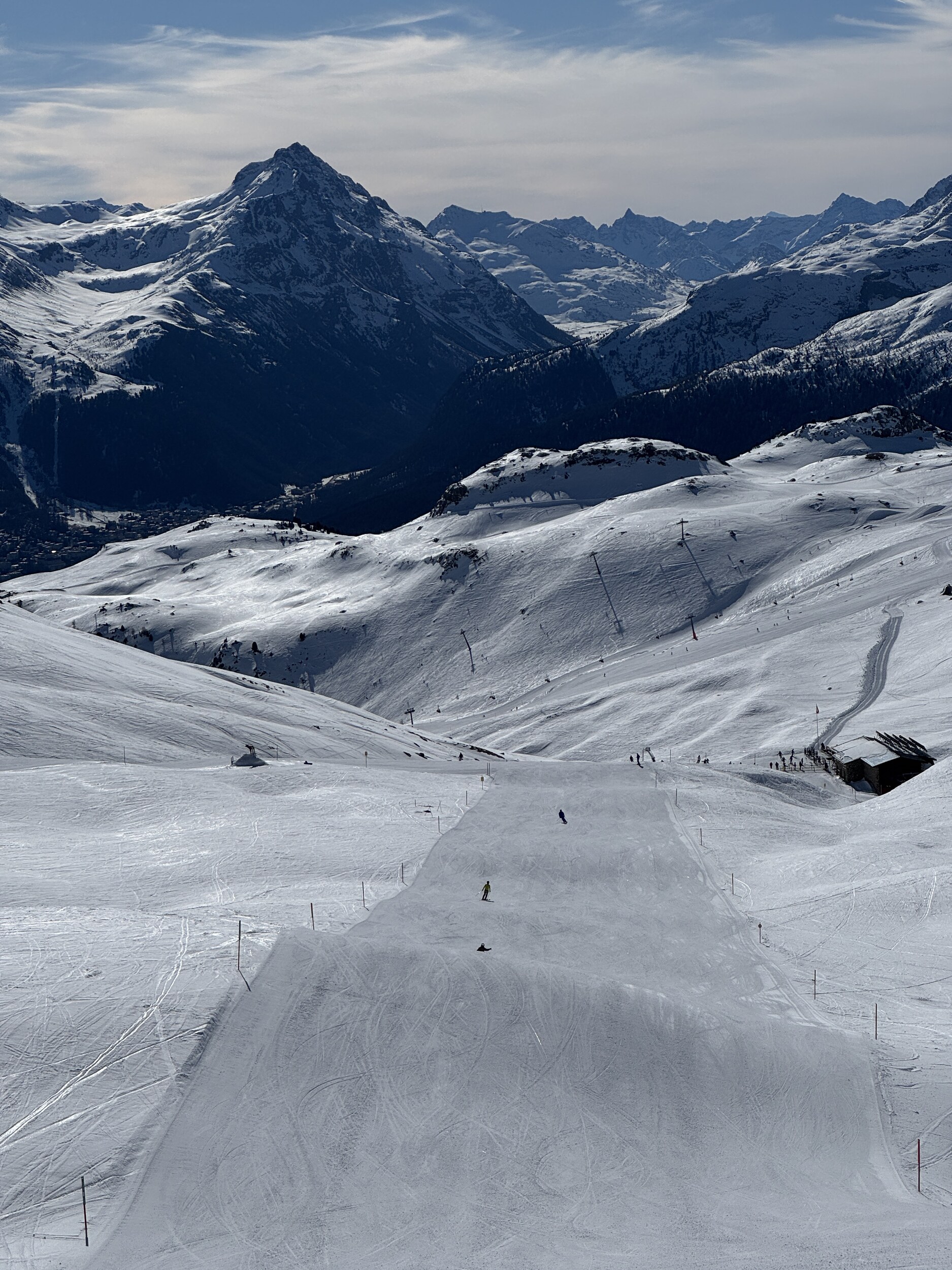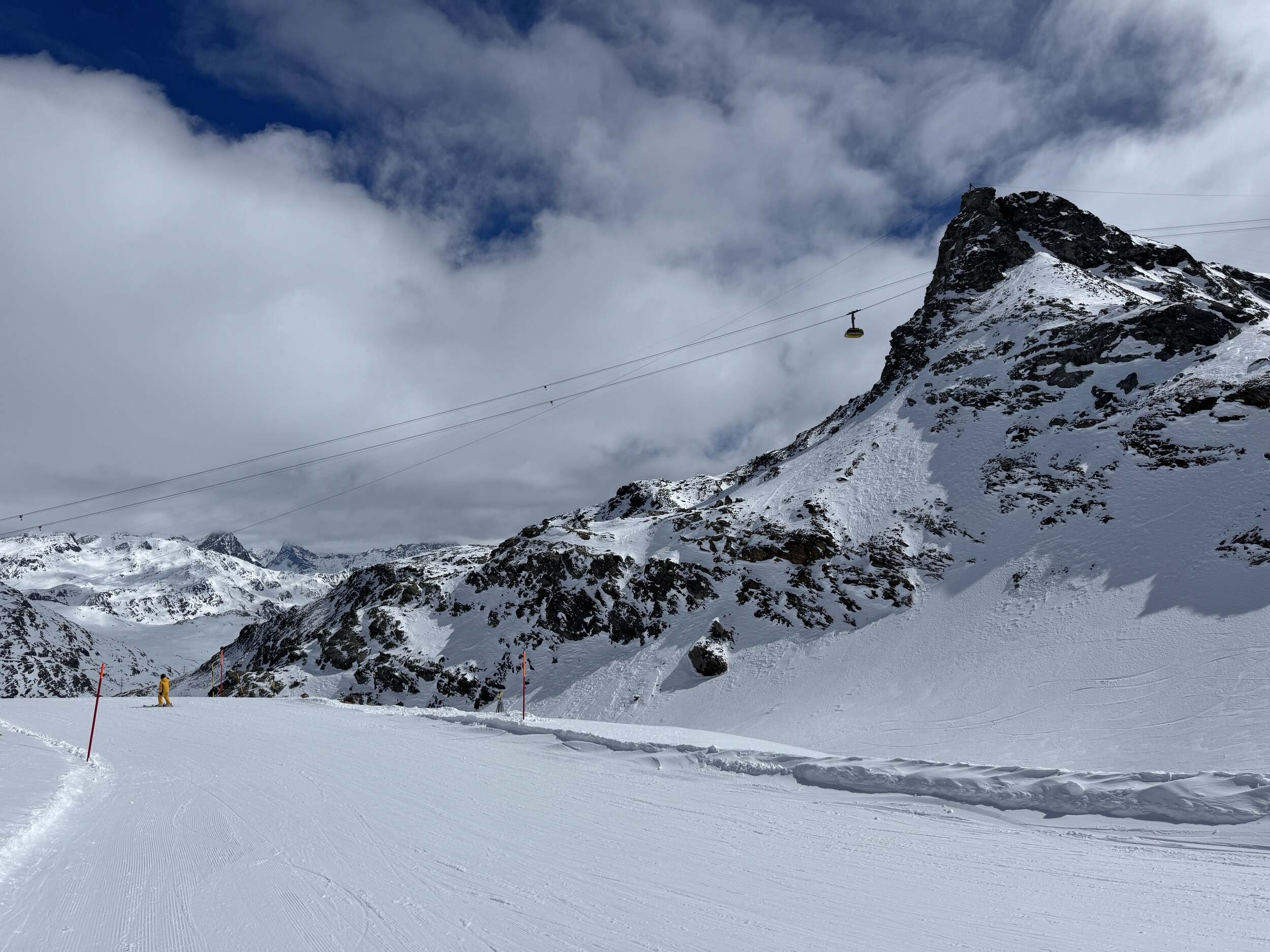 Am Park 4er hatte es jeweils am ehesten noch eine Schlange, und ich bin jeweils direkt weiter zum Giand'Alva. Wenn man rechts neben der Piste den Spuren folgte, klappte das auch ohne Stockeinsatz.