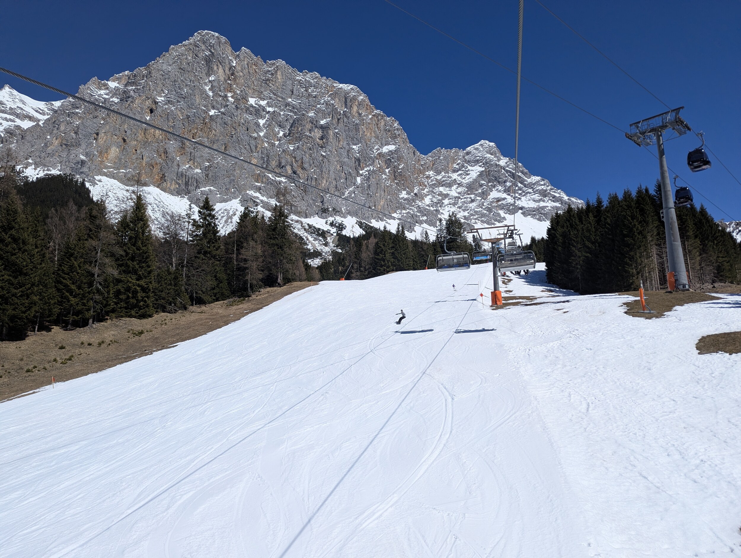 seit 12 Uhr an der Ehrwalder Alm, es herrscht noch Vollbetrieb, offen ist noch bis Sonntag. Los ist wir erwartet nichts, außer auf den Hütten. Die Pisten oben sollten alle bis Saisonende halten, Talabfahrt war ich noch nicht.