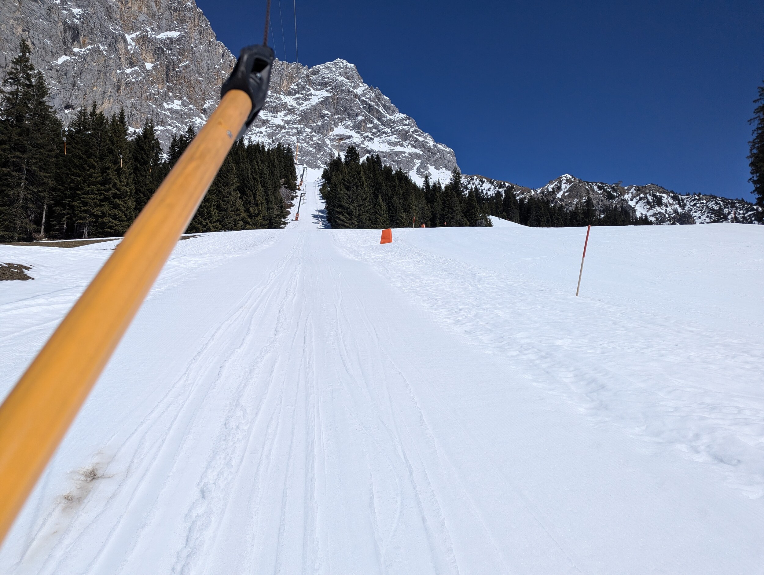 Die Schneelage war an der Wettersteinbahn nochmals prekärer als in Biberwier. Zum Teil kommt der Untergrund hervor, der insbesondere an der Sonnenhangbahn mit Netzen abgesperrt wird. Die Präparierung am Morgen wird an der Wettersteinbahn wohl ähnlich ruppig gewesen sein, wie in Biberwier, jedoch hatte man hier vor allem auf den Verbindungswegen oder an neuralgischen Punkten eher mit Bremsschnee und Sulz zu kämpfen, als mit Löchern.