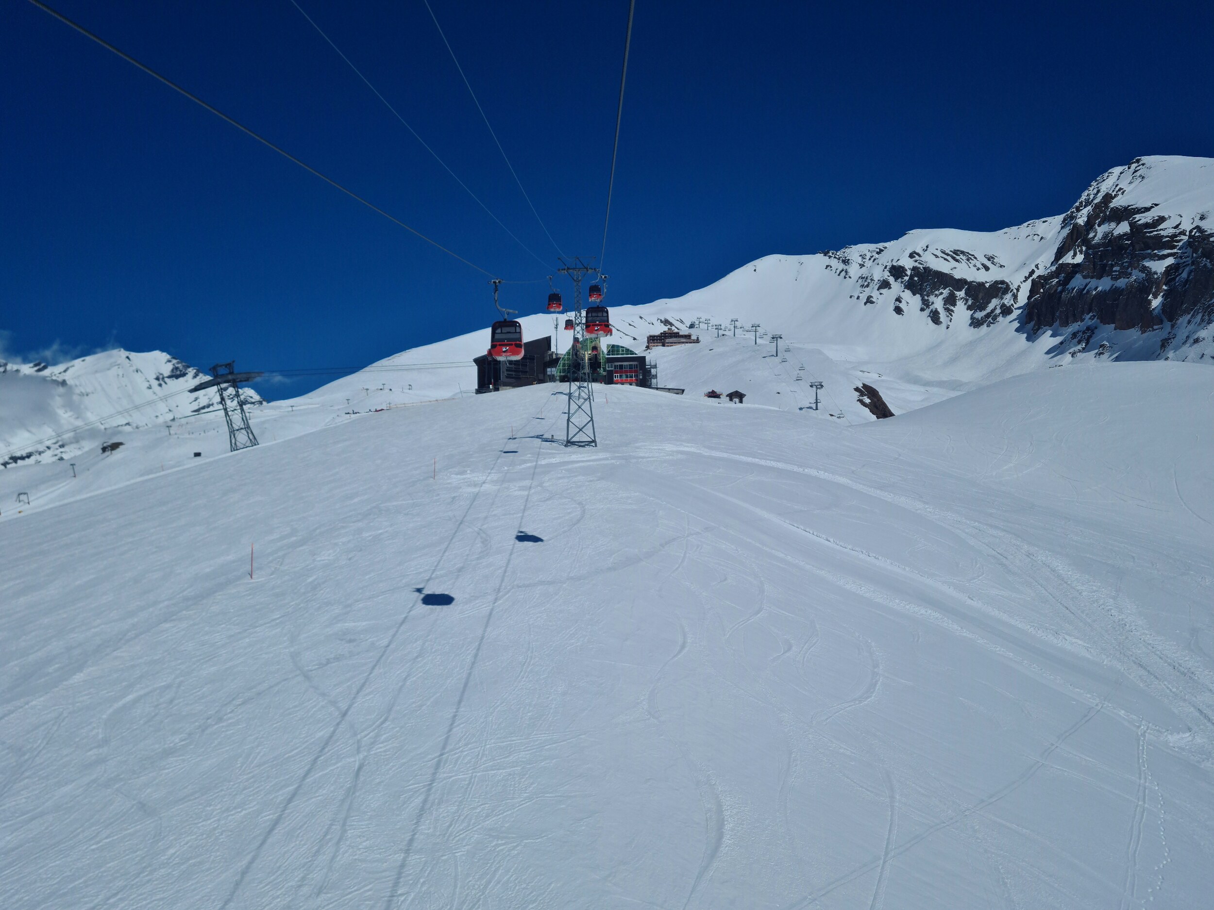 Am Samstag war mein Erstbesuch in Leukerbad. Leider erst ab Mittag und somit erst ab dem warm-sulzigen Schnee, dennoch war es überraschend gut. Die Abfahrten an der 6EUB haben bis unten genug Schnee, die Talabfahrt an der PB hat bereits eine recht braune Stelle im unteren Drittel und ist direkt vor der Kabinenbahn kurzzeitig extrem schmal. Im oberen Gebietsbereich ist die Schneelage sowieso top. Und auch sonst gefällt mir das Gebiet gut: Die eher leistungsfähigeren Bahnen (EUB und KSB) erschließen jeweils viele Abfahrten, wodurch selbige nicht zu voll werden. Schön ist natürlich auch, dass hier die letzte je gebaute VonRoll-EUB mit der wunderbaren Stationsmechanik ihre Runden dreht.