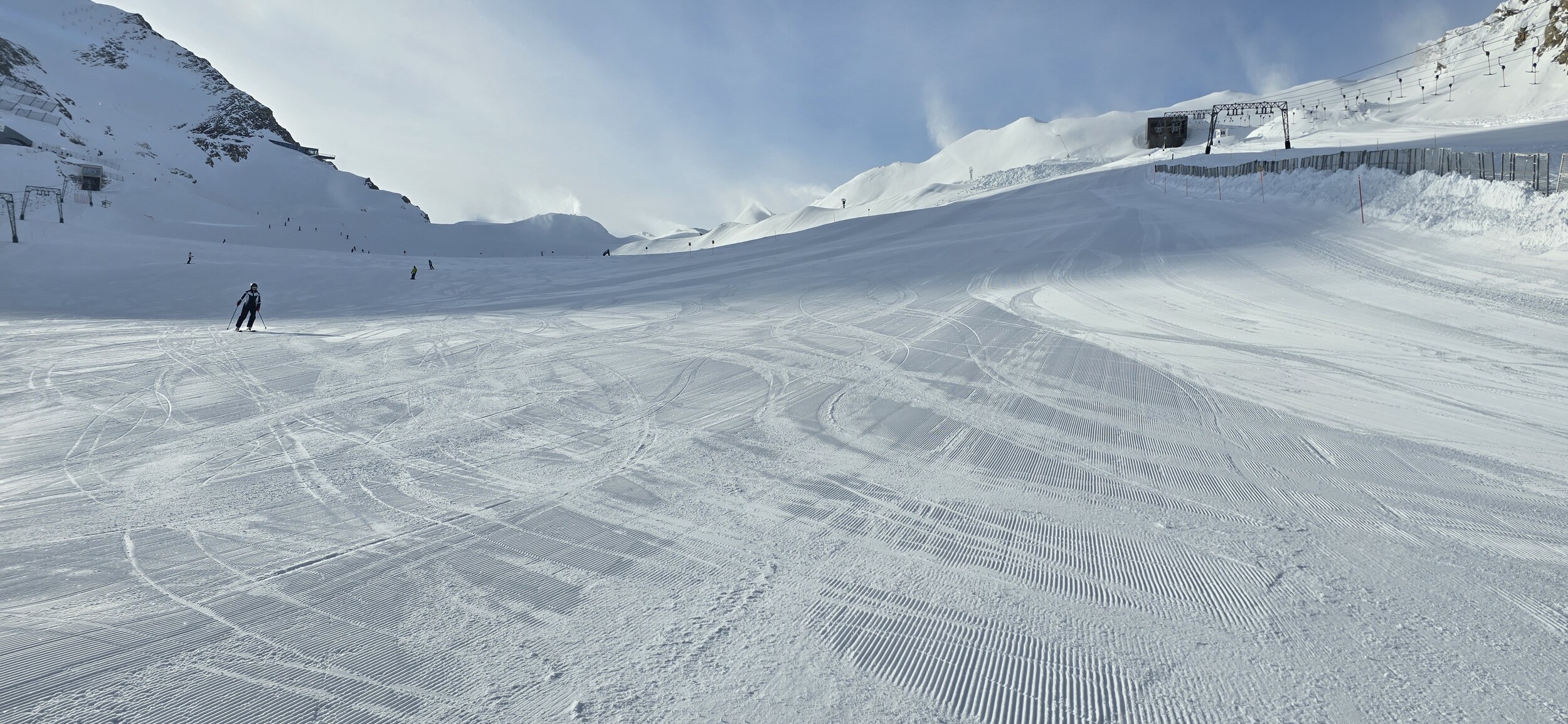 Gute Beschneiungserfolge am oberen Gletscherrand, es ist ein regelrechtes Plateau entstanden: