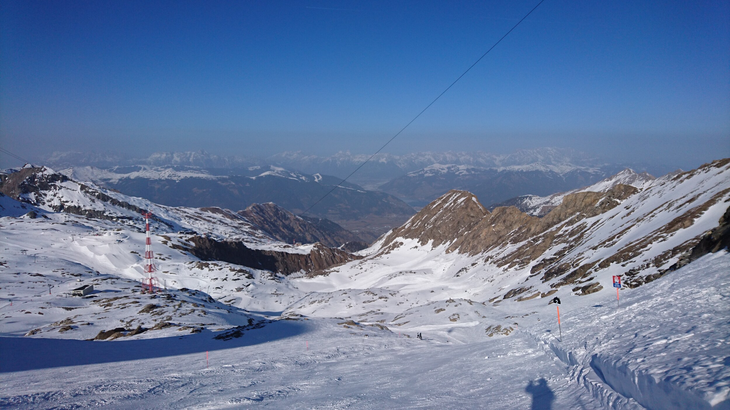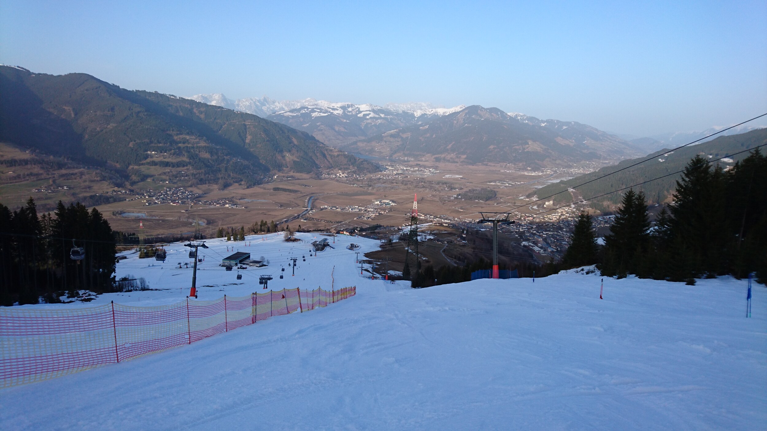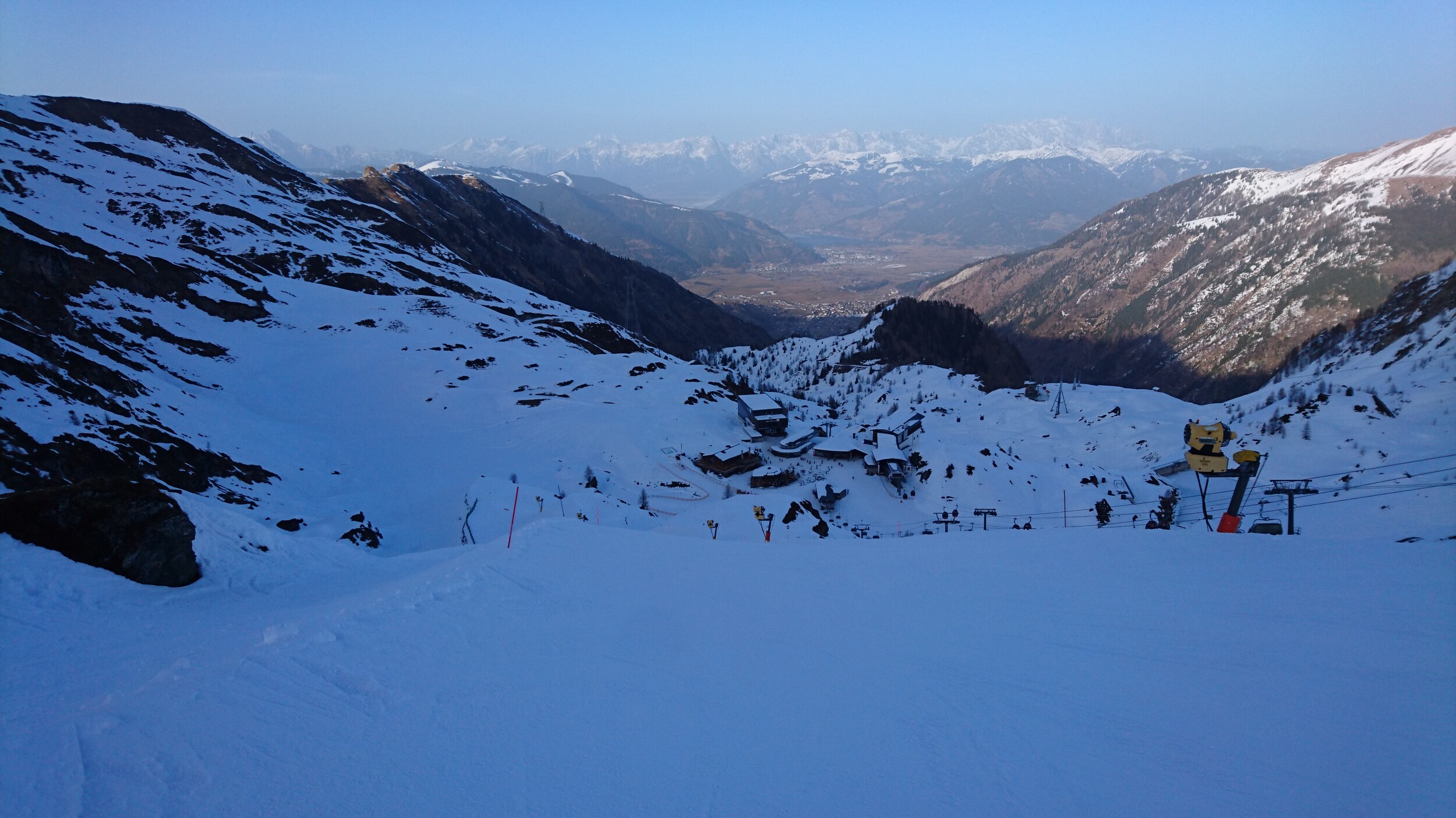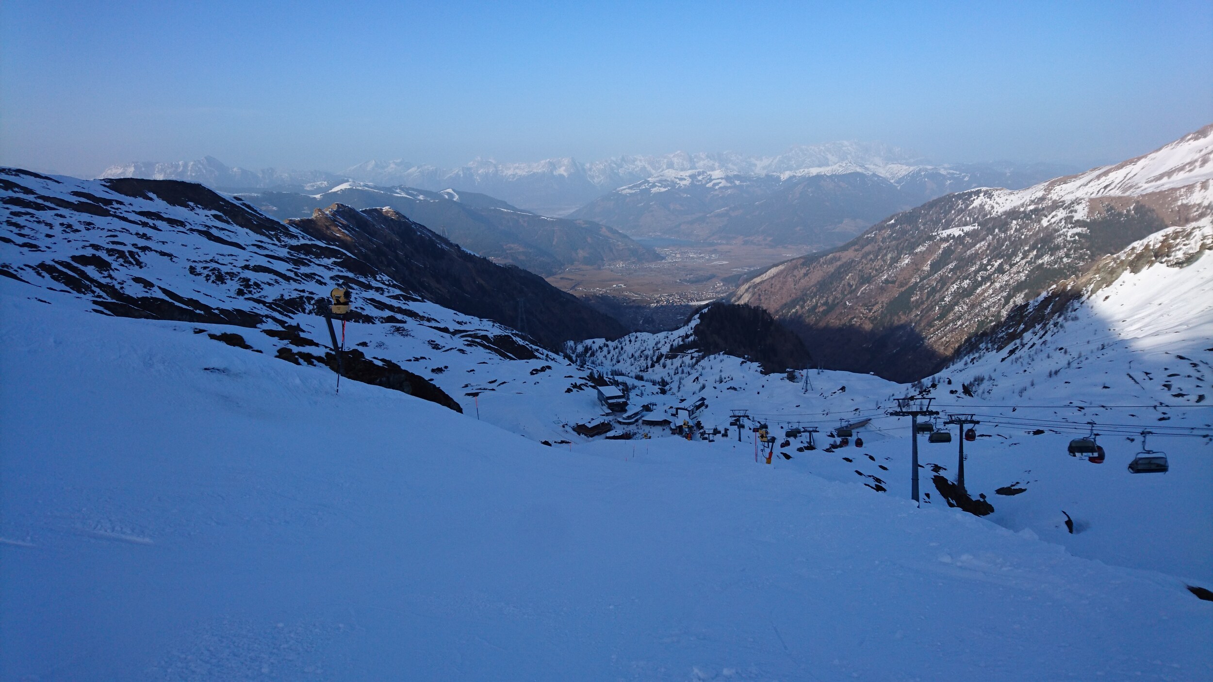 und selbst die Pendelbahn ist gestern gefahren.. Blick von oben Richtung Grossvenediger im leichten Saharadunst Abends sind sogar ein paar Holländer zu Fuss die Piste herunter gekommen... Dann abends sogar 2 Mal noch die Black Mamba für uns alleine.. Unten am Maiskogel hat man dann einen Eindruck bekommen wie es zum Beispiel an der Schmitten oder in Saalbach an vielen Pisten ausgeschaut hat...