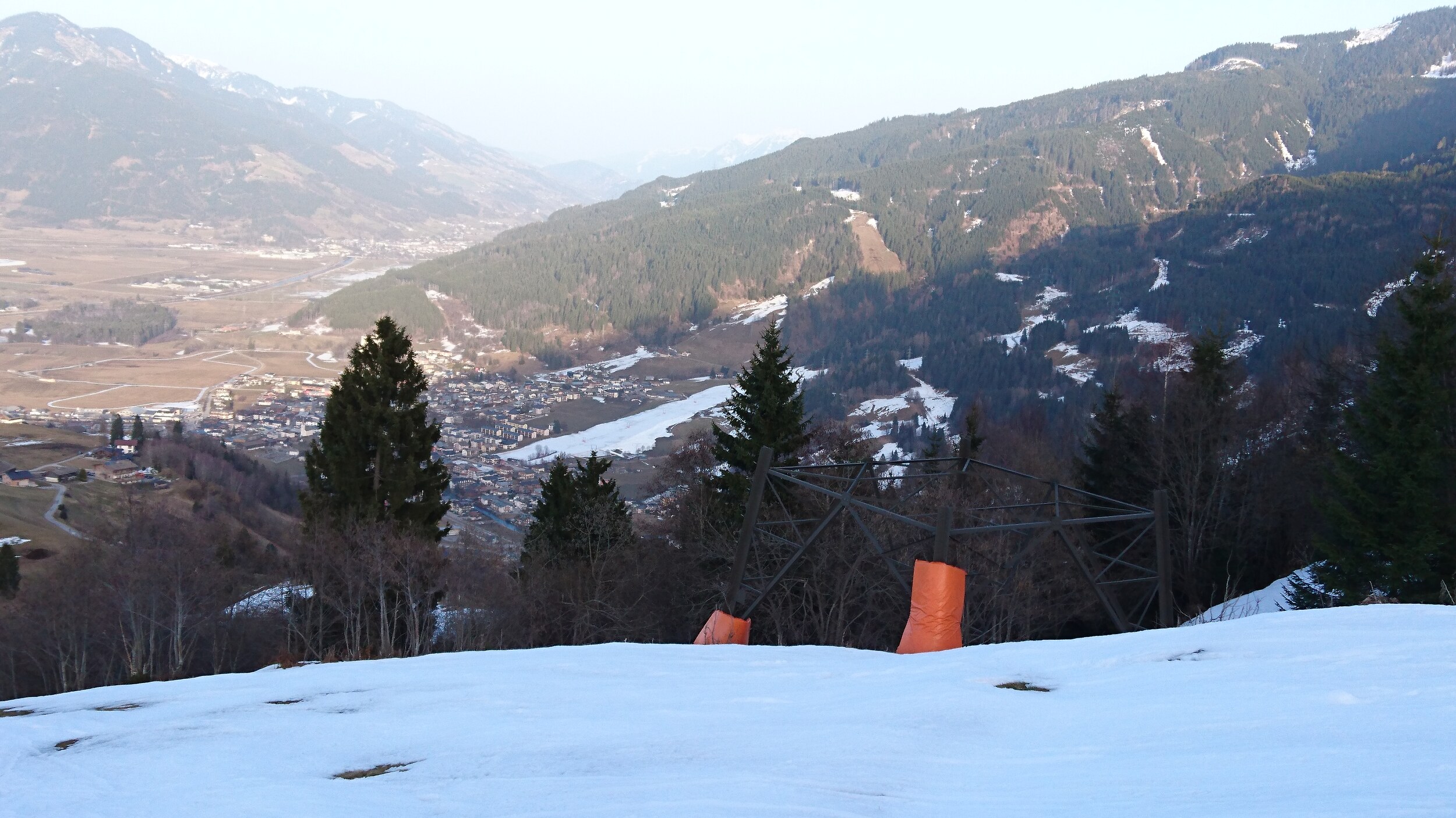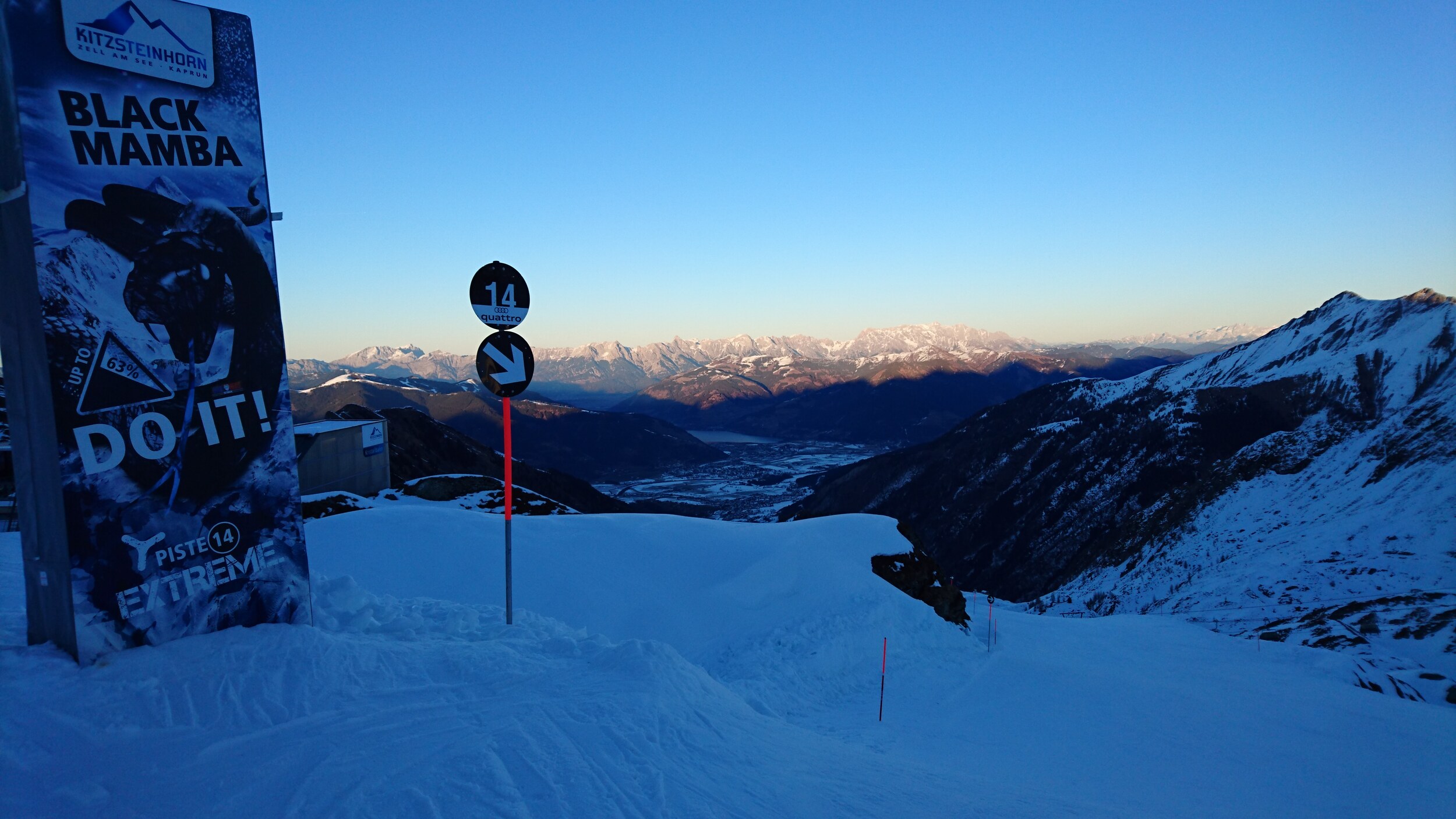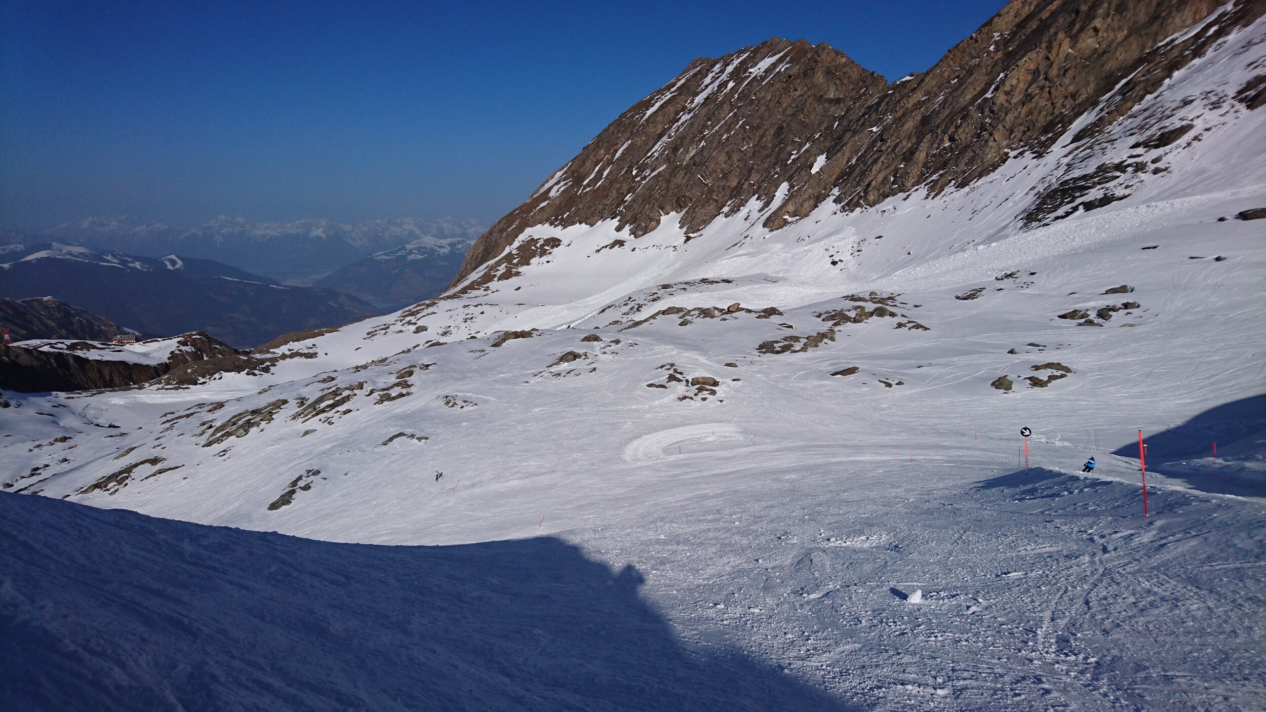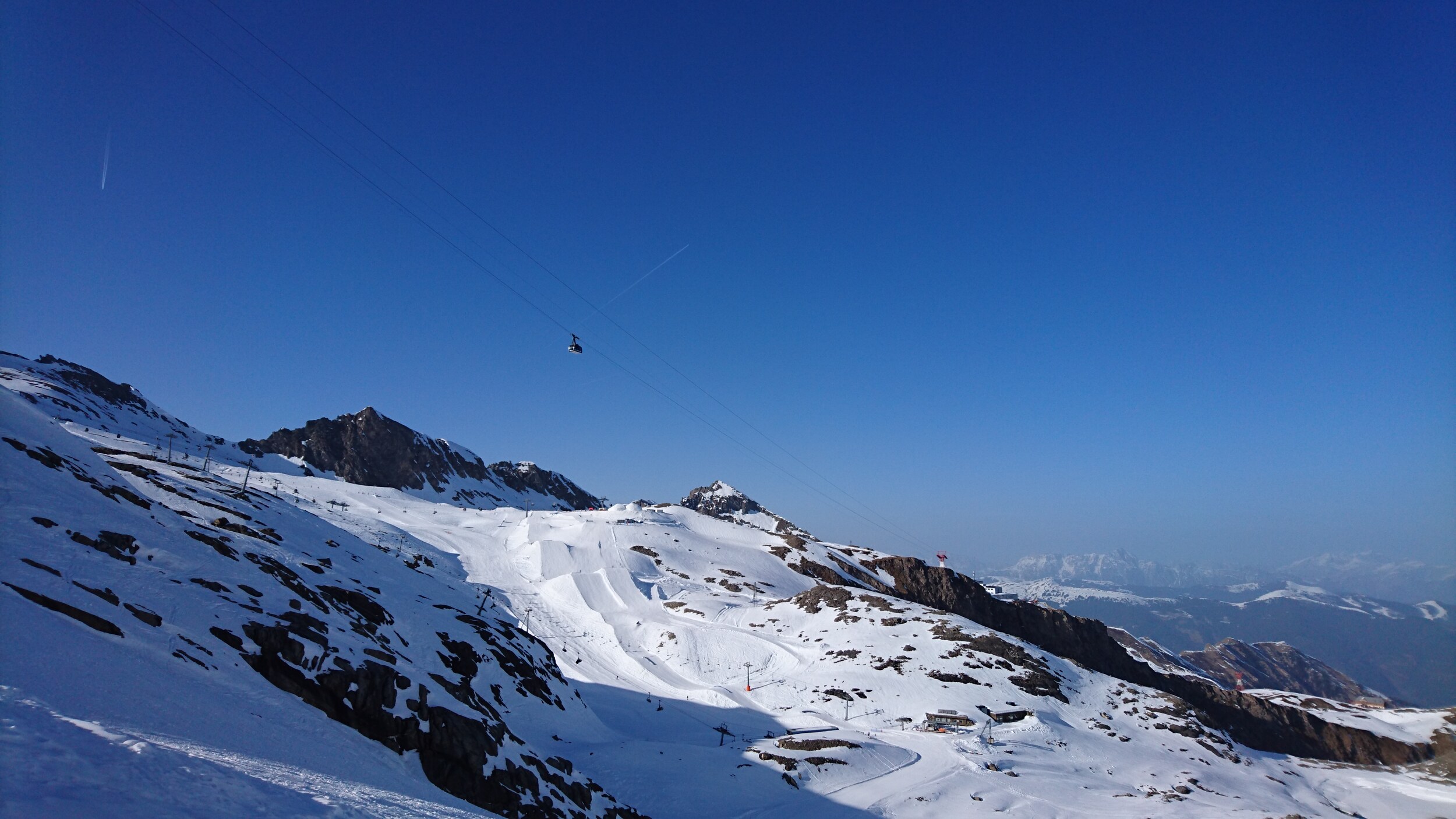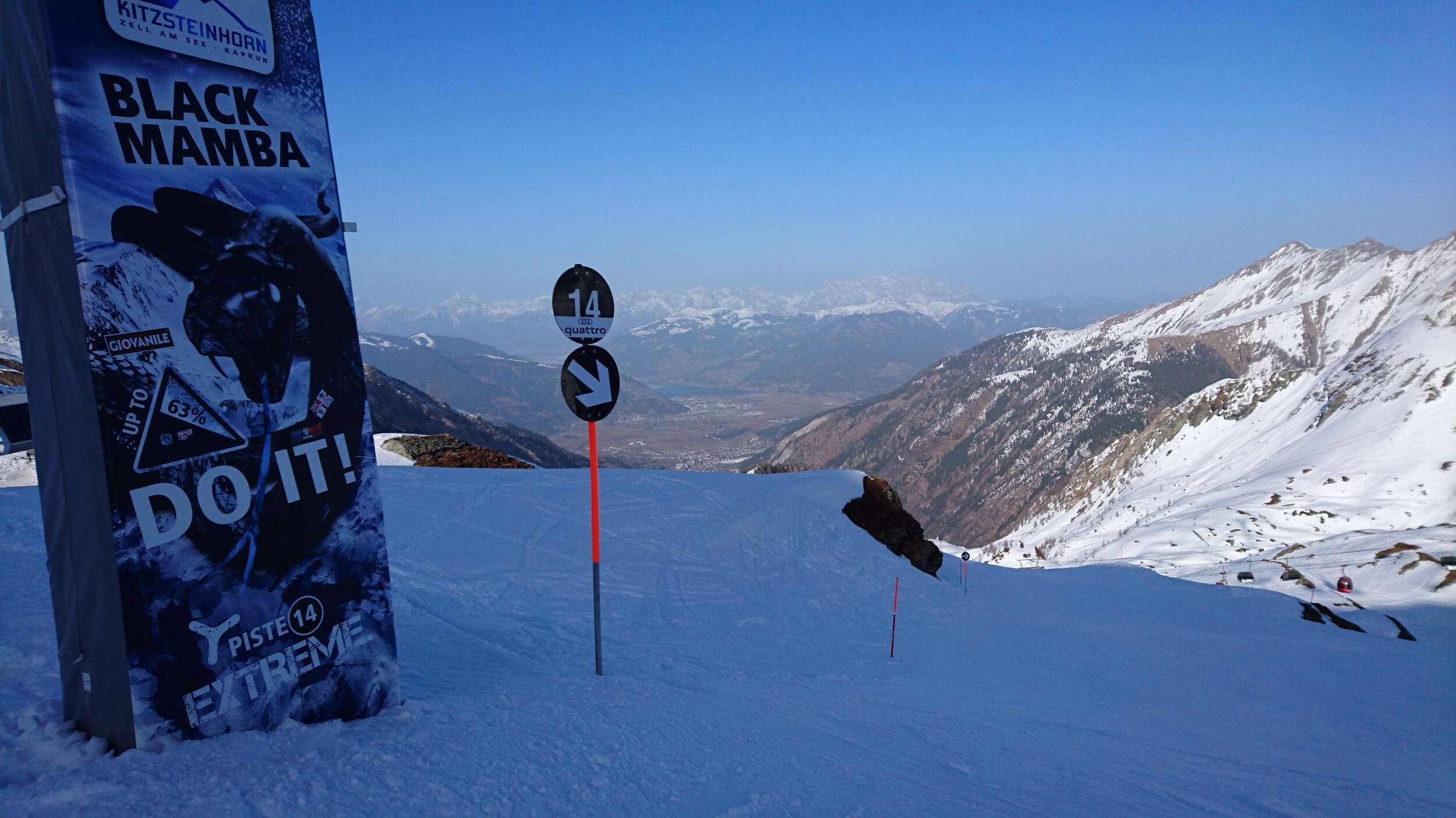 und selbst die Pendelbahn ist gestern gefahren.. Blick von oben Richtung Grossvenediger im leichten Saharadunst Abends sind sogar ein paar Holländer zu Fuss die Piste herunter gekommen... Dann abends sogar 2 Mal noch die Black Mamba für uns alleine.. Unten am Maiskogel hat man dann einen Eindruck bekommen wie es zum Beispiel an der Schmitten oder in Saalbach an vielen Pisten ausgeschaut hat...