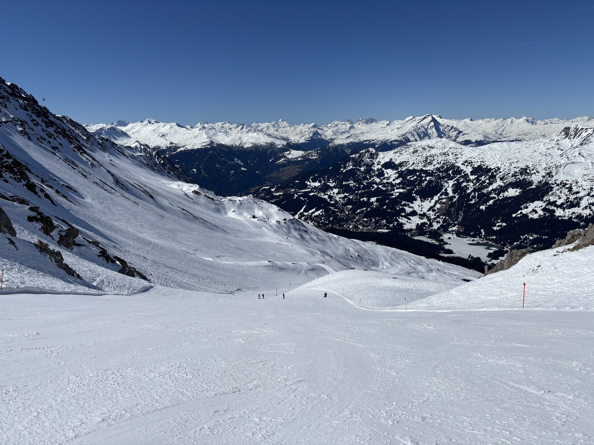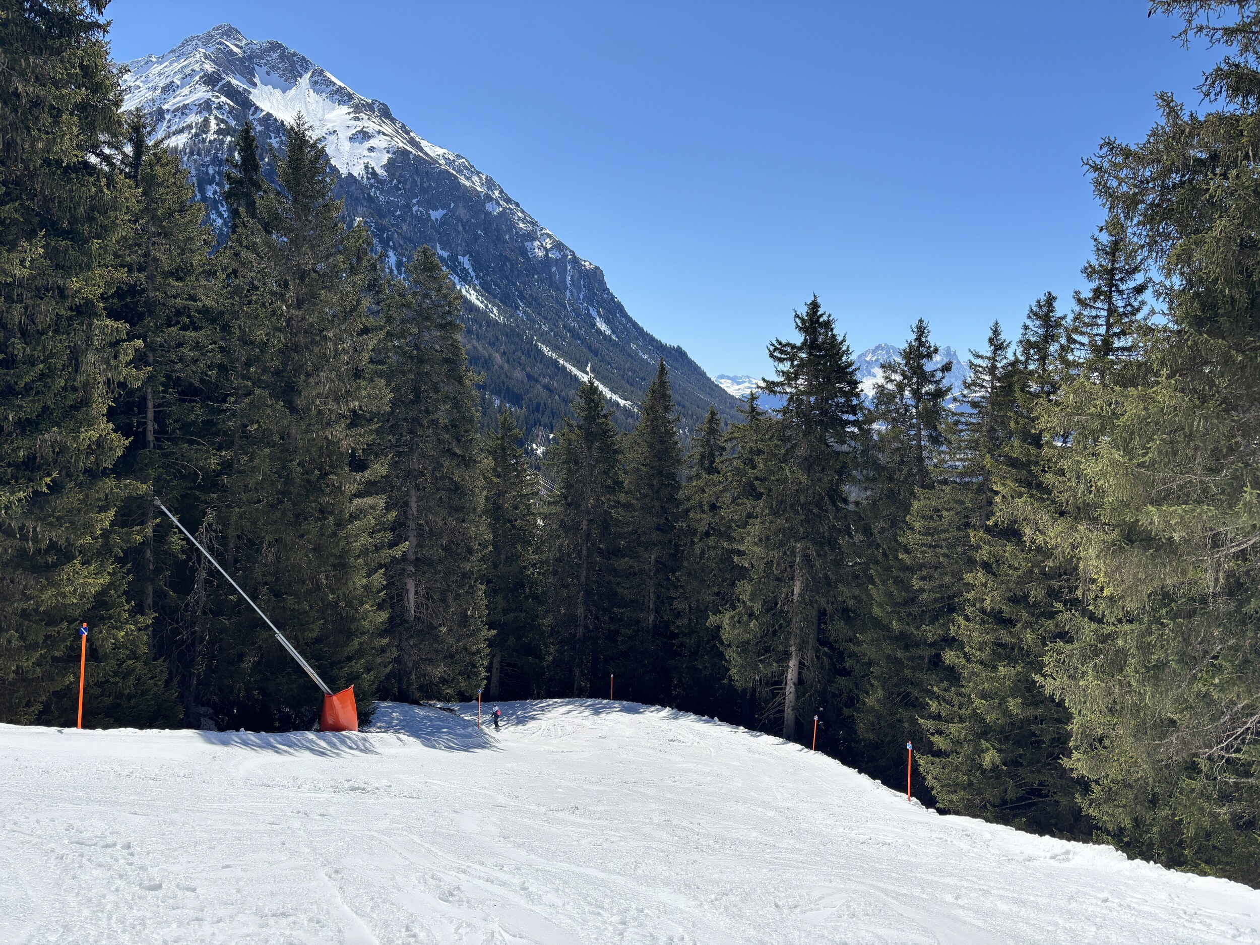 Nach dem Essen machten wir eine frühe Talabfahrt auf einer sulzigen und zerfahrenen Piste, die dennoch Spass machte, da sich der Schnee butterweich zur Seite schieben liess.