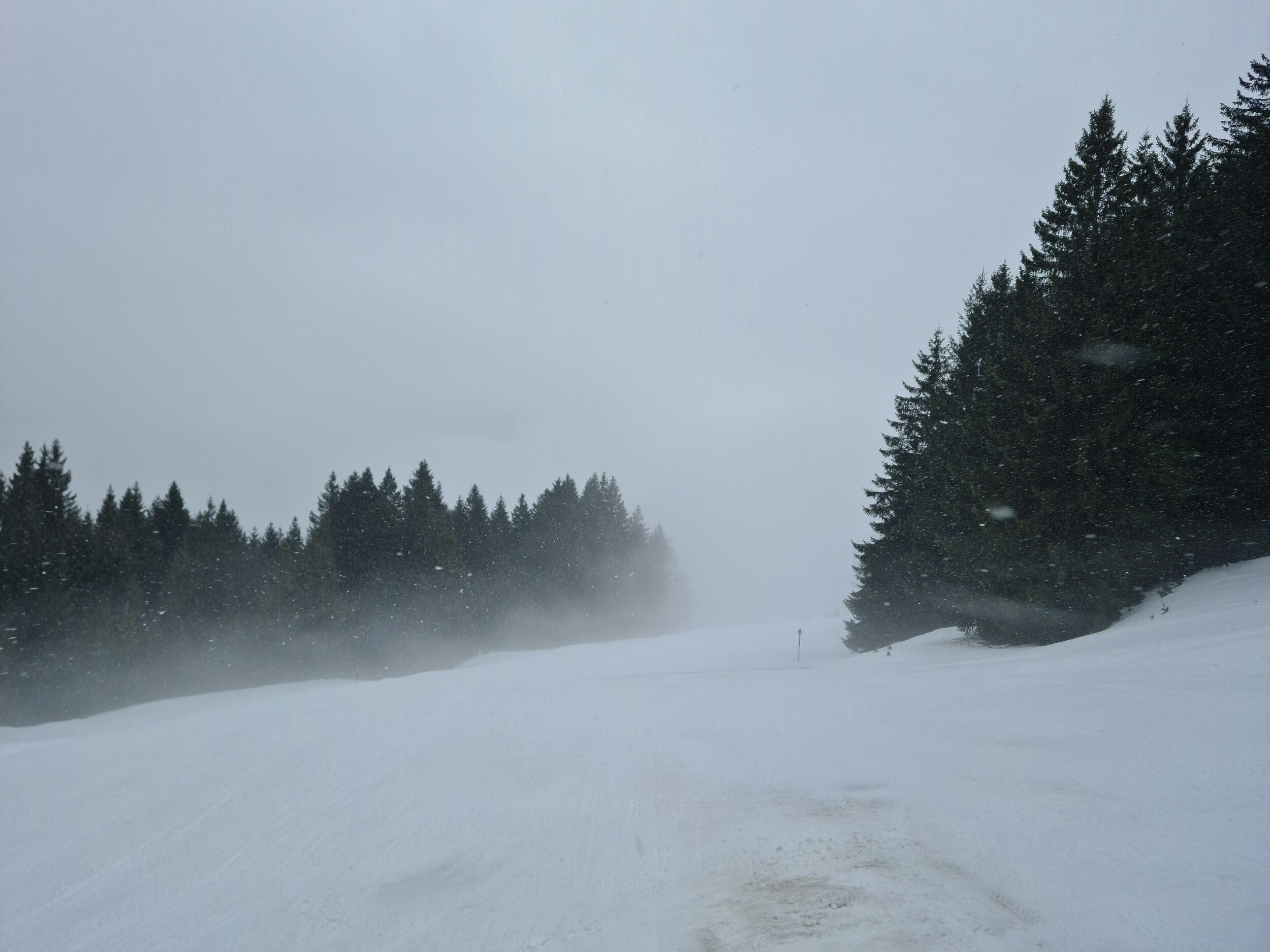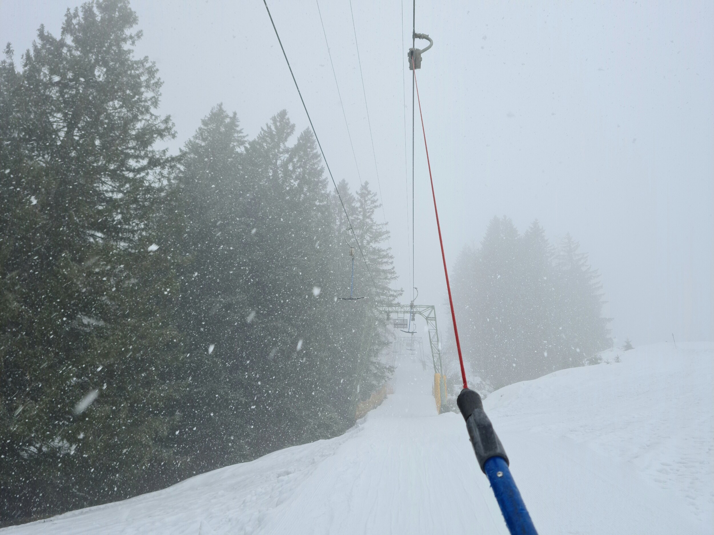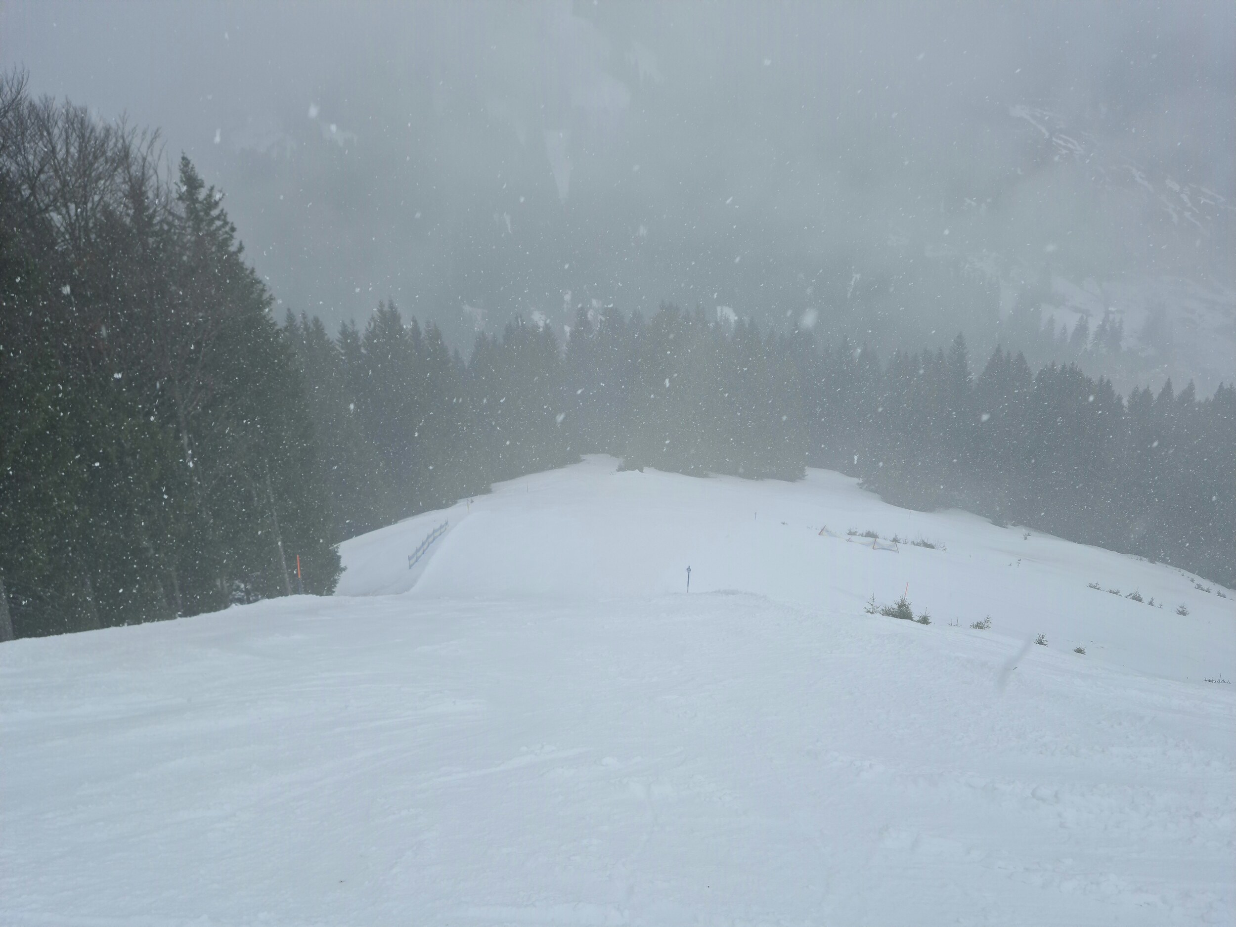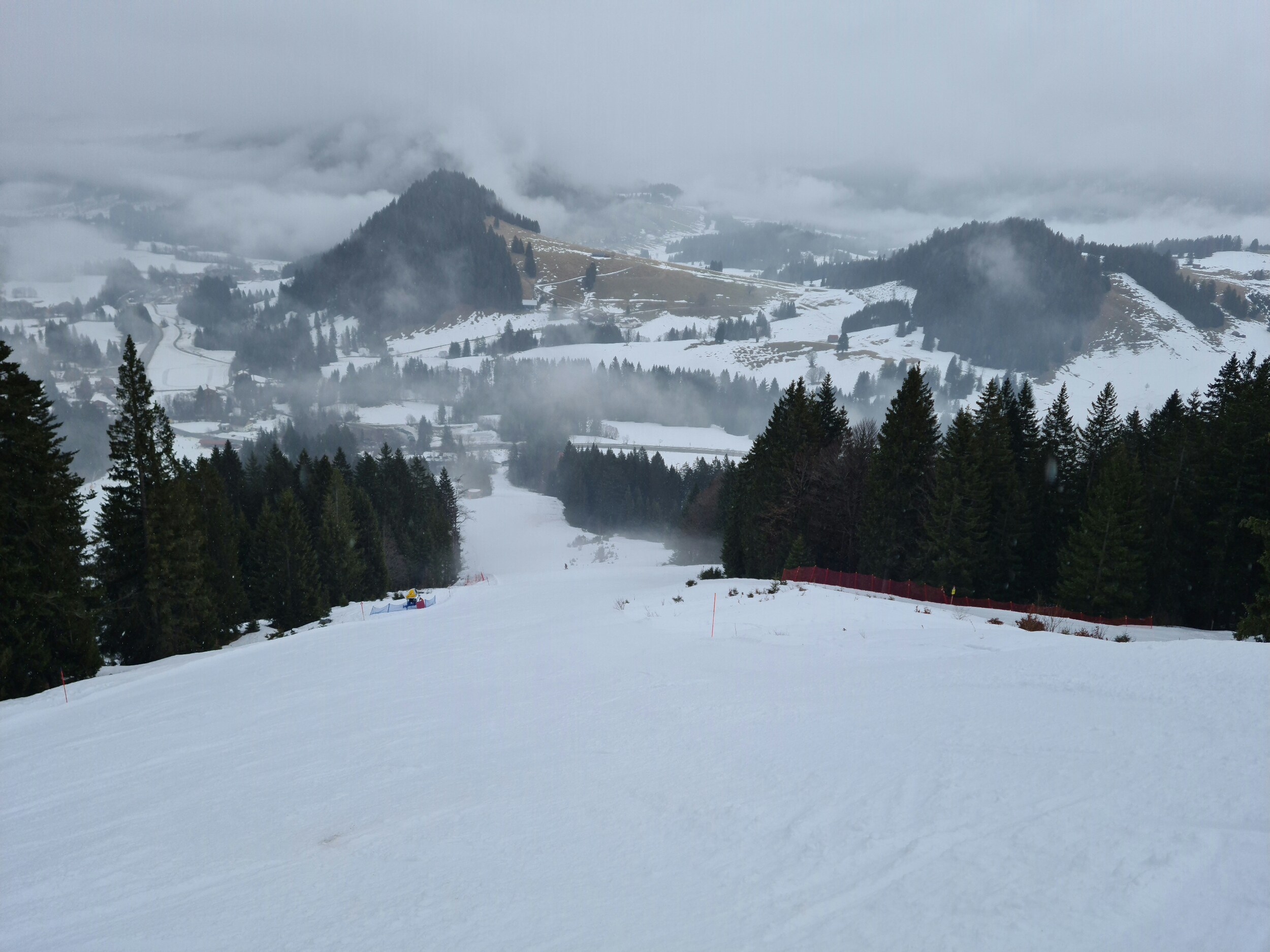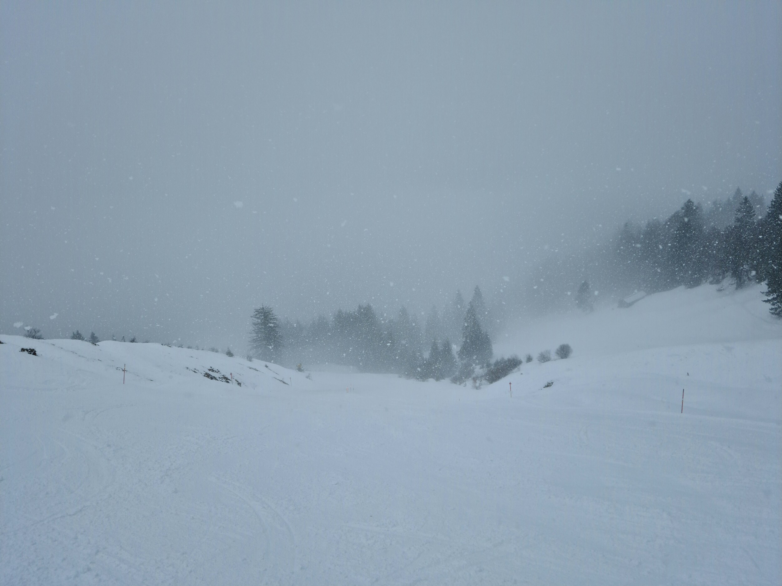 Der Schnee kommt nun kräftig bis zur Talstation. Und leider ist es nun auch recht neblig. Schade, ich hatte gehofft, dass es sich noch mindestens bis 13 Uhr hält. #5- Die blaue Piste (dieser Hang kann auch umfahren werden), das war auch die erste Nebelabfahrt. #6- Weiter unten. #7- Nach einer kurzen Pause dann eine Liftfahrt im Nebel. #8- Ganz oben war kein Nebel, sondern nur dichter Schneefall. Dennoch wurde das meine letzte Fahrt.