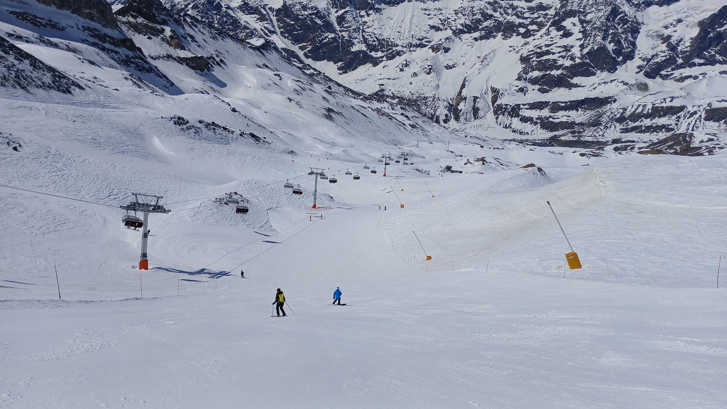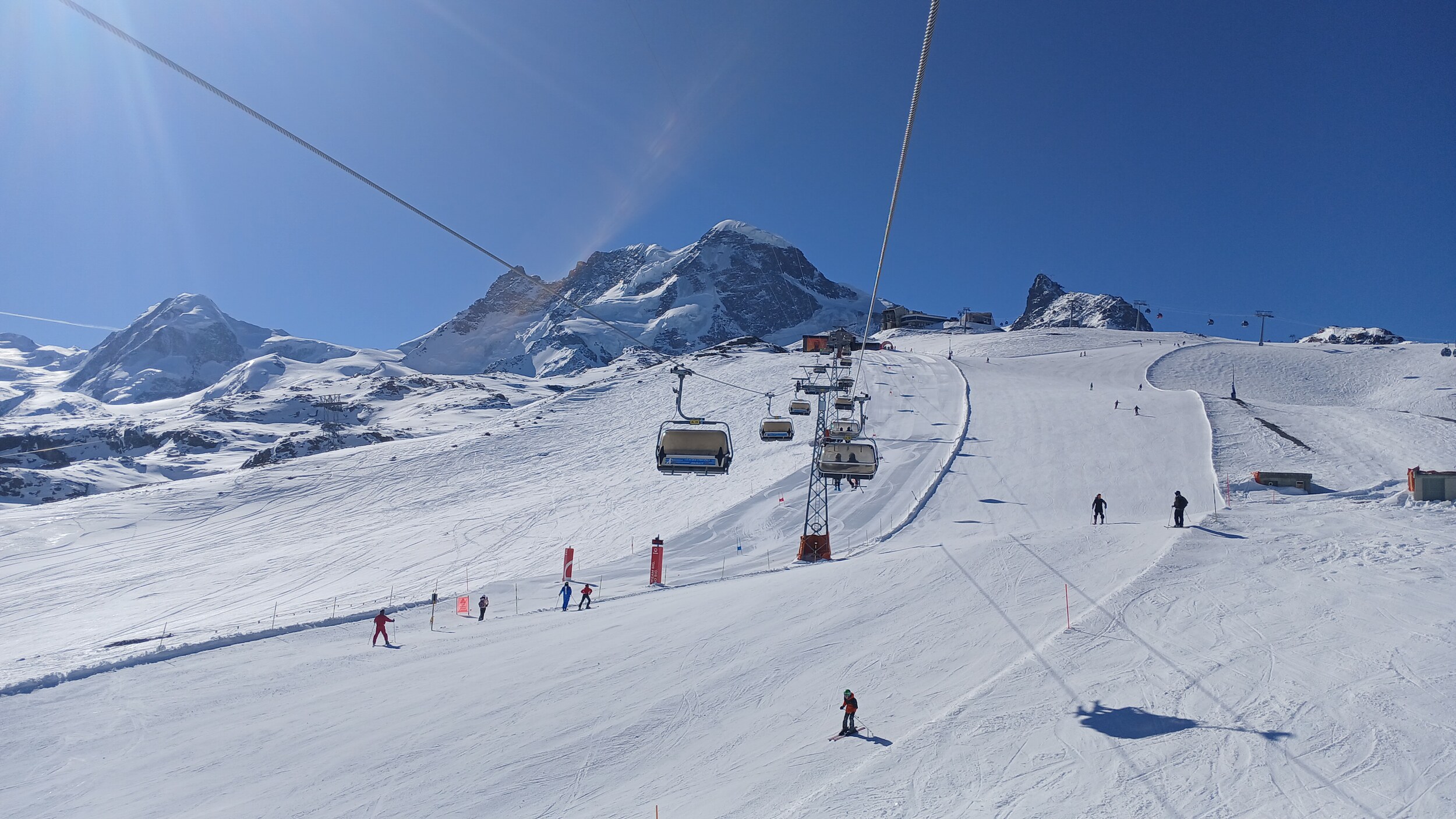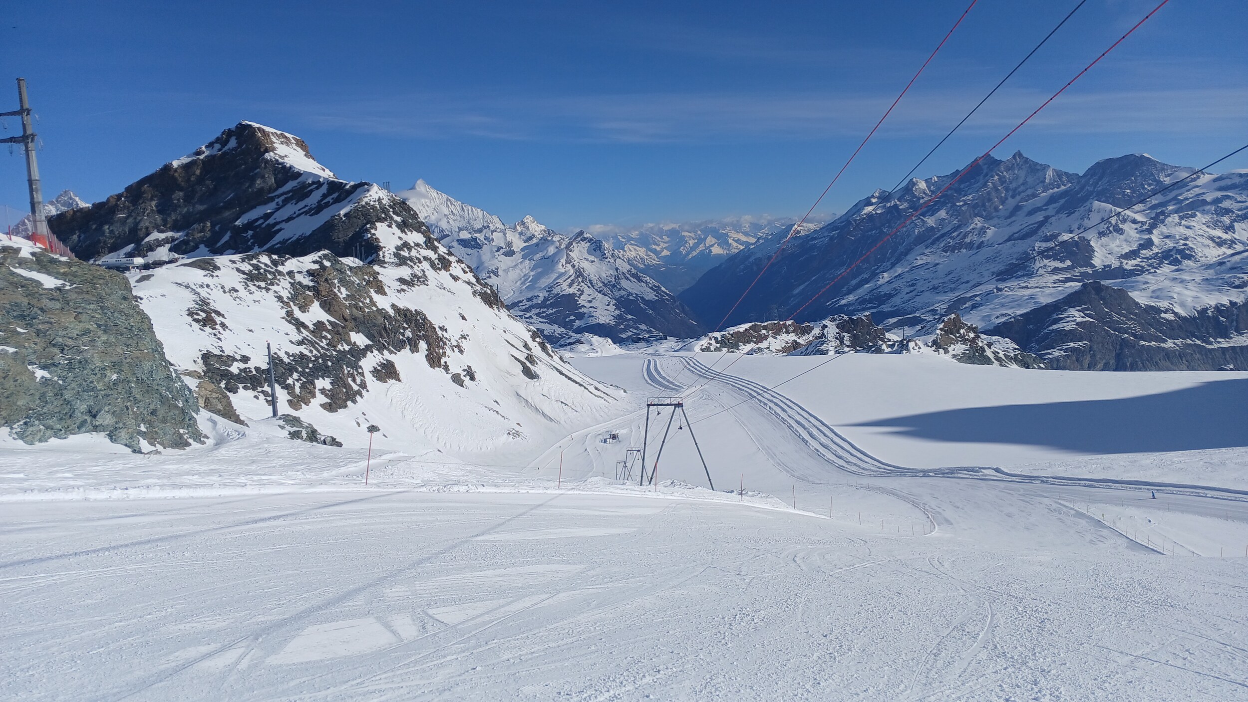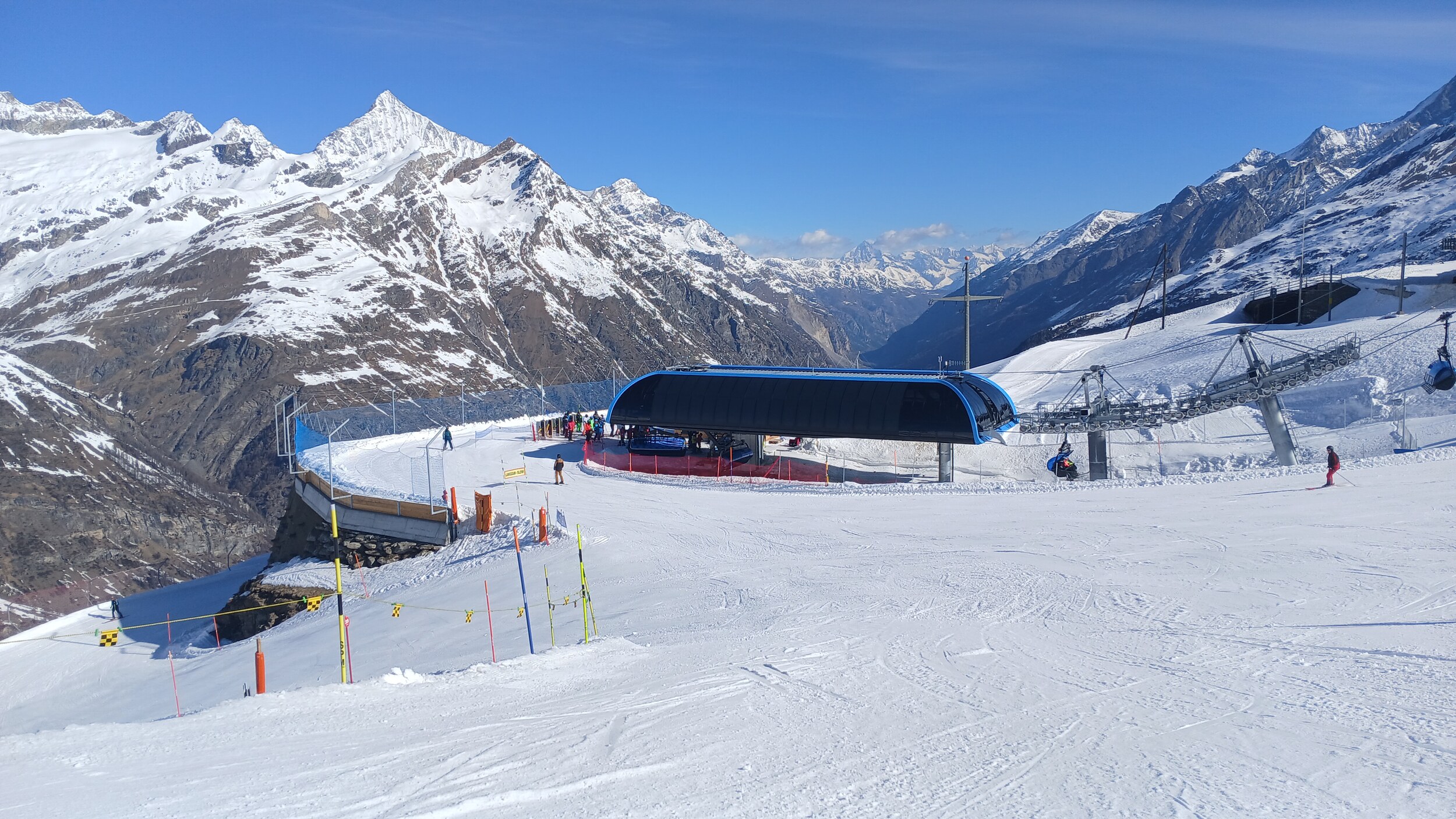 Die Pisten hier sind aber recht flach. Der Sommerskibetrieb dürfte eher langweilig sein und ich würde behaupten, dass die Zermatter Bergbahnen in nicht all zu ferner Zukunft Probleme bekommen, überhaupt noch ein ausreichendes Gefälle anzubieten, um alle Relationen aufrecht zu erhalten