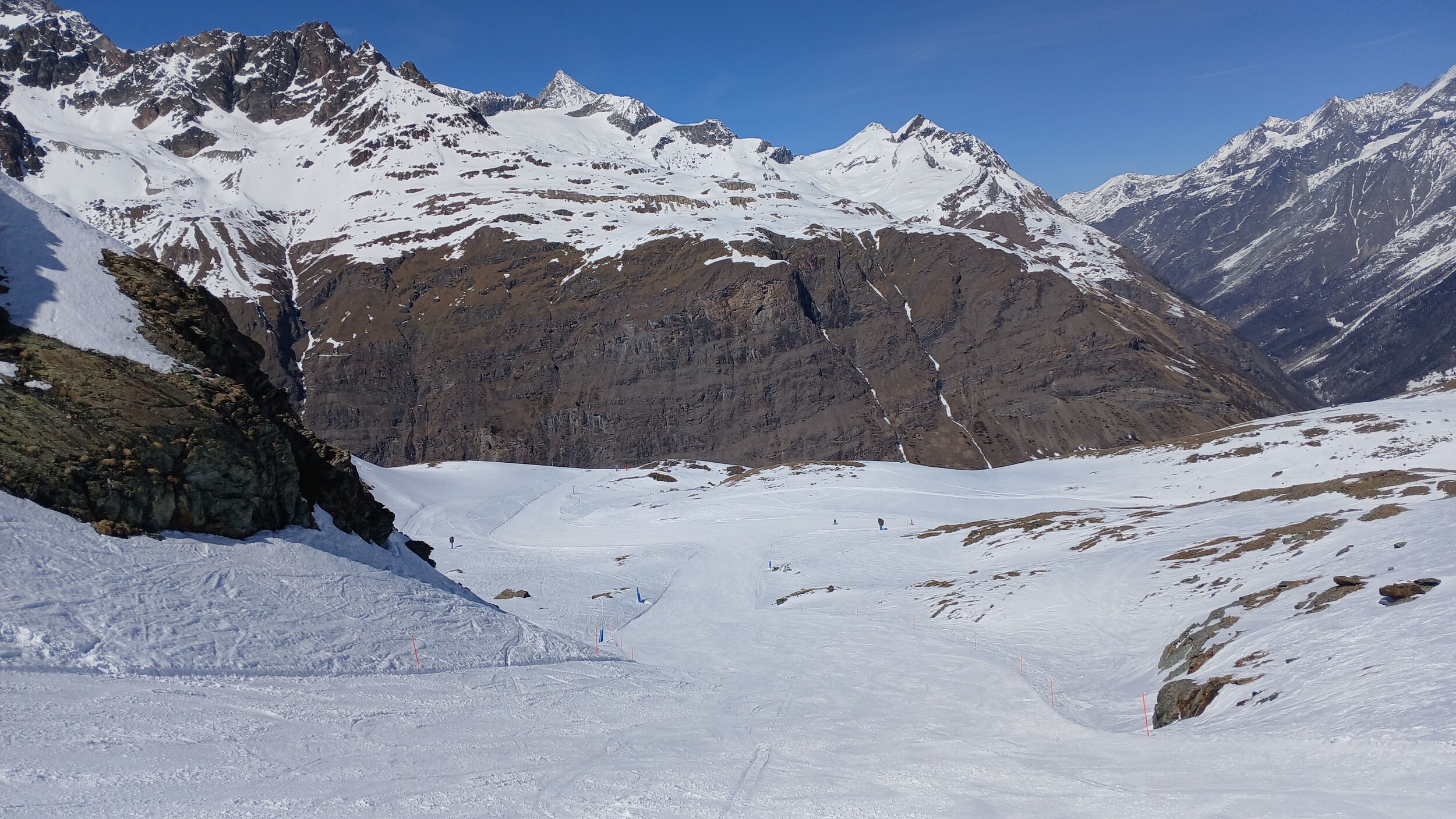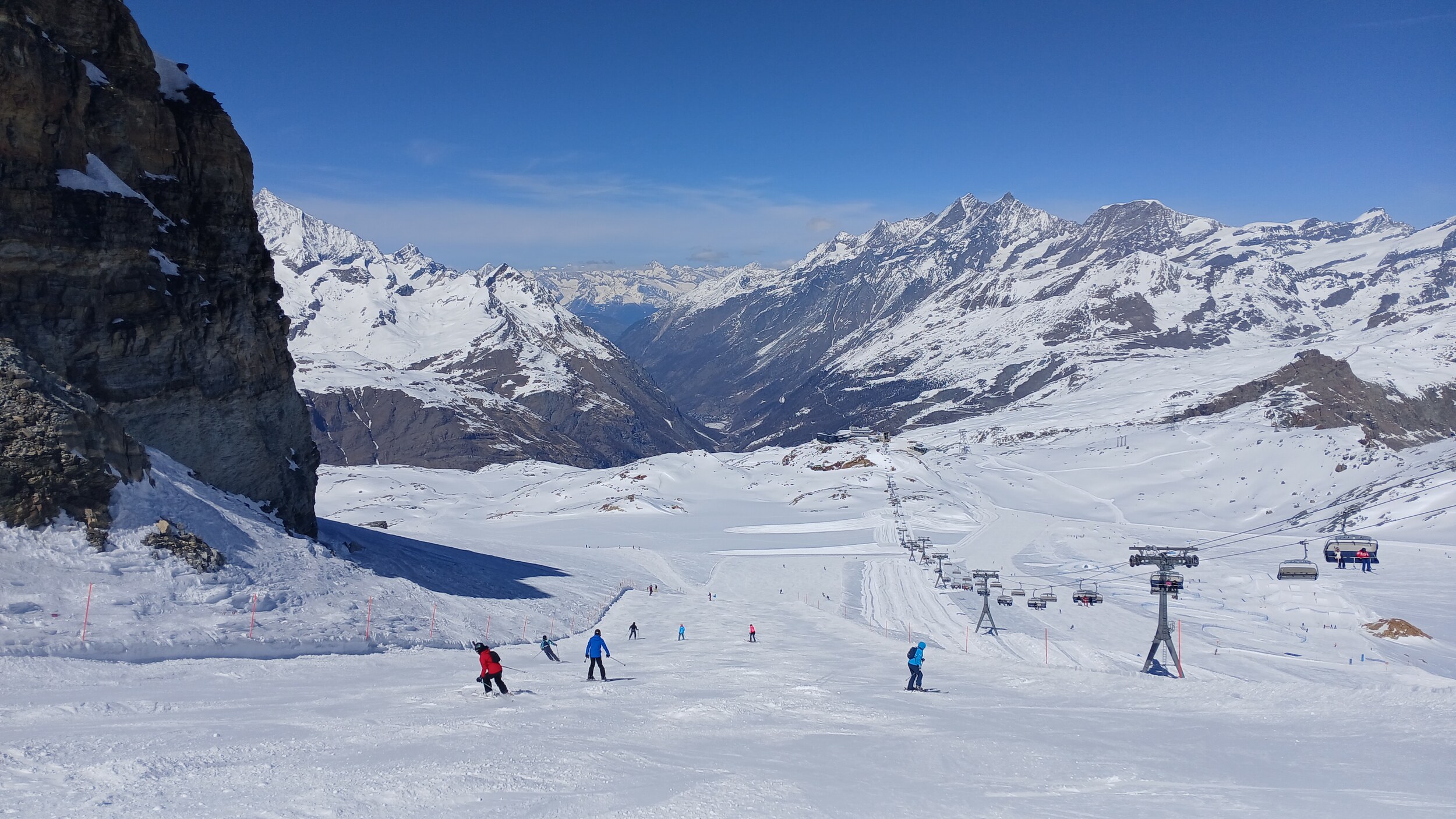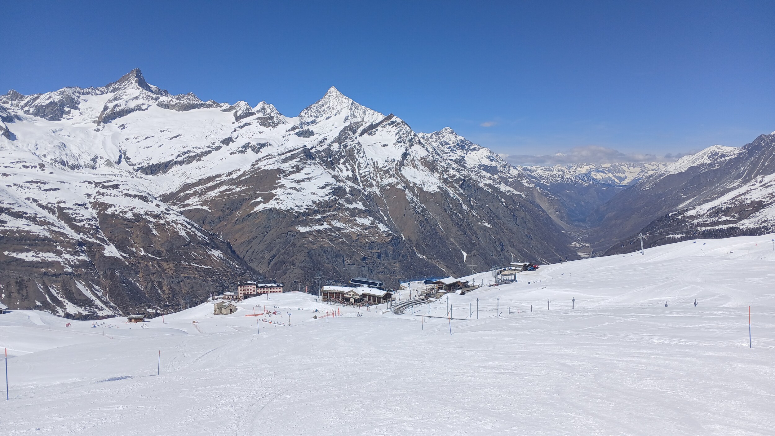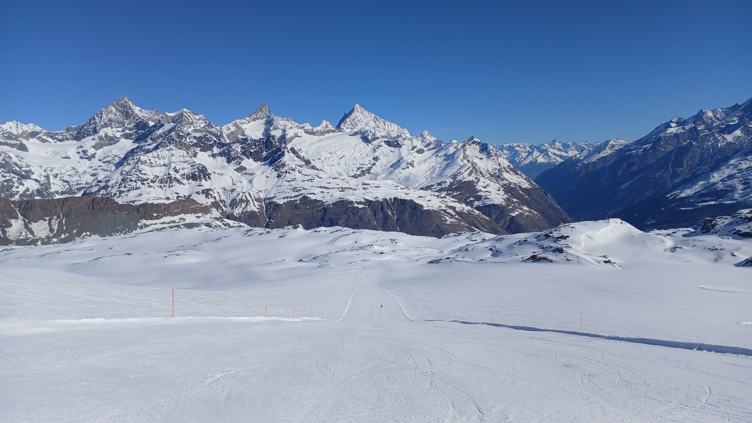 Die Pisten hier sind aber recht flach. Der Sommerskibetrieb dürfte eher langweilig sein und ich würde behaupten, dass die Zermatter Bergbahnen in nicht all zu ferner Zukunft Probleme bekommen, überhaupt noch ein ausreichendes Gefälle anzubieten, um alle Relationen aufrecht zu erhalten