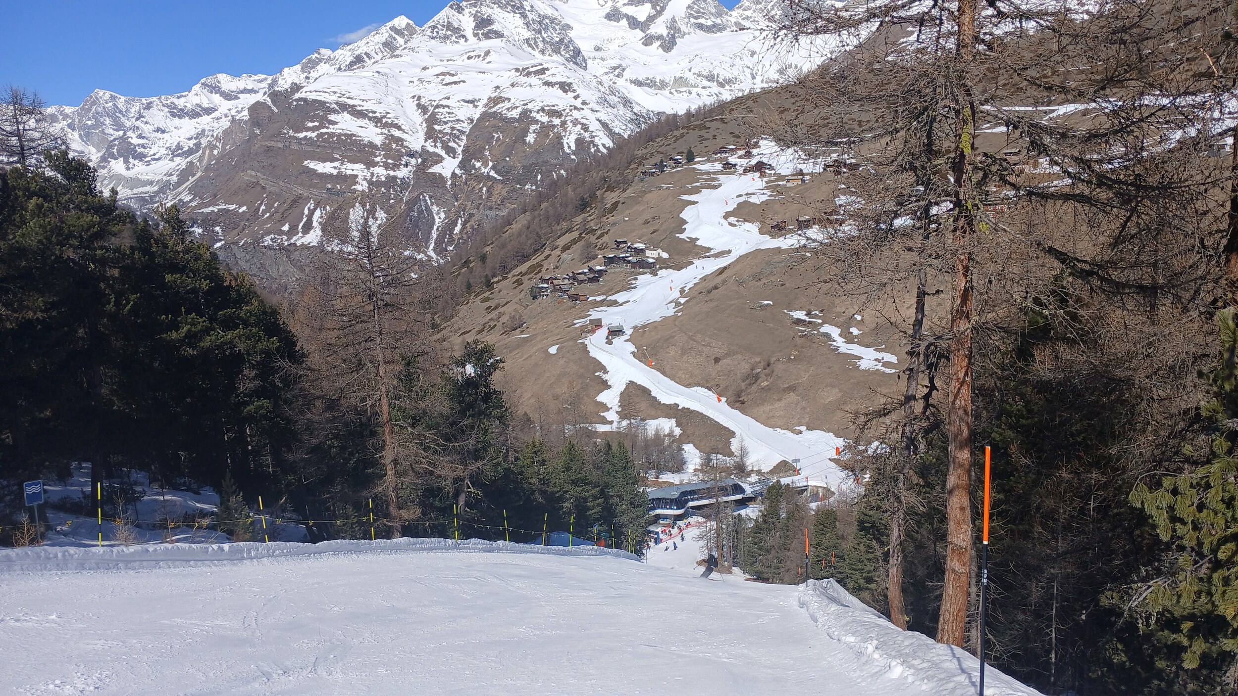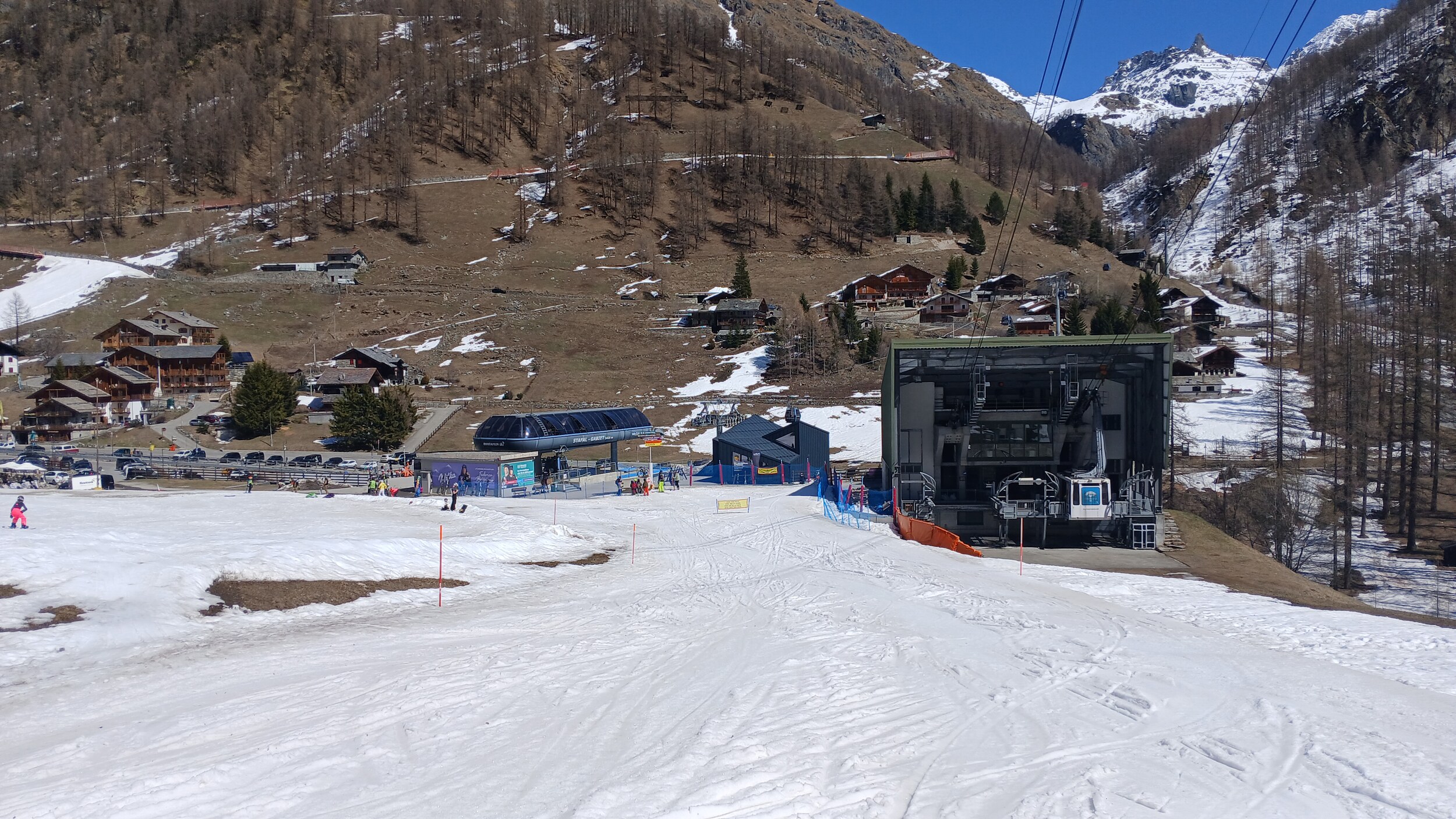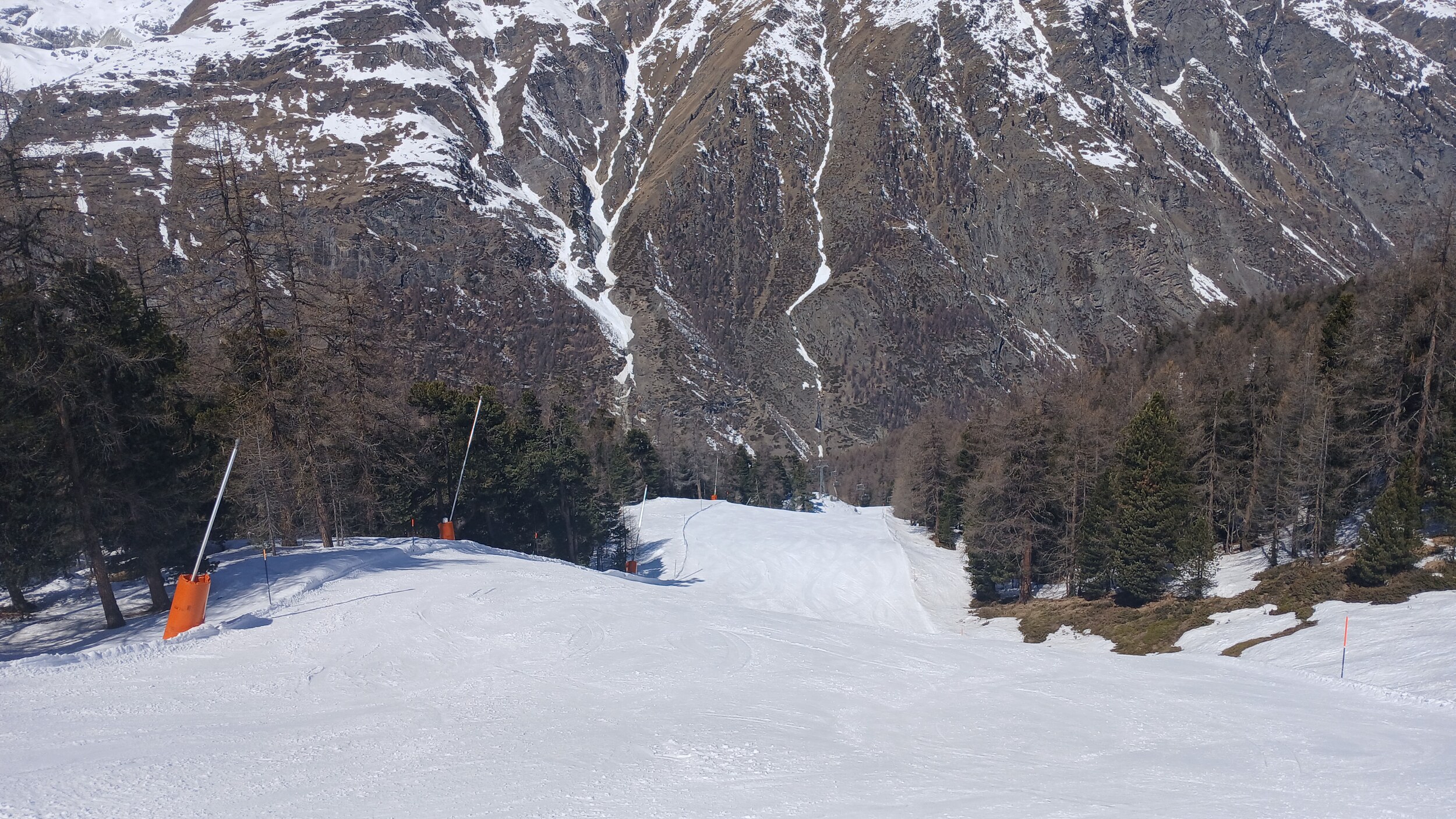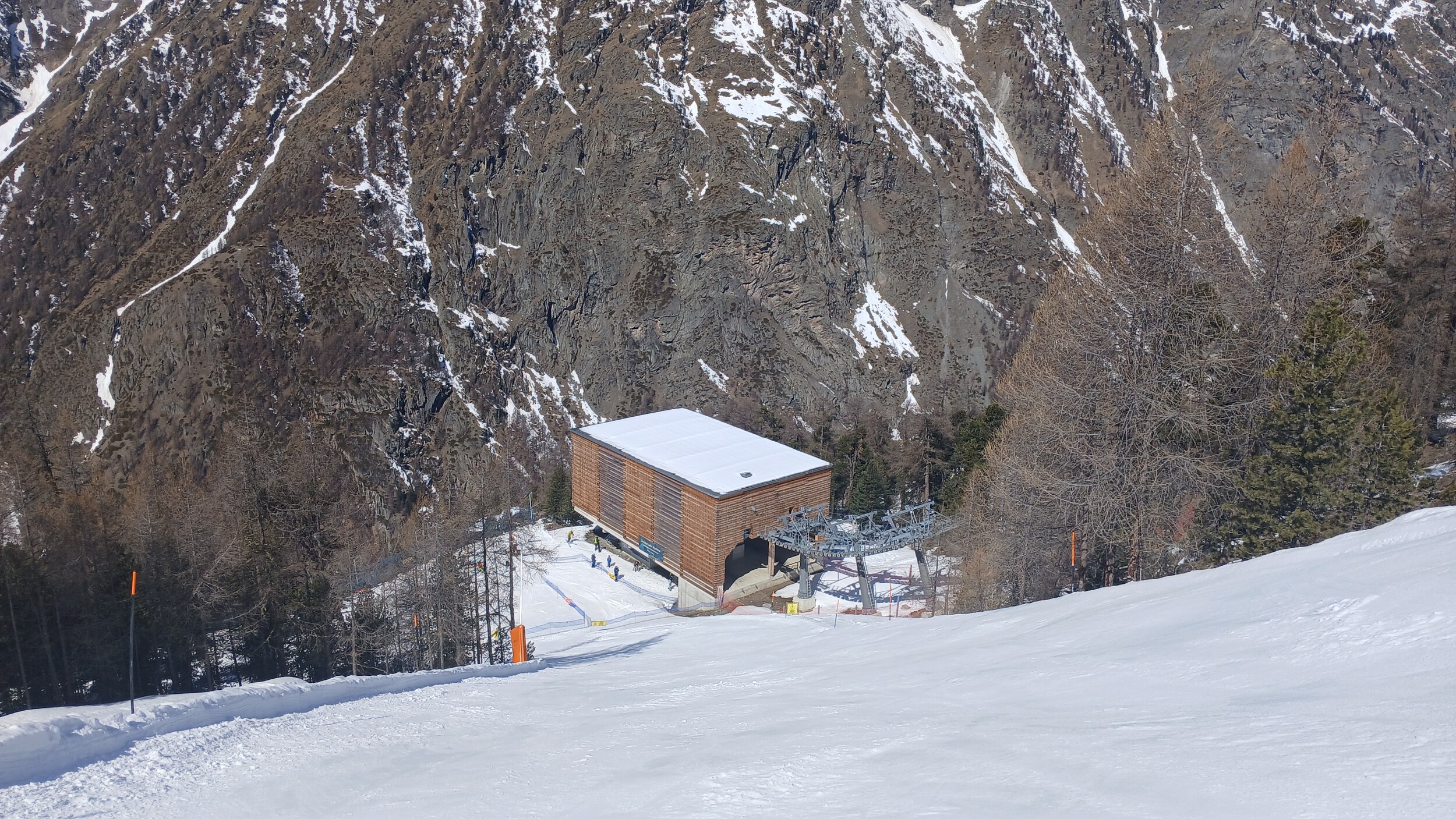 Blick auf die Mittelstation Crest. Die Schneebänder hier sind noch sehr dick.