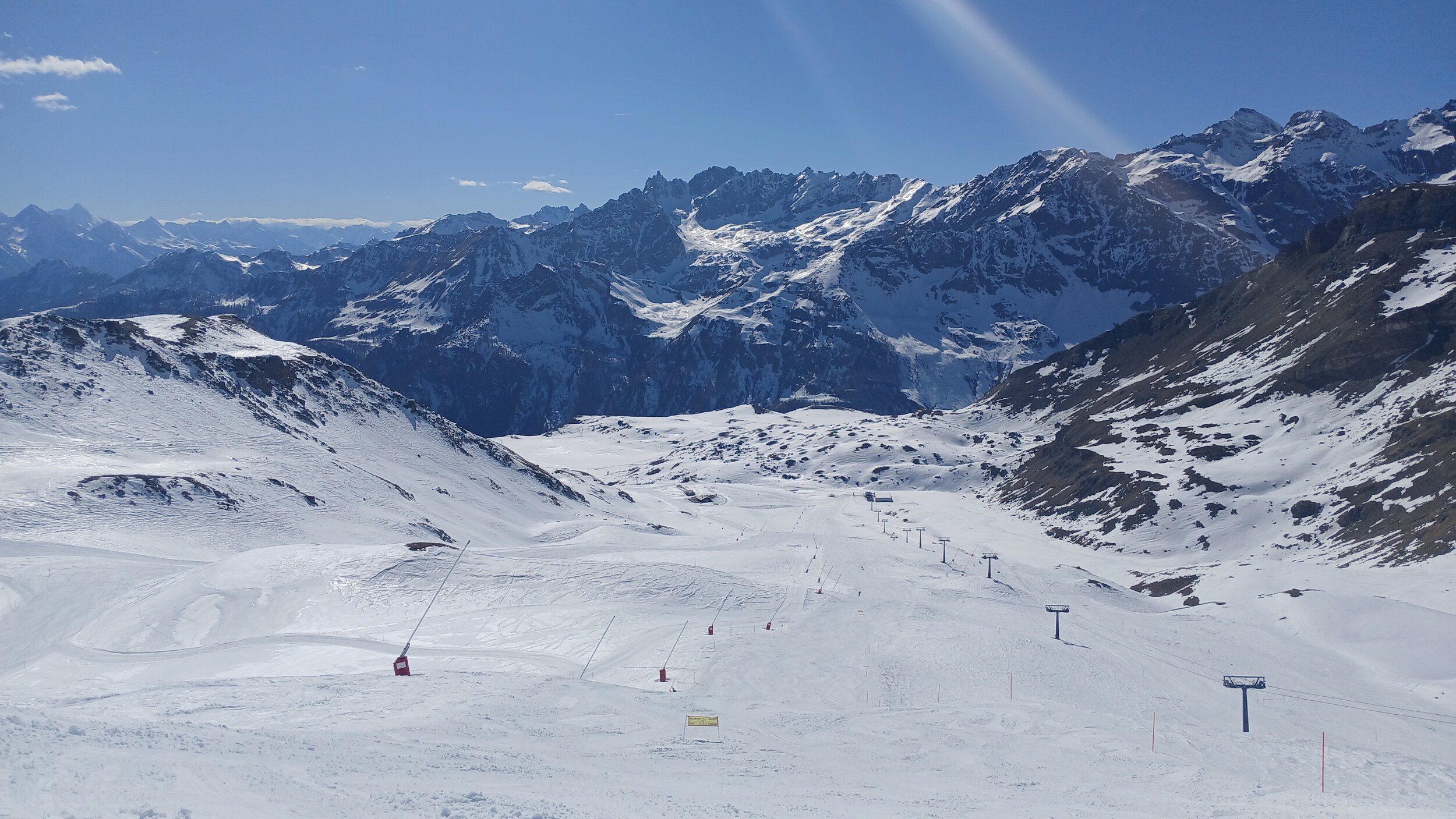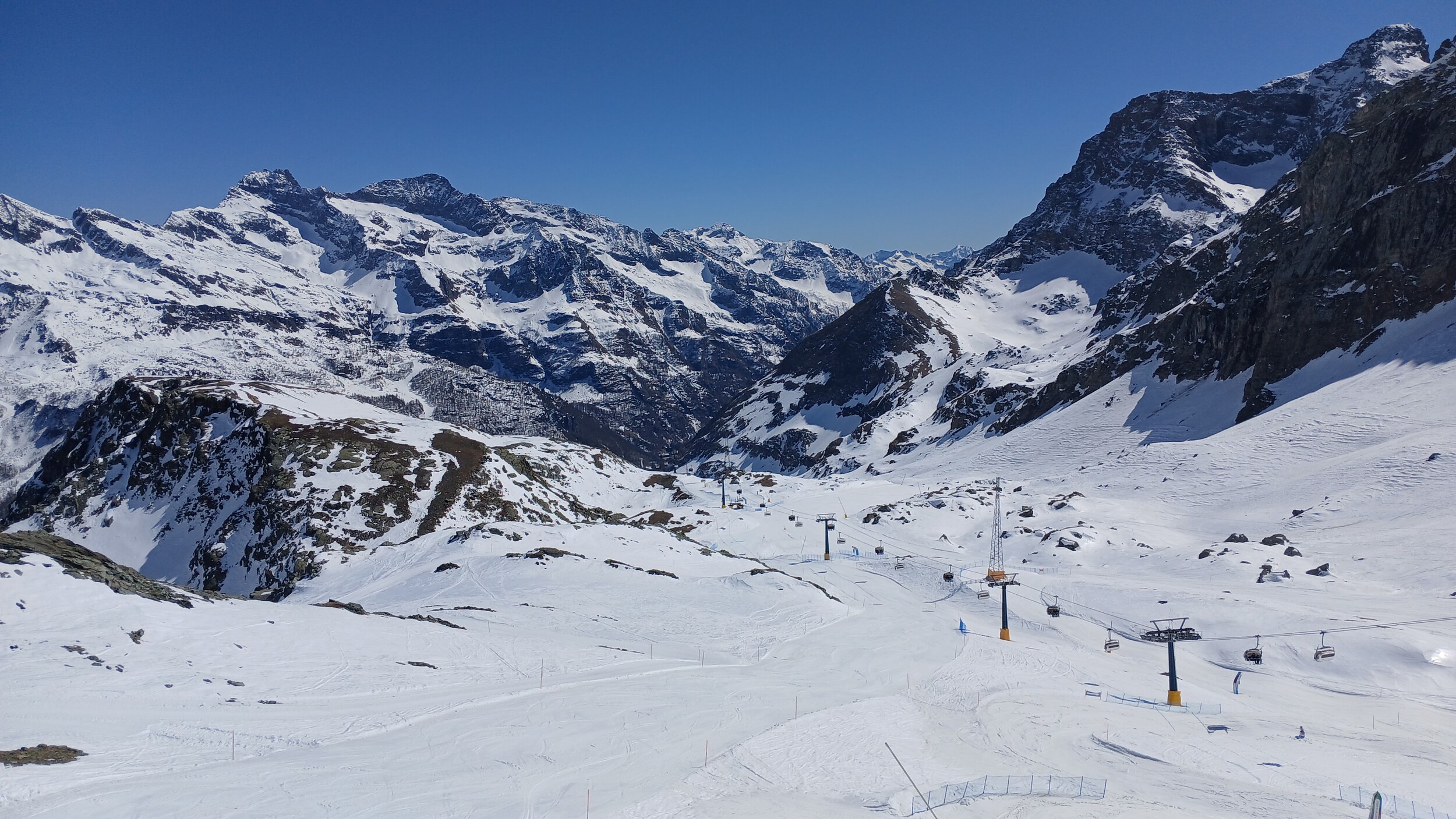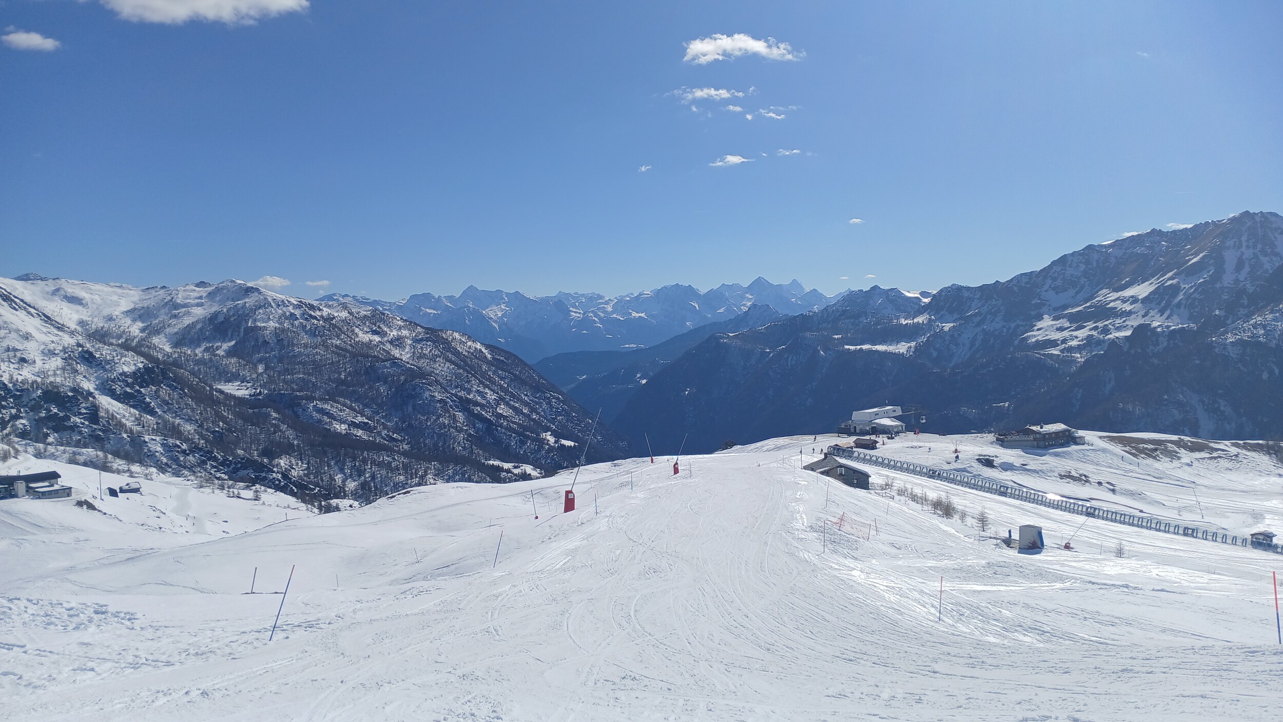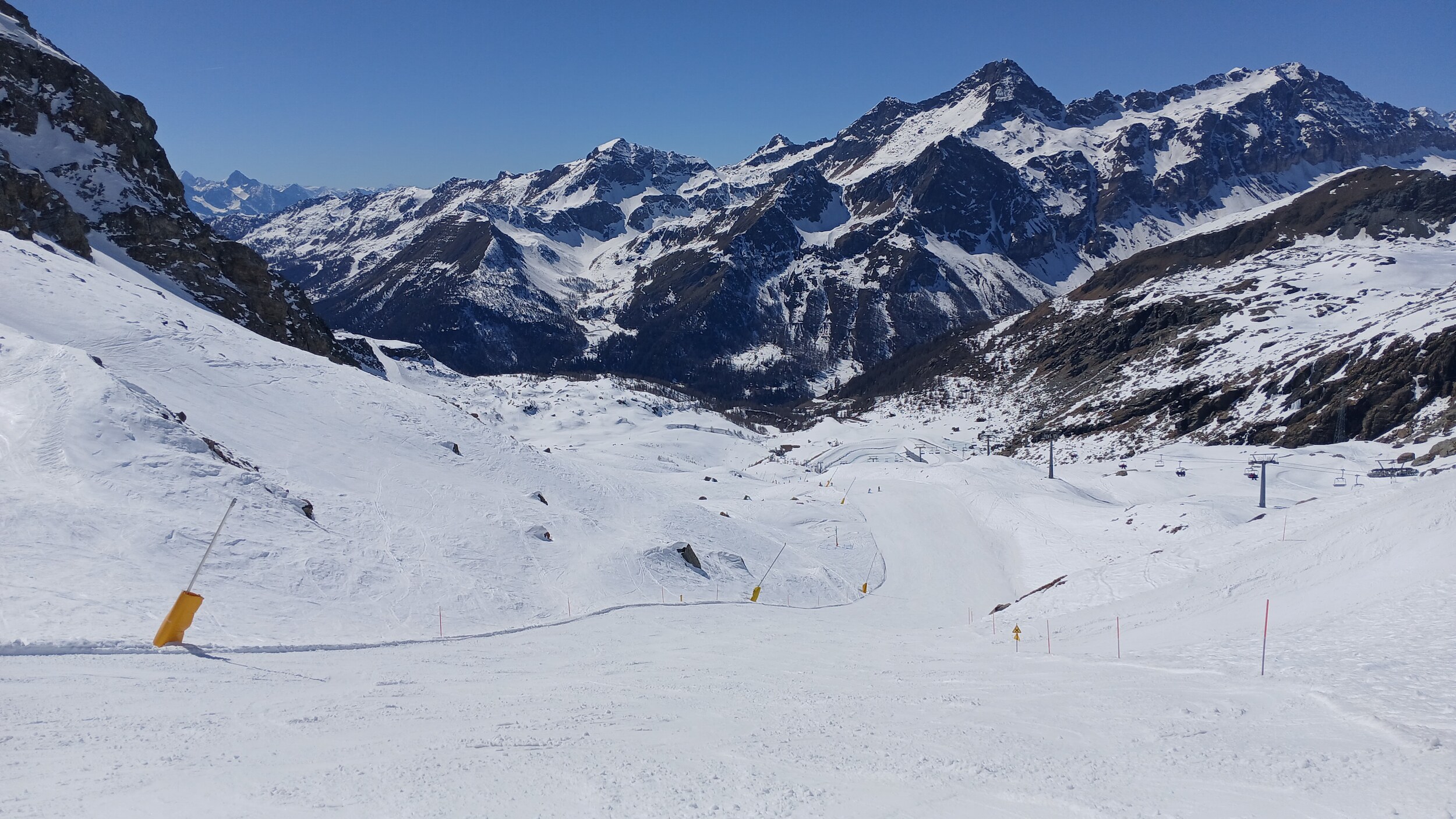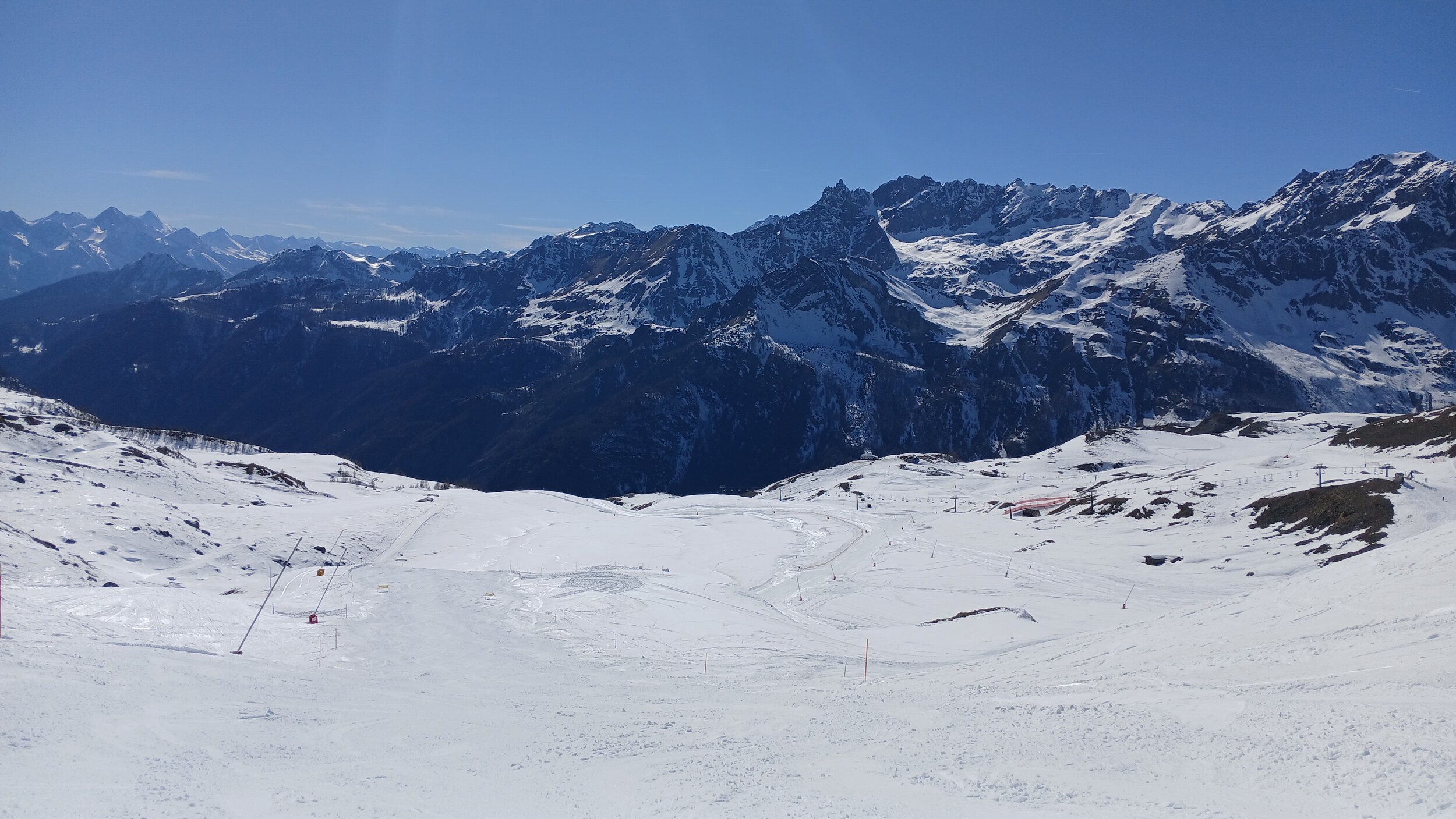 Von Campoluc aus fuhr ich das gesamte Gebiet ab. Es herrscht grundsätzlich Vollbetrieb. Nur die Talabfahrt nach Alagna ist schon geschlossen (ich vermute Schneemangel) und ein paar Pisten waren zeitweise für Training belegt. Man kommt an einem Tag ganz locker durch das gesamte Gebiet.