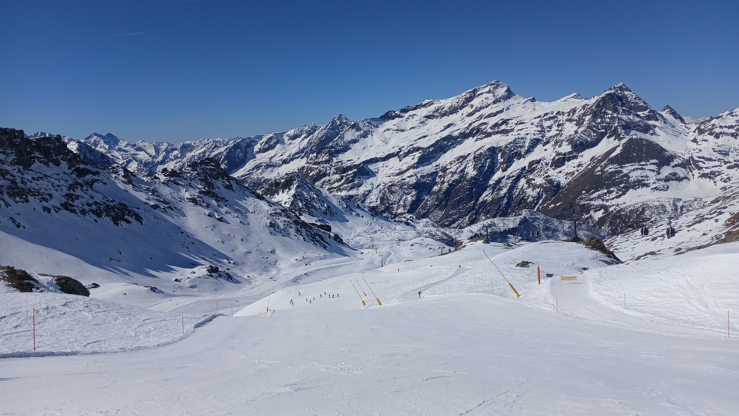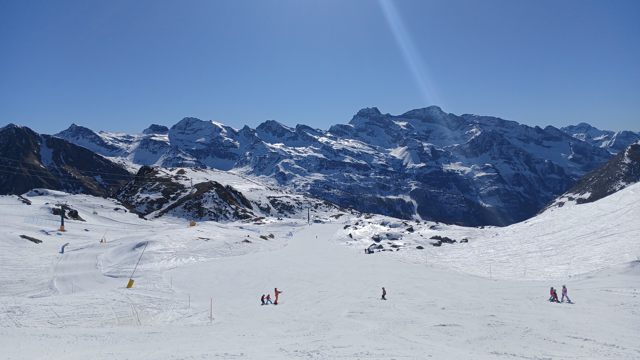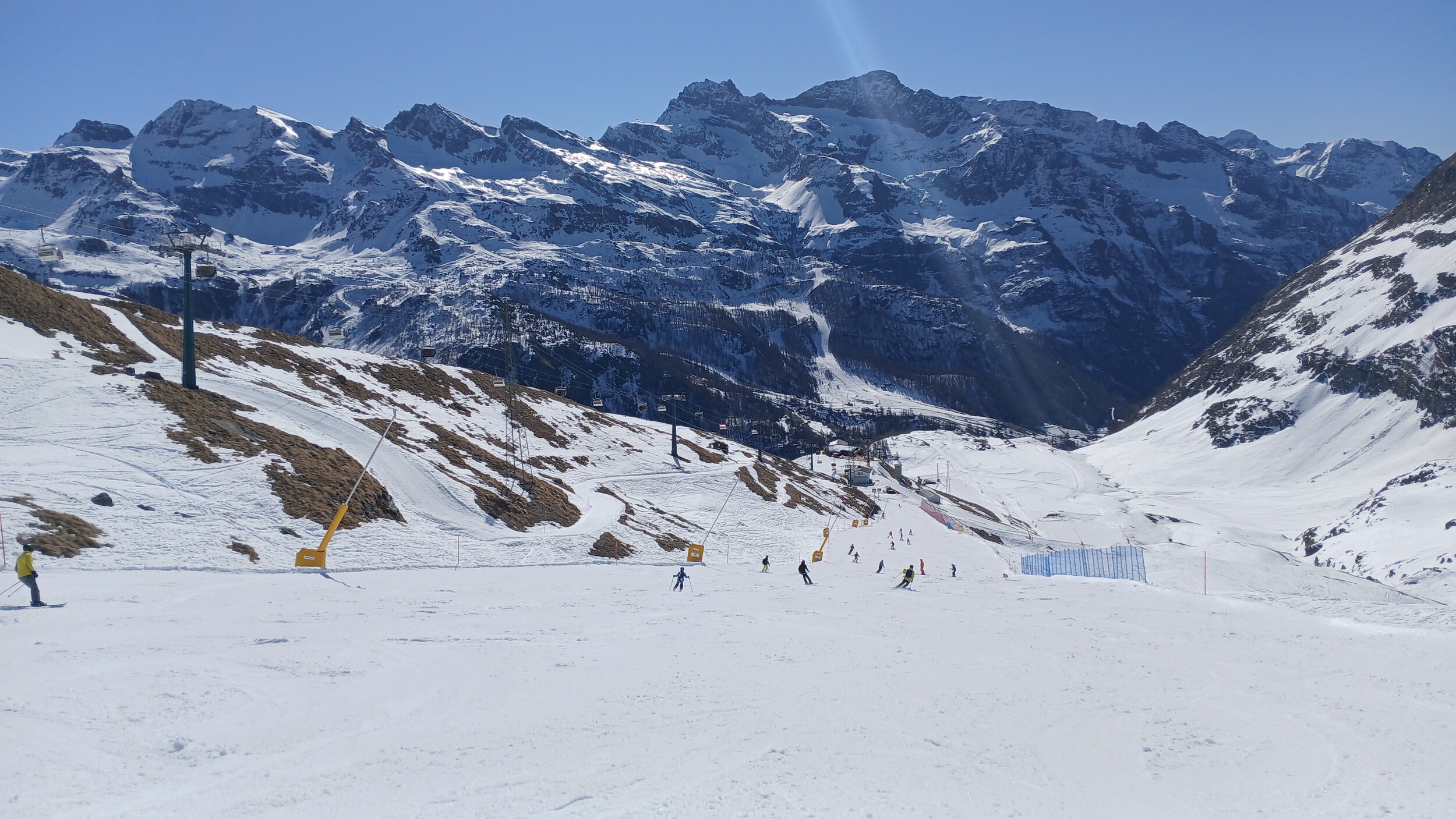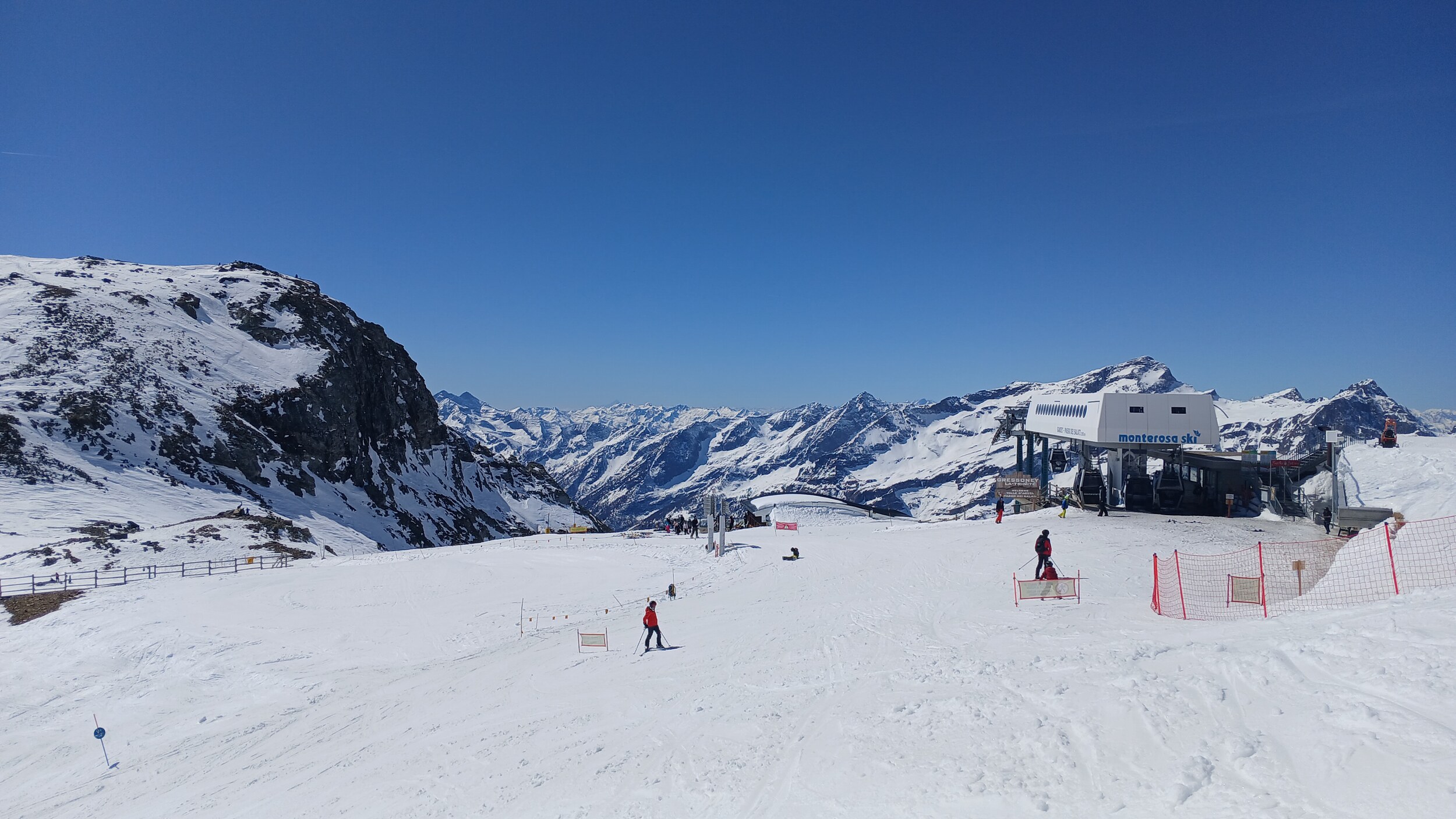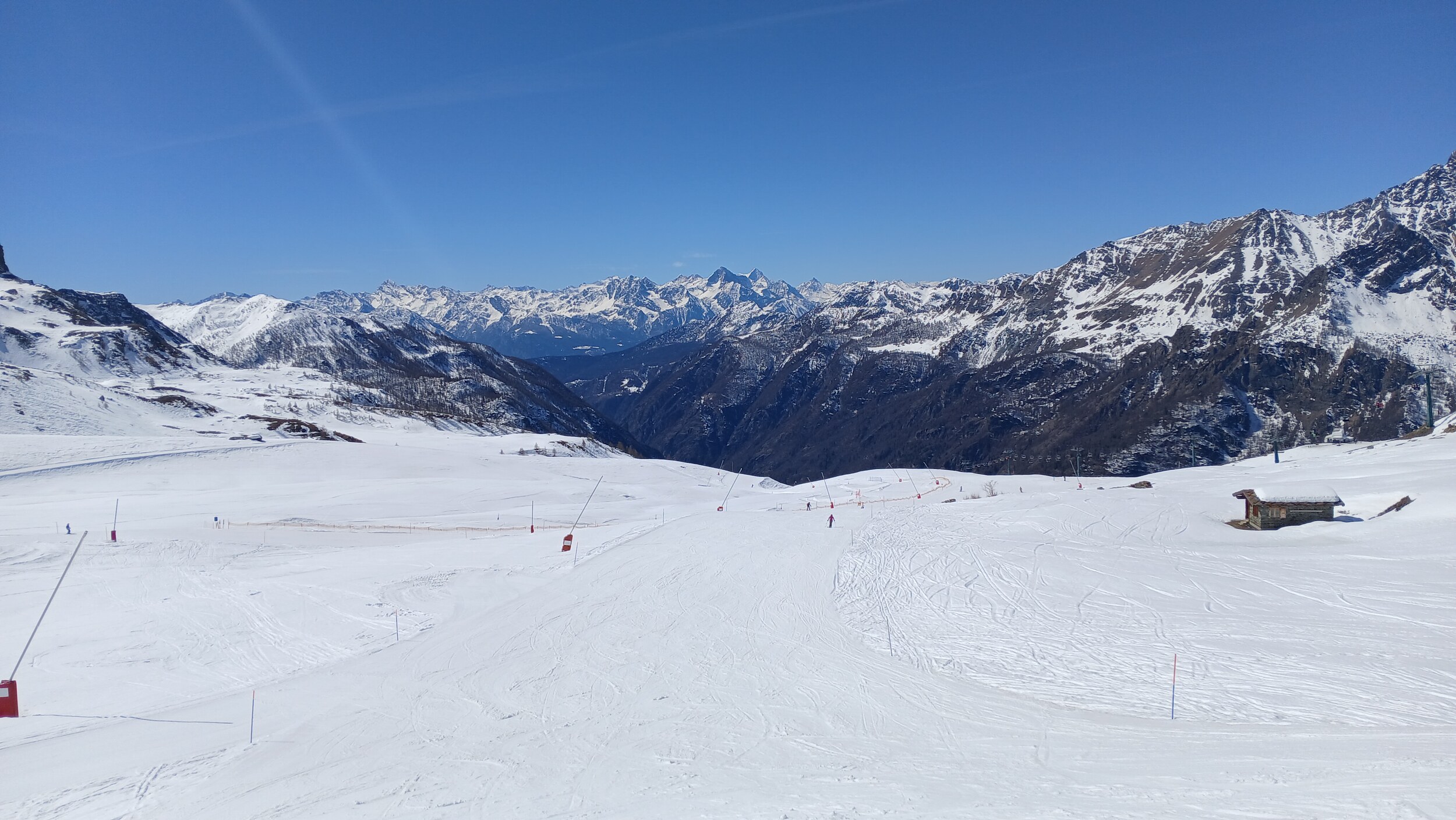 Von Campoluc aus fuhr ich das gesamte Gebiet ab. Es herrscht grundsätzlich Vollbetrieb. Nur die Talabfahrt nach Alagna ist schon geschlossen (ich vermute Schneemangel) und ein paar Pisten waren zeitweise für Training belegt. Man kommt an einem Tag ganz locker durch das gesamte Gebiet.