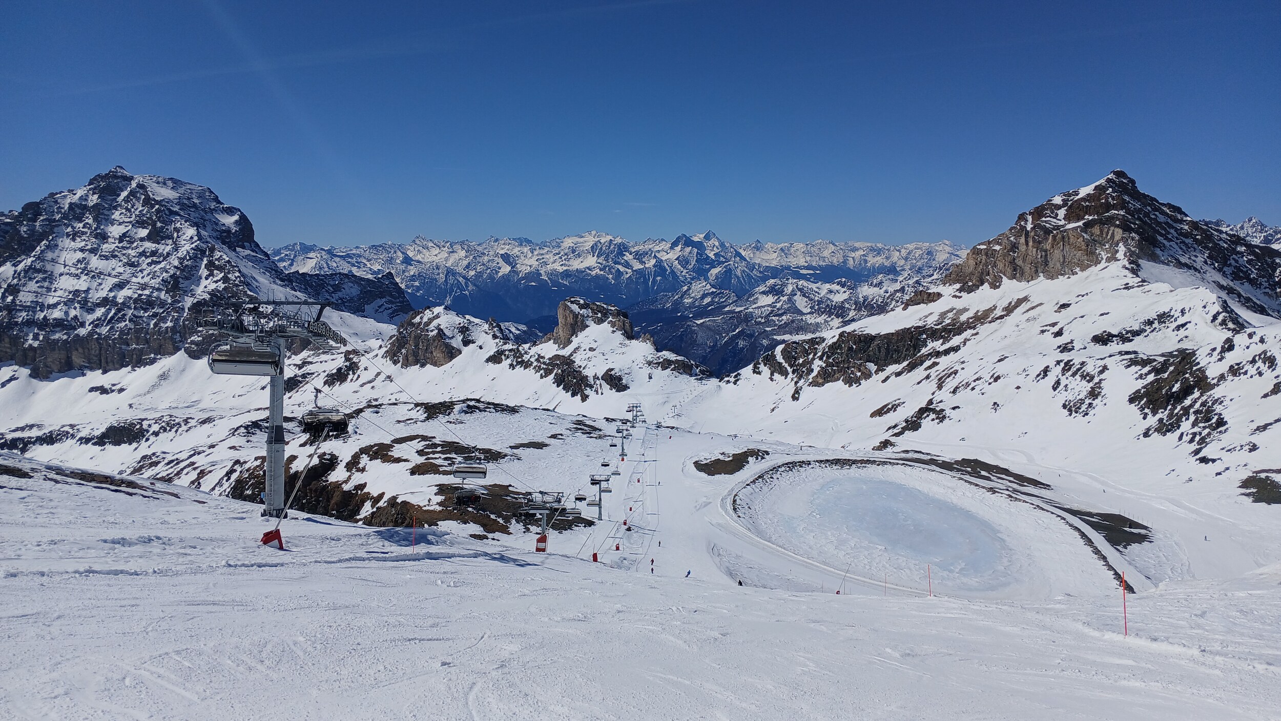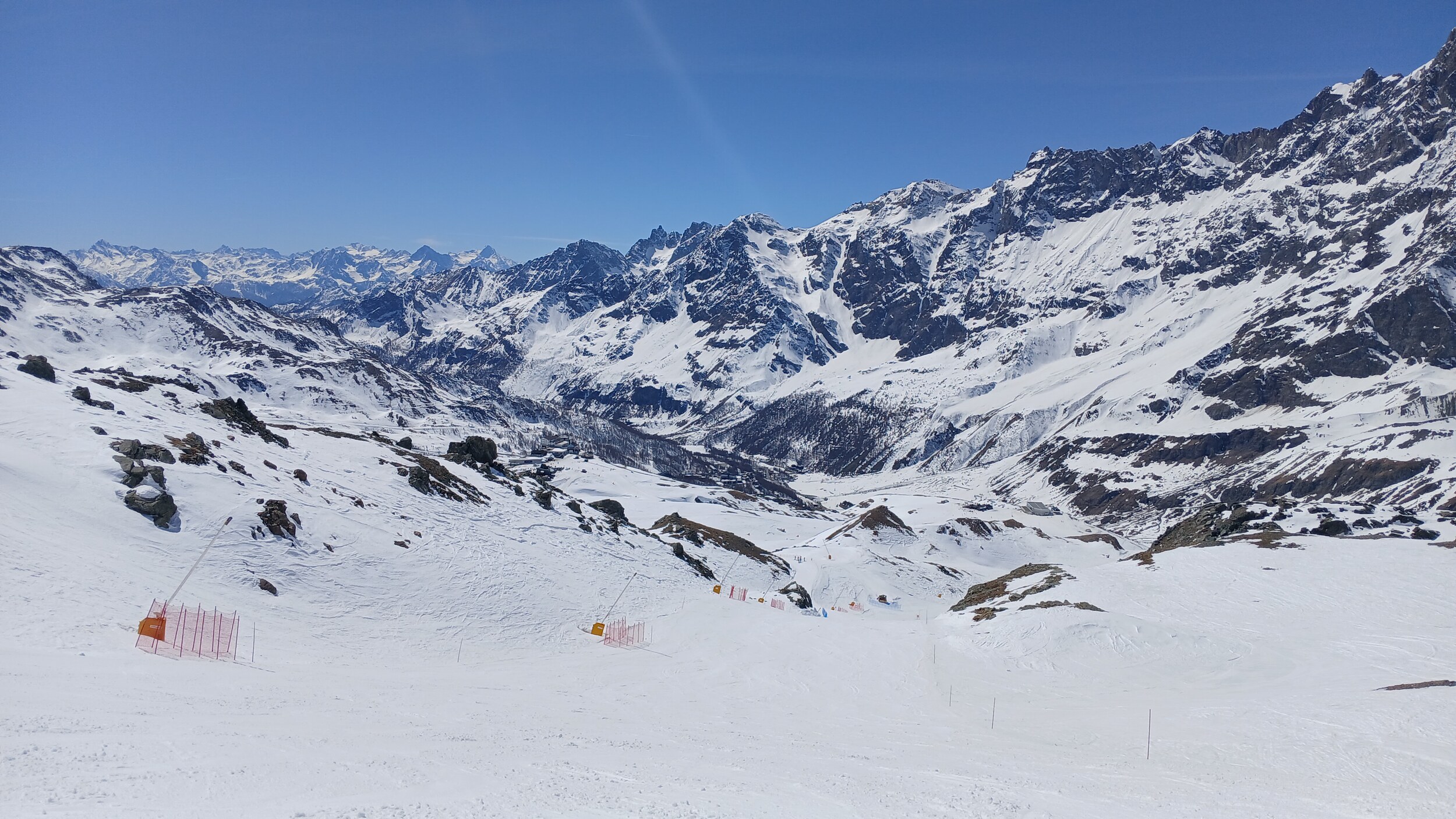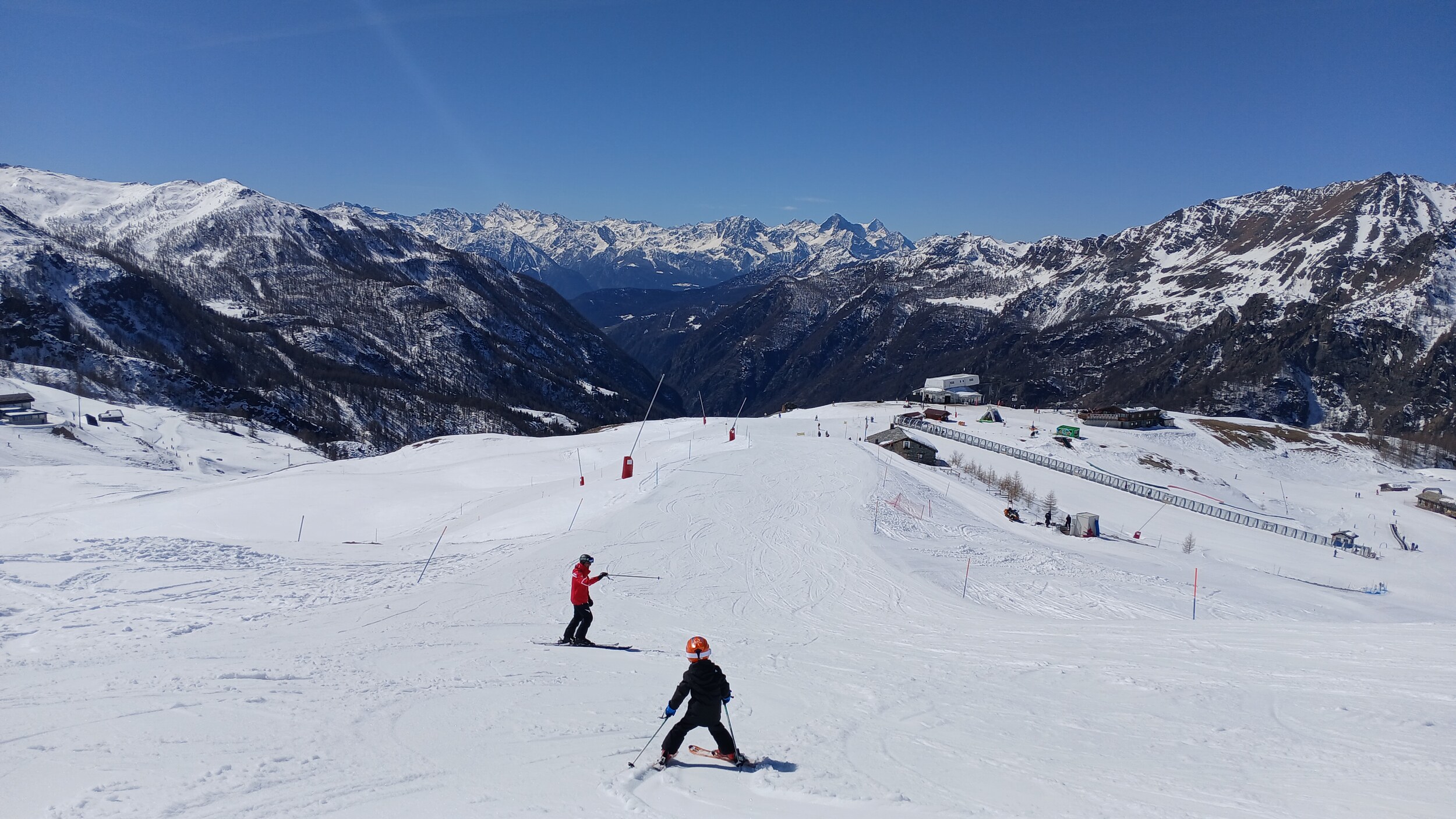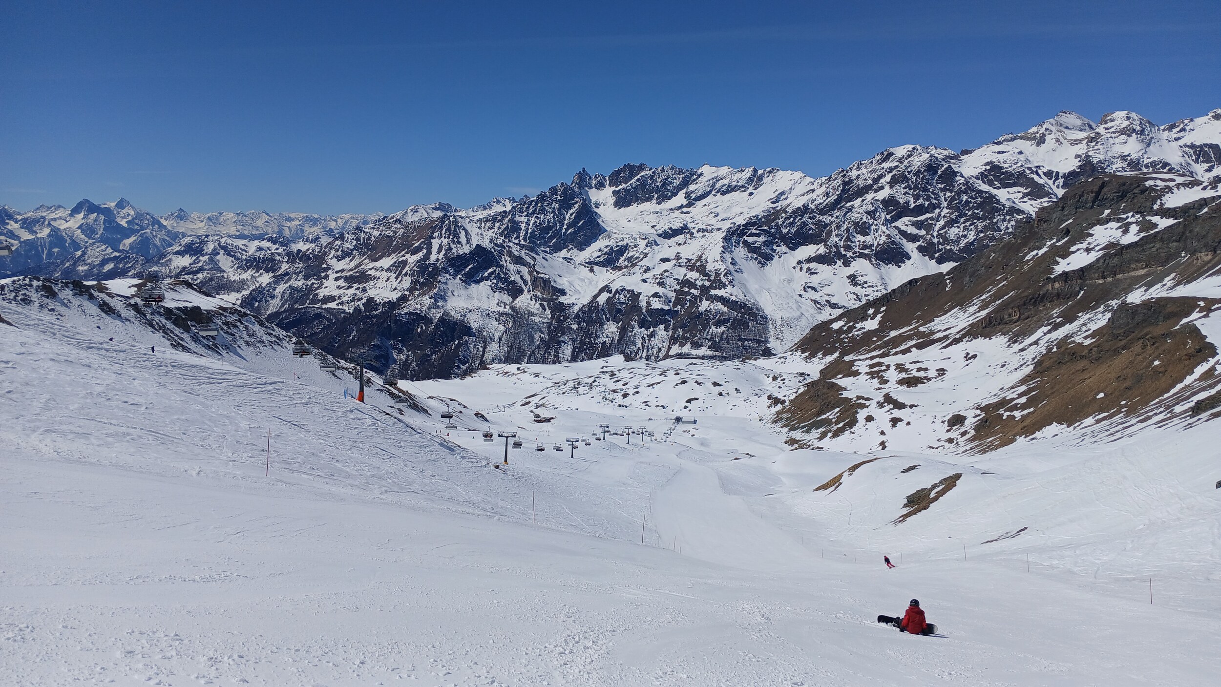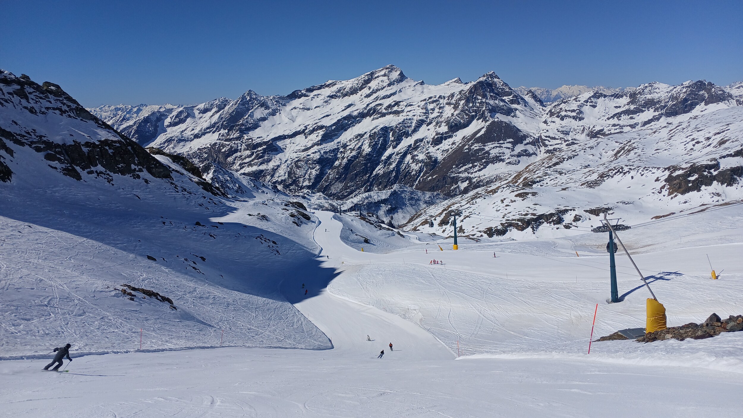 Von Campoluc aus fuhr ich das gesamte Gebiet ab. Es herrscht grundsätzlich Vollbetrieb. Nur die Talabfahrt nach Alagna ist schon geschlossen (ich vermute Schneemangel) und ein paar Pisten waren zeitweise für Training belegt. Man kommt an einem Tag ganz locker durch das gesamte Gebiet.