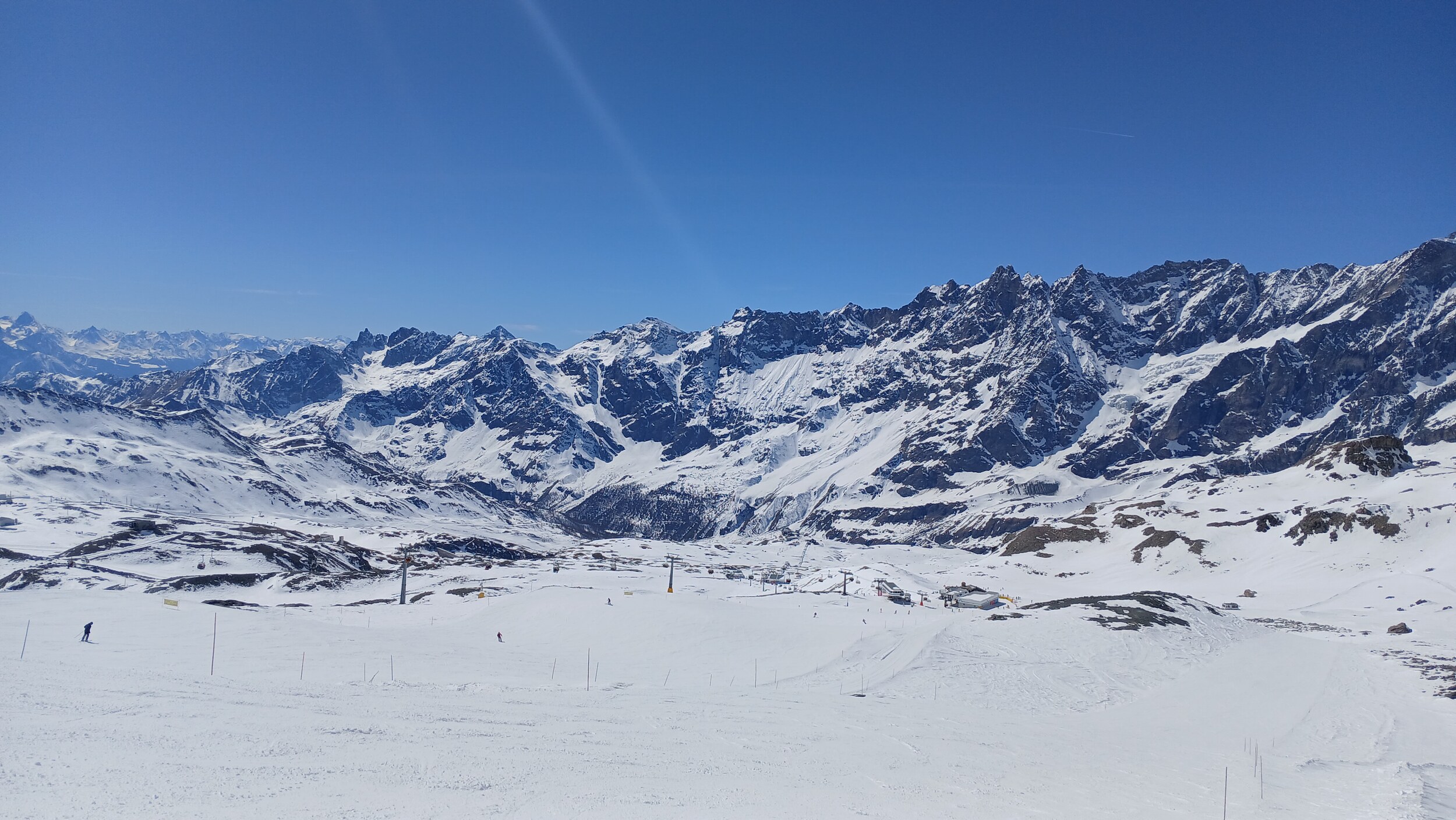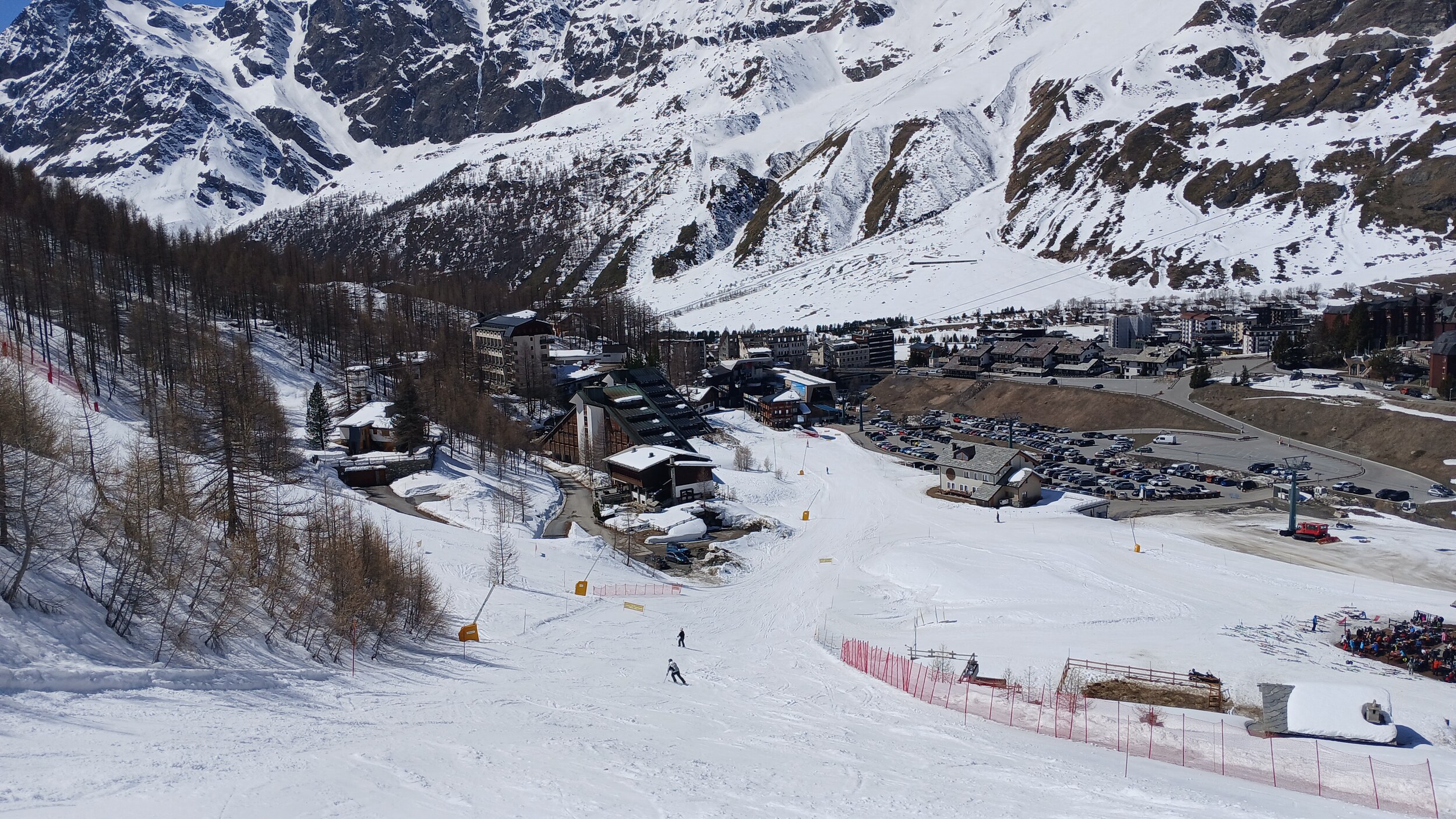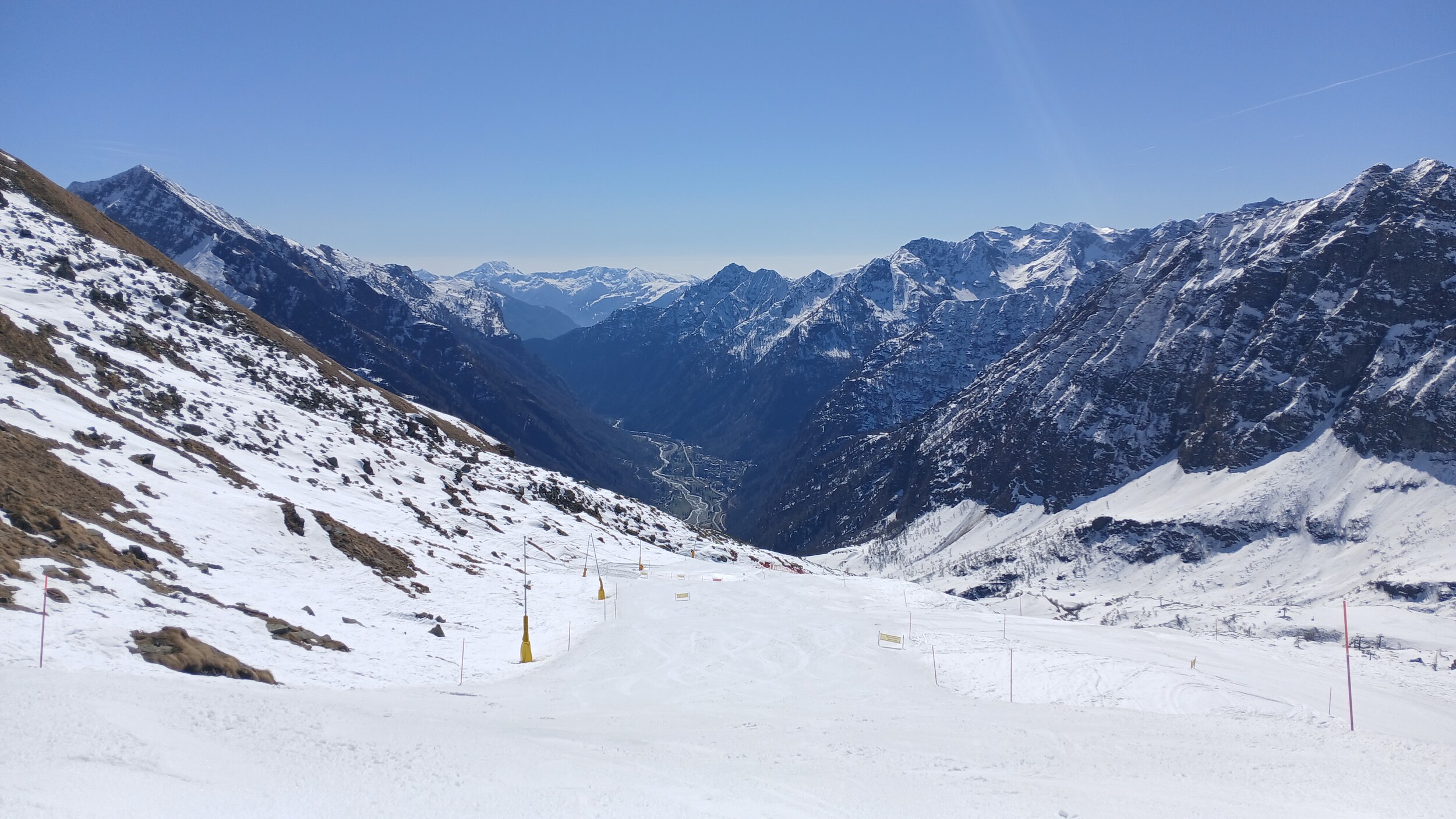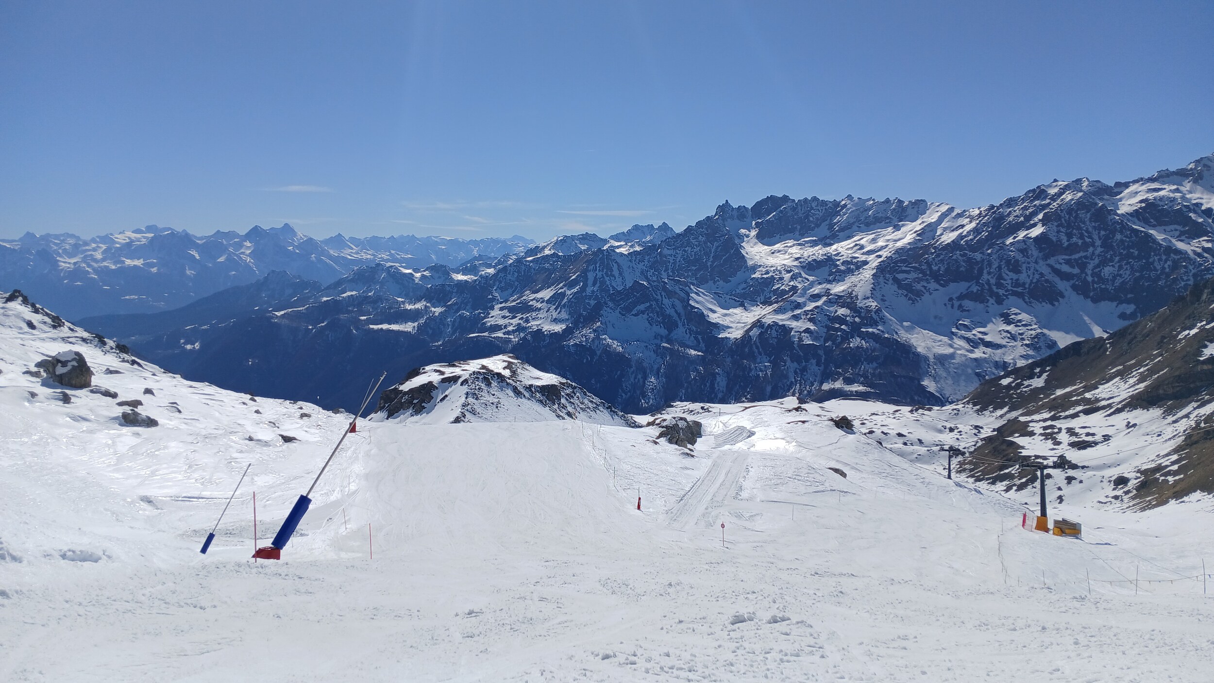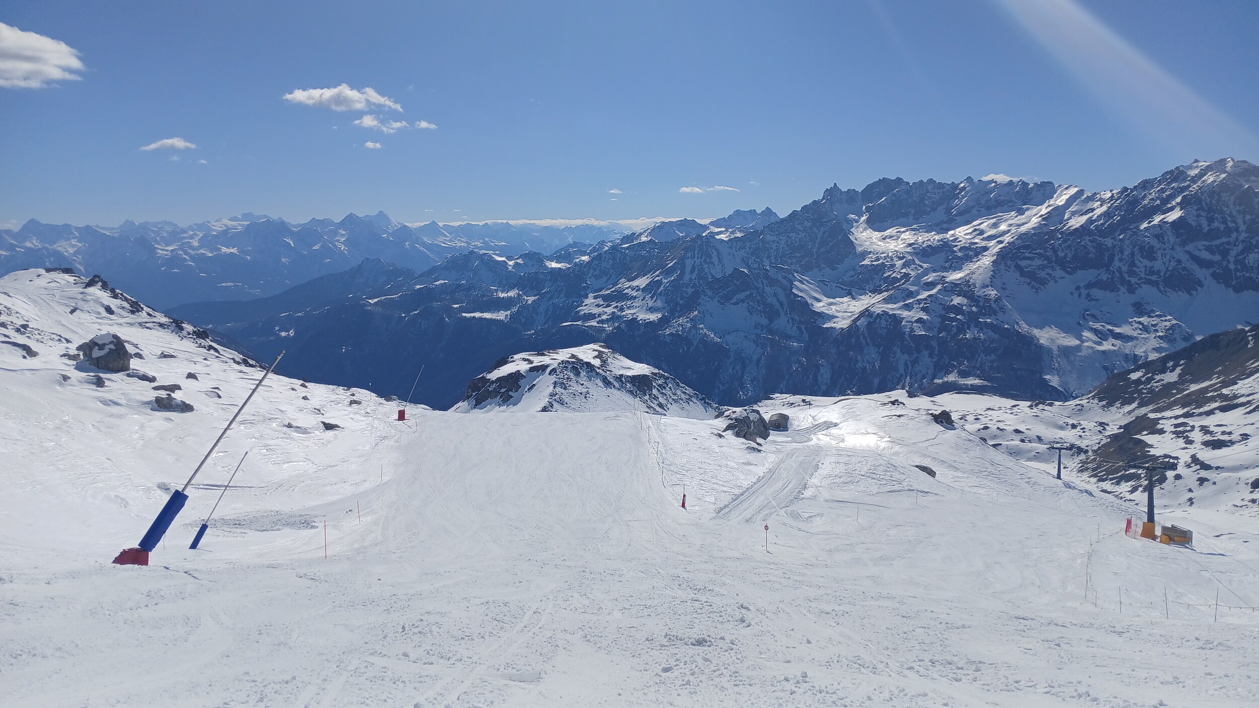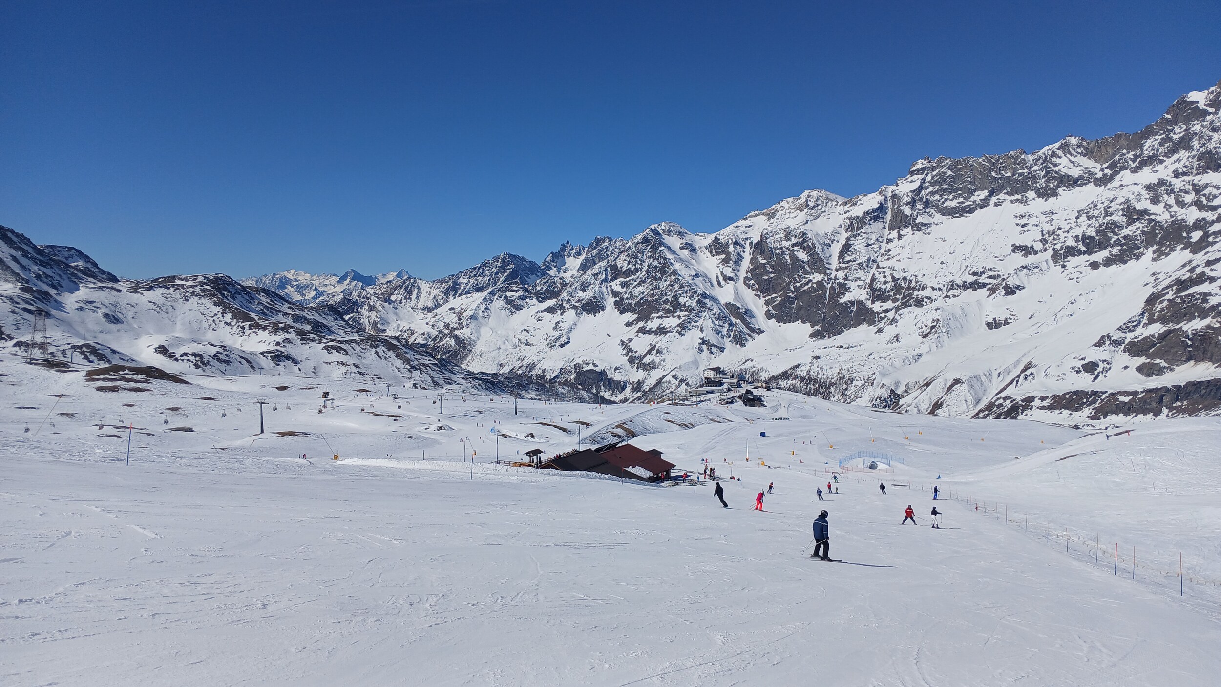 Von Campoluc aus fuhr ich das gesamte Gebiet ab. Es herrscht grundsätzlich Vollbetrieb. Nur die Talabfahrt nach Alagna ist schon geschlossen (ich vermute Schneemangel) und ein paar Pisten waren zeitweise für Training belegt. Man kommt an einem Tag ganz locker durch das gesamte Gebiet.