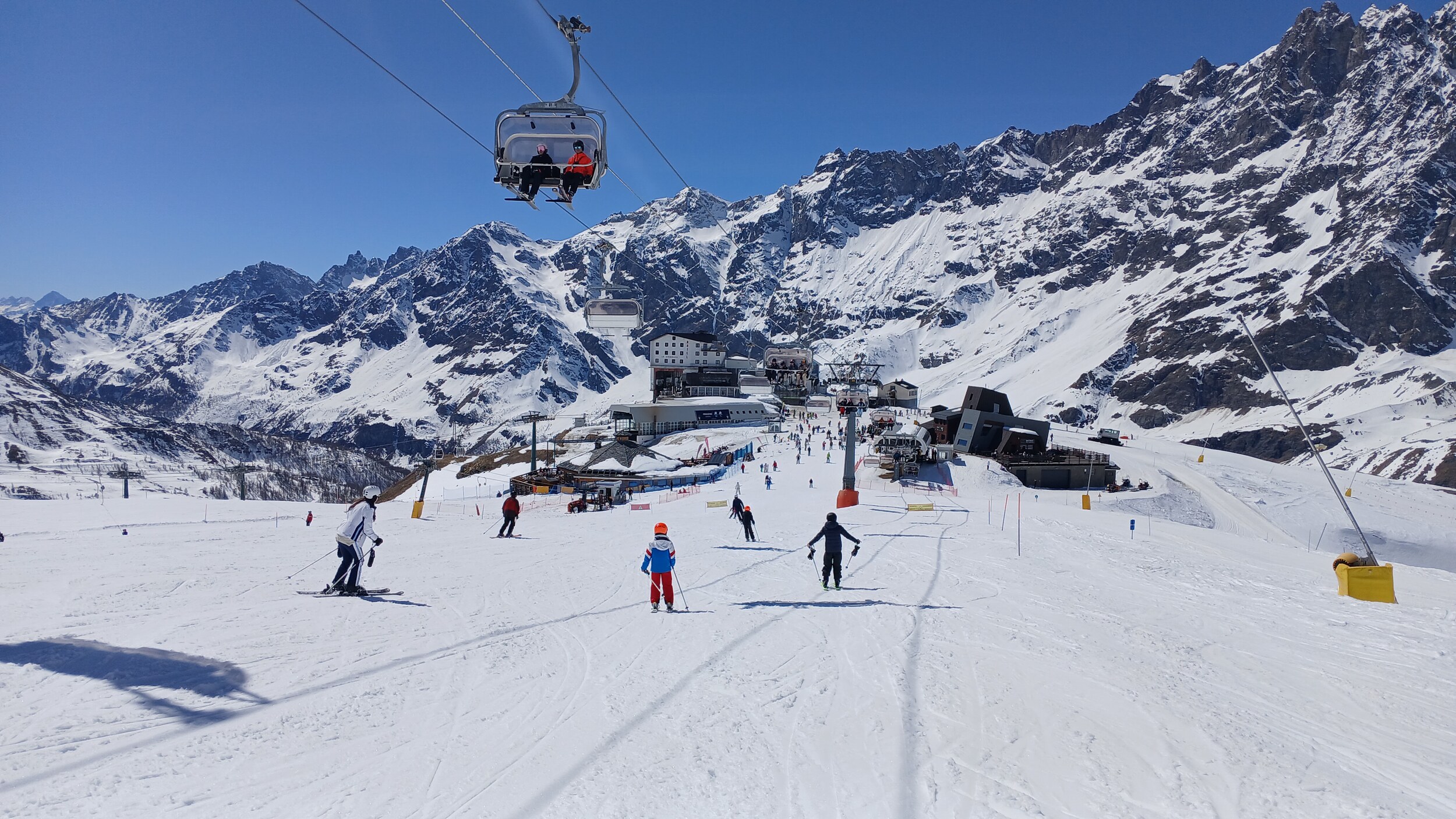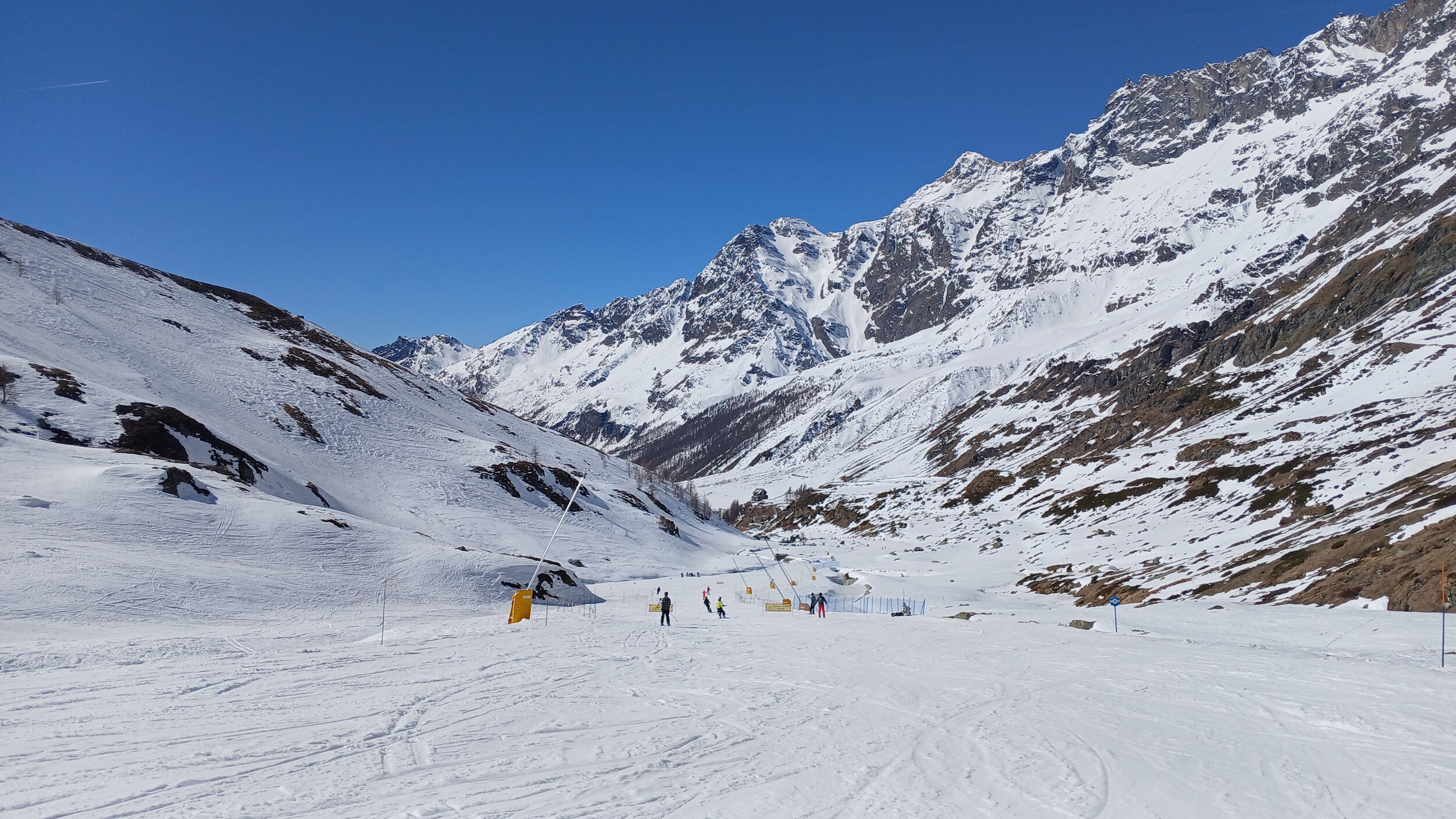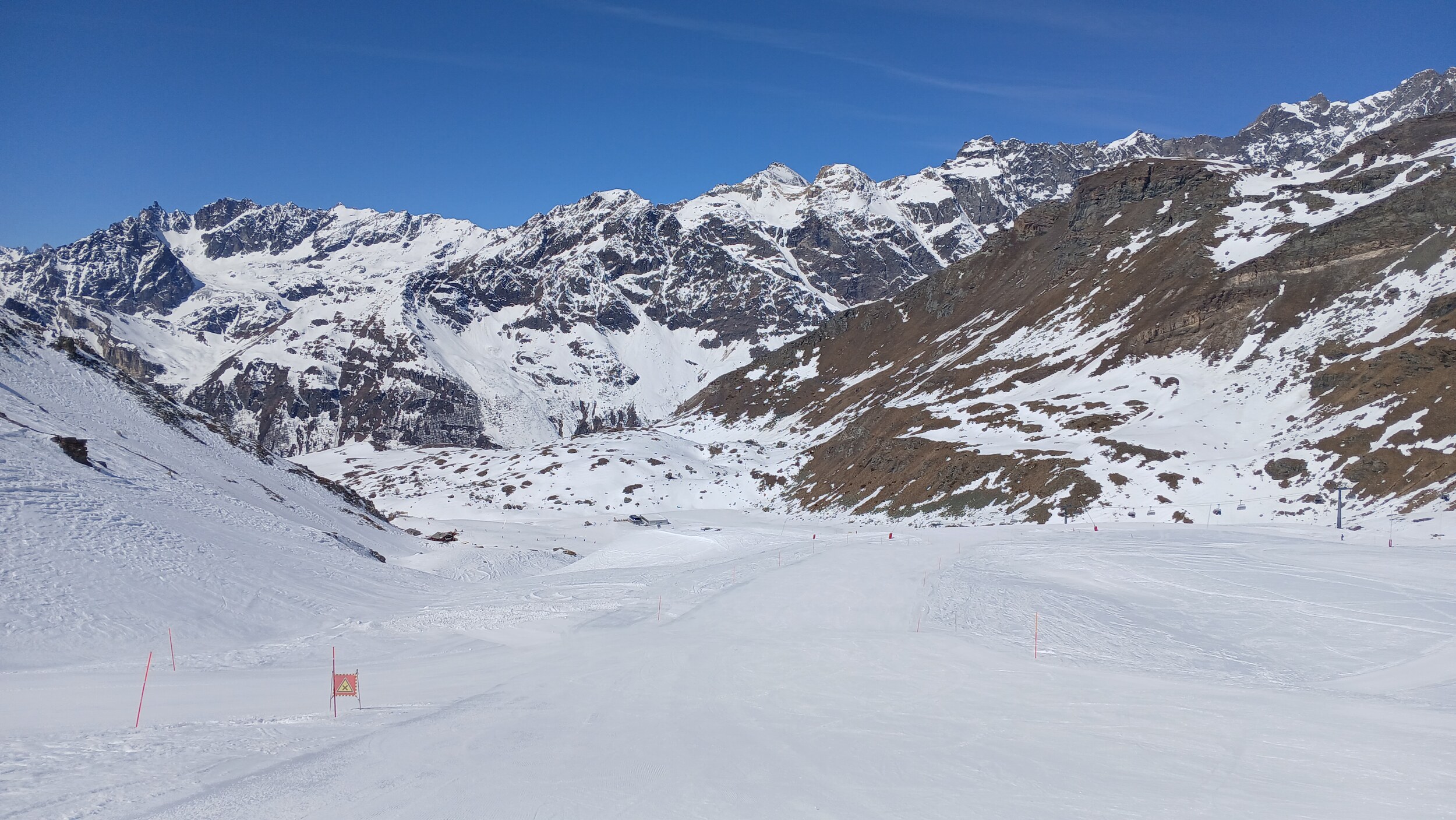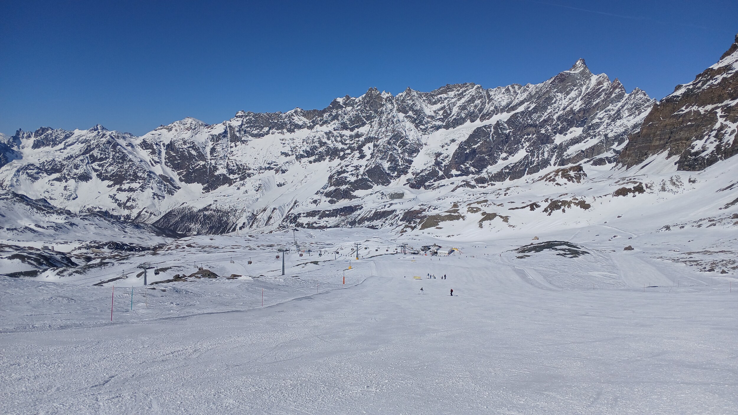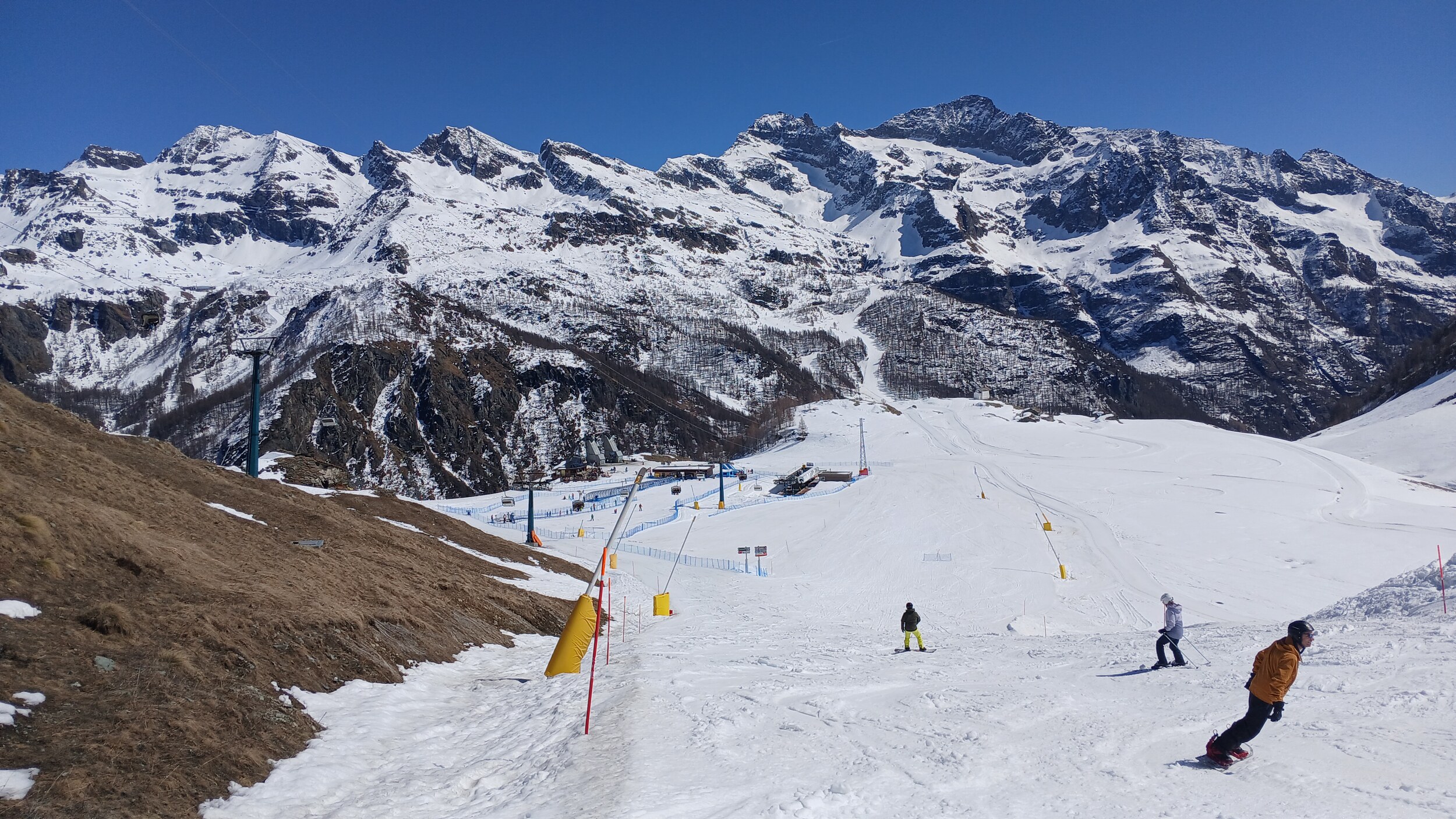 Von Campoluc aus fuhr ich das gesamte Gebiet ab. Es herrscht grundsätzlich Vollbetrieb. Nur die Talabfahrt nach Alagna ist schon geschlossen (ich vermute Schneemangel) und ein paar Pisten waren zeitweise für Training belegt. Man kommt an einem Tag ganz locker durch das gesamte Gebiet.