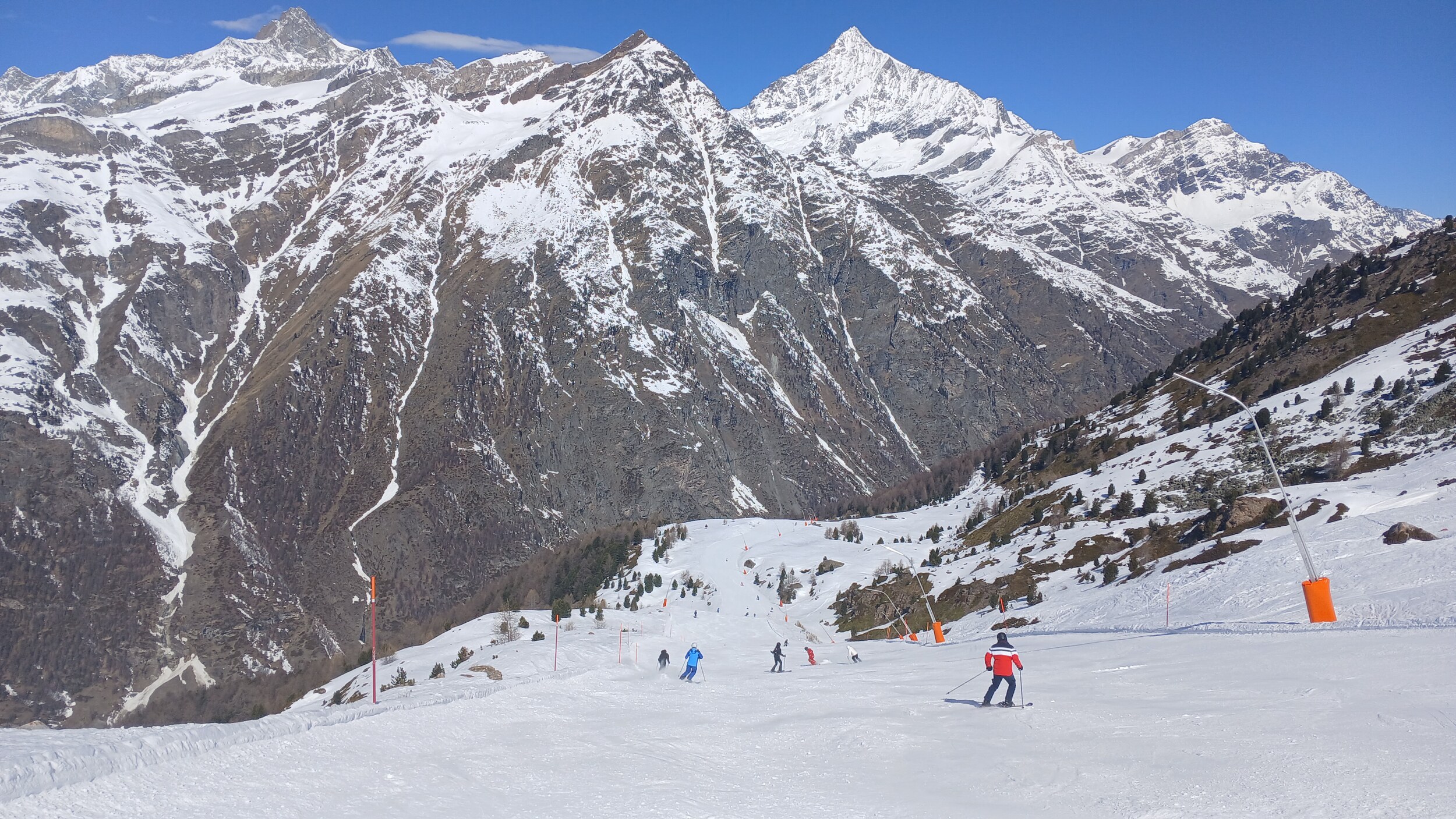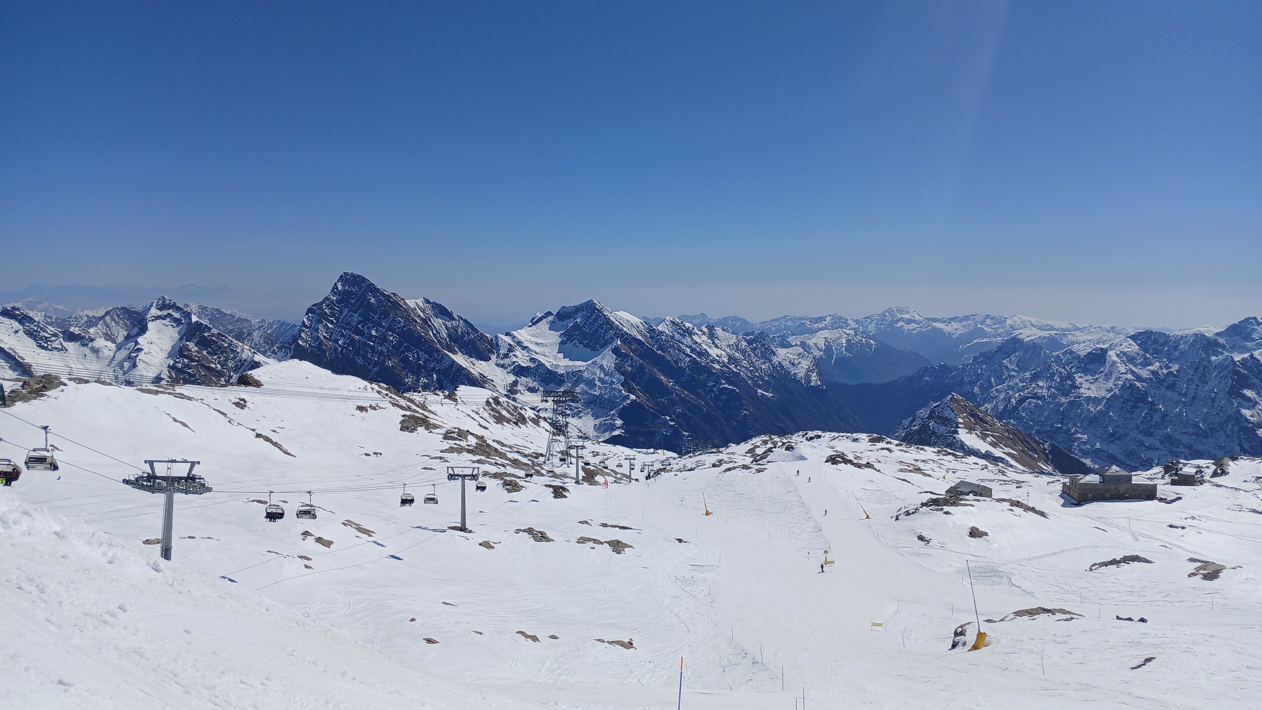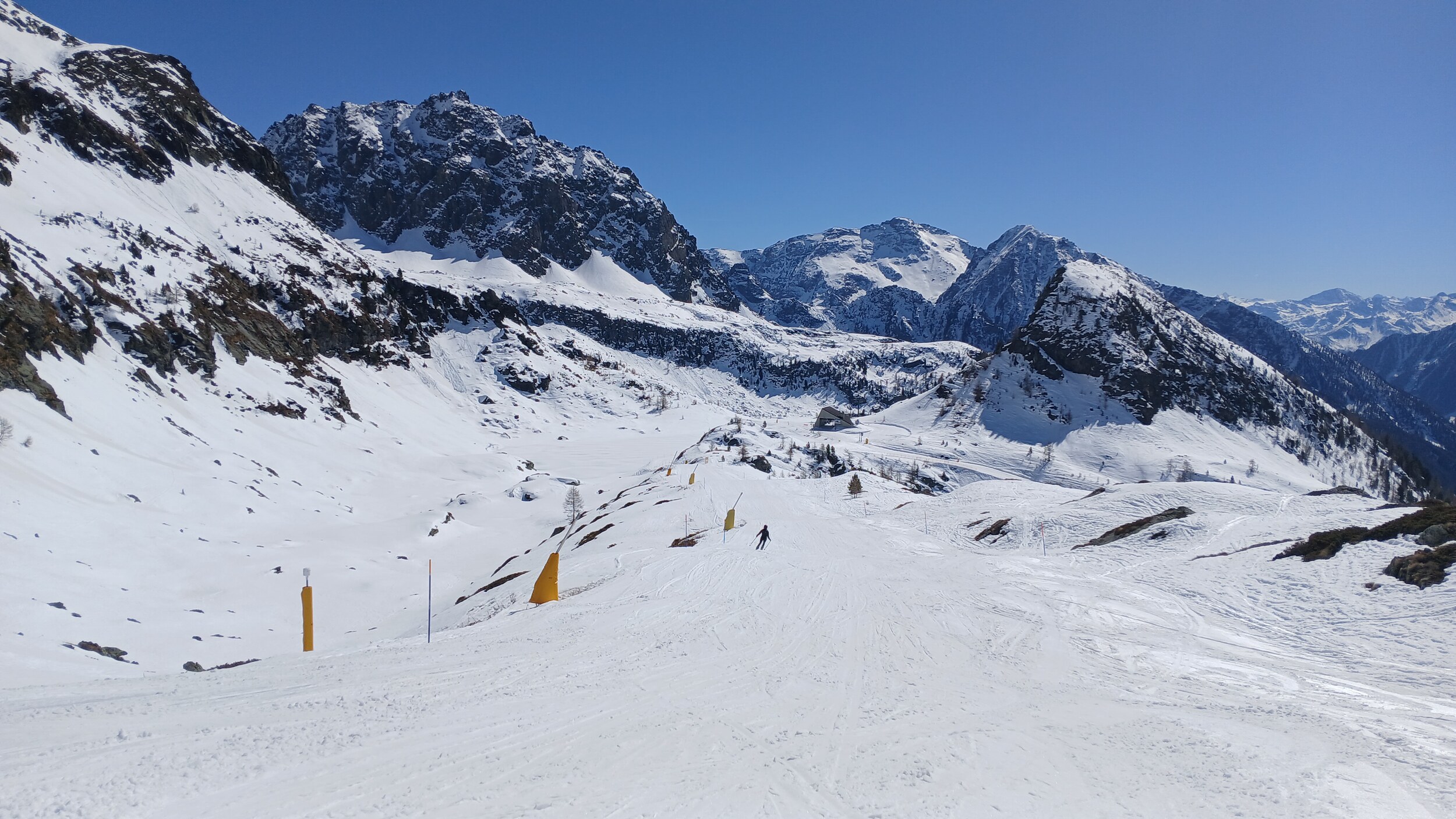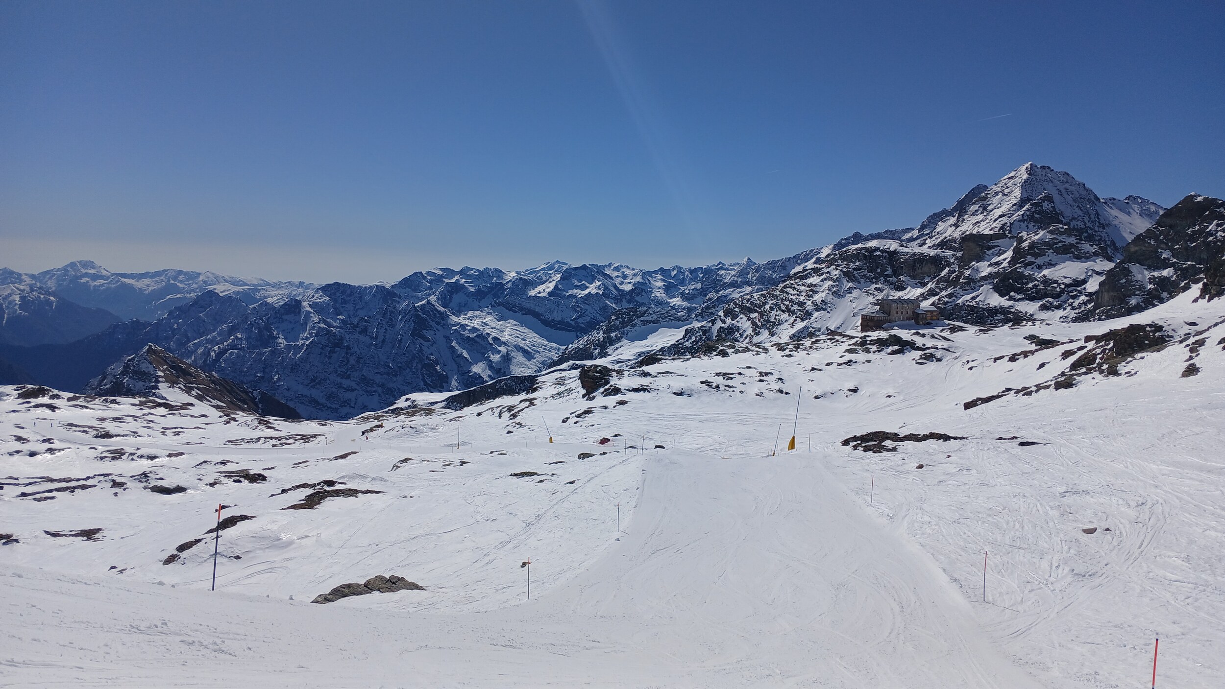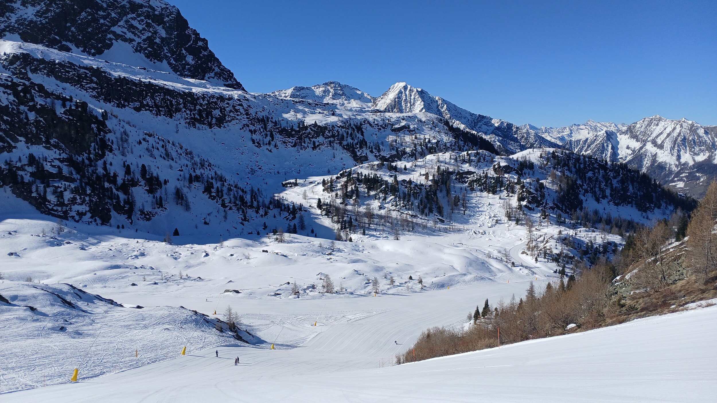 Von Campoluc aus fuhr ich das gesamte Gebiet ab. Es herrscht grundsätzlich Vollbetrieb. Nur die Talabfahrt nach Alagna ist schon geschlossen (ich vermute Schneemangel) und ein paar Pisten waren zeitweise für Training belegt. Man kommt an einem Tag ganz locker durch das gesamte Gebiet.