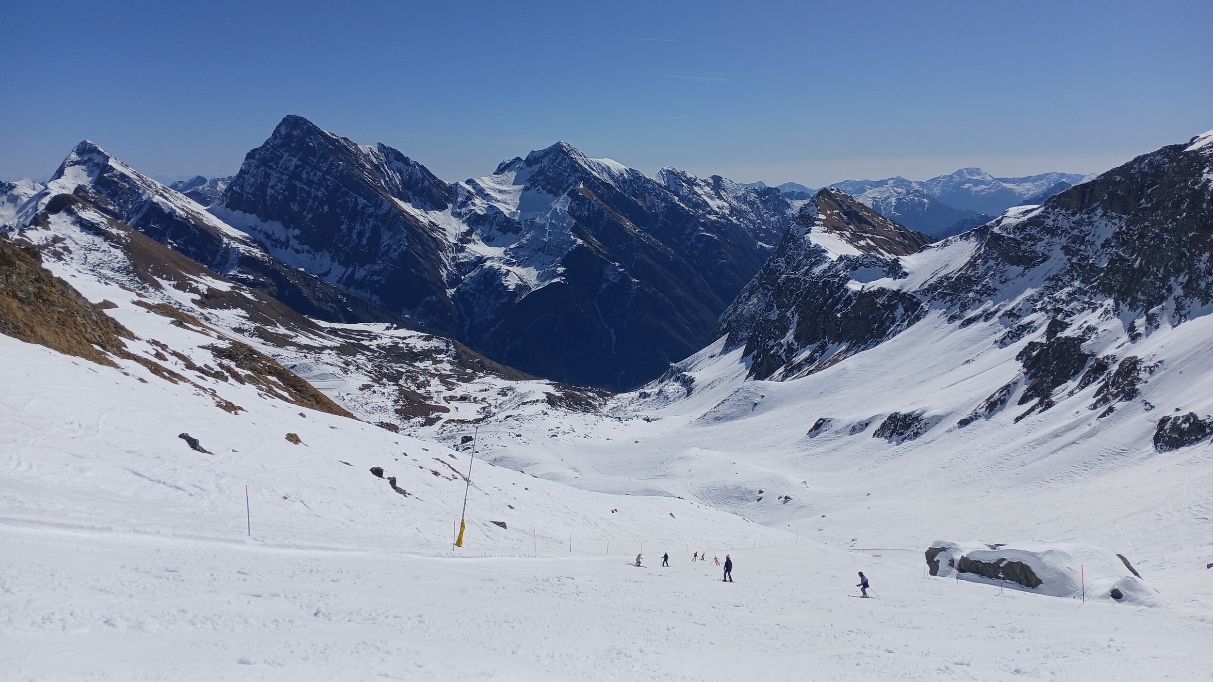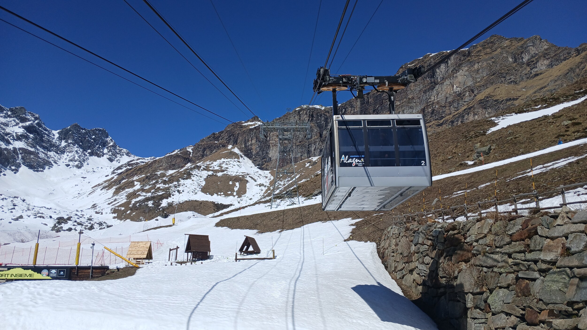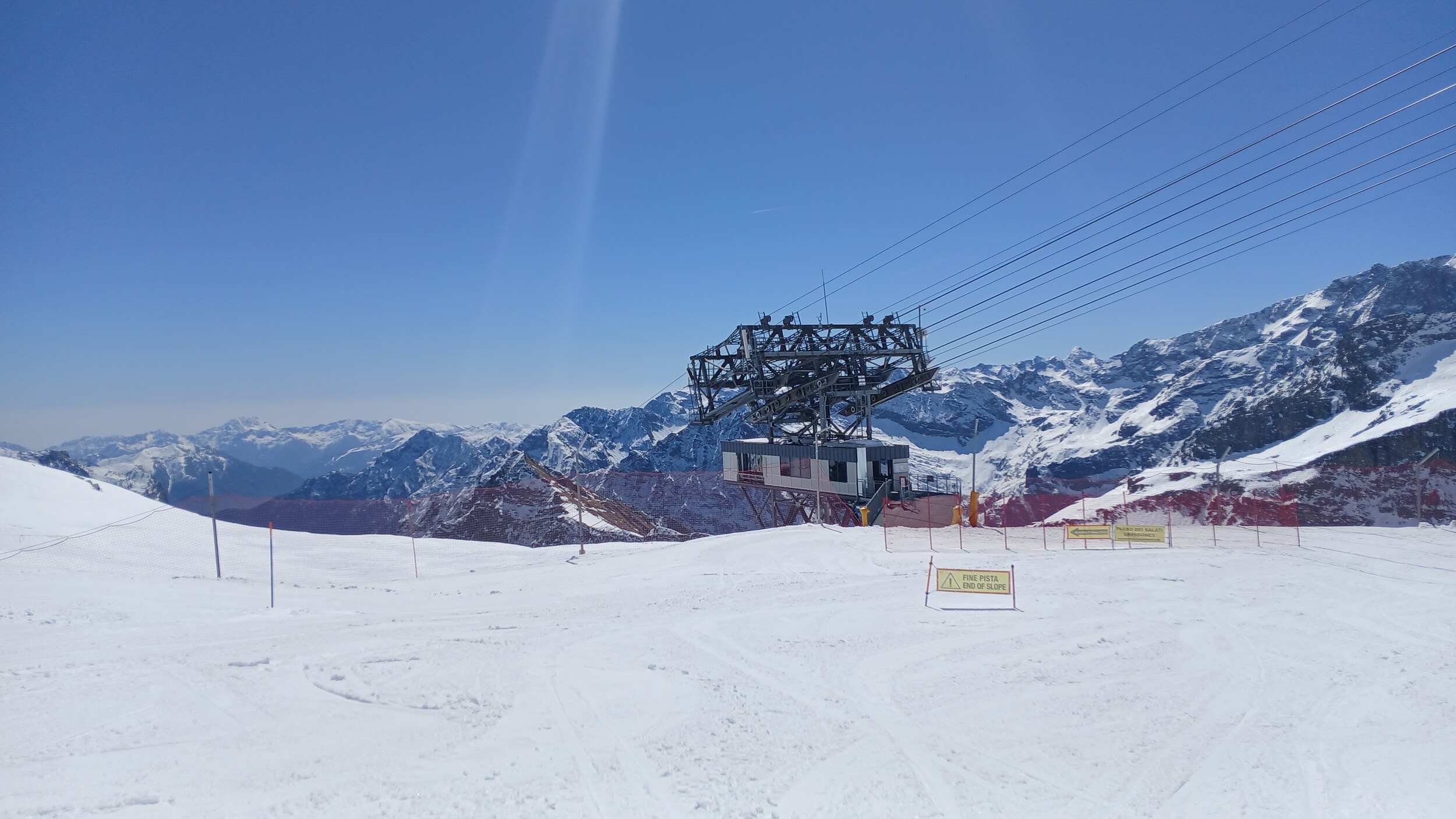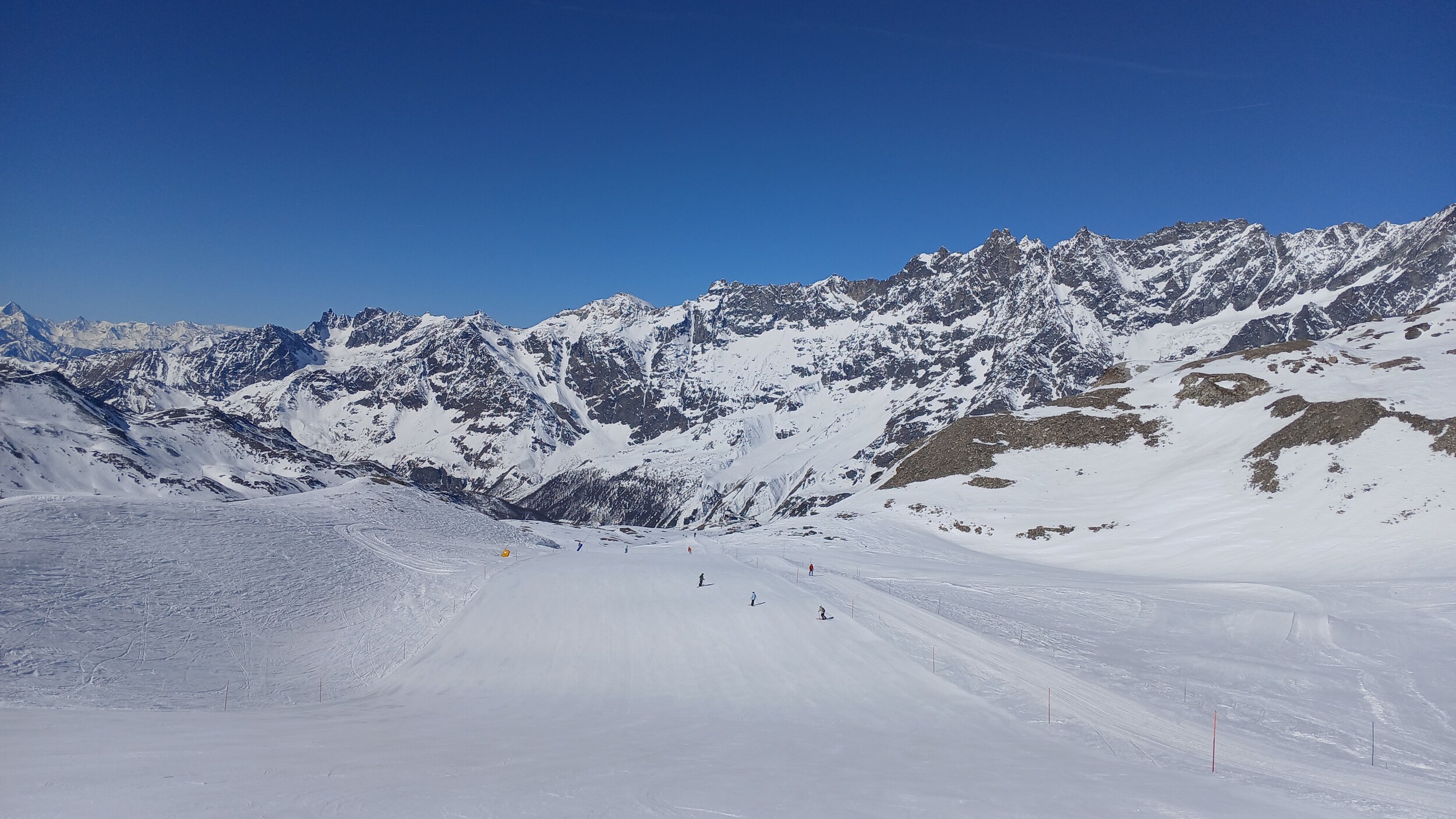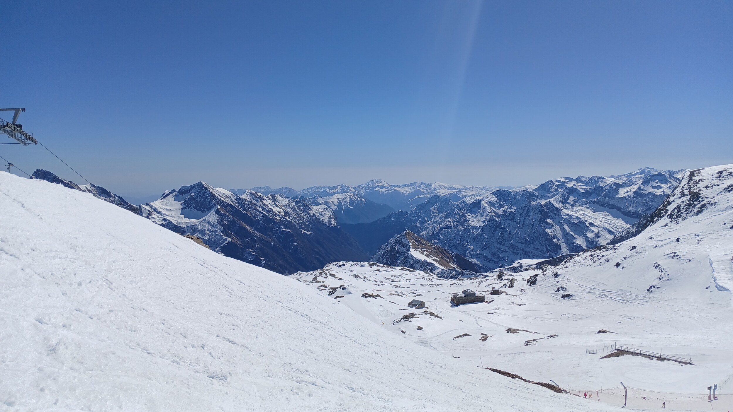 Von Campoluc aus fuhr ich das gesamte Gebiet ab. Es herrscht grundsätzlich Vollbetrieb. Nur die Talabfahrt nach Alagna ist schon geschlossen (ich vermute Schneemangel) und ein paar Pisten waren zeitweise für Training belegt. Man kommt an einem Tag ganz locker durch das gesamte Gebiet.