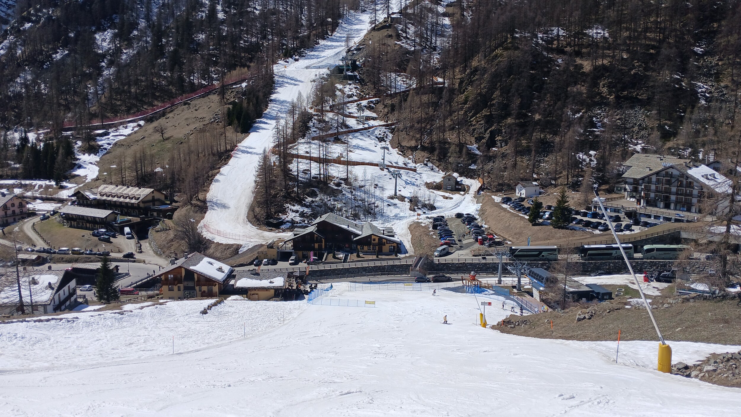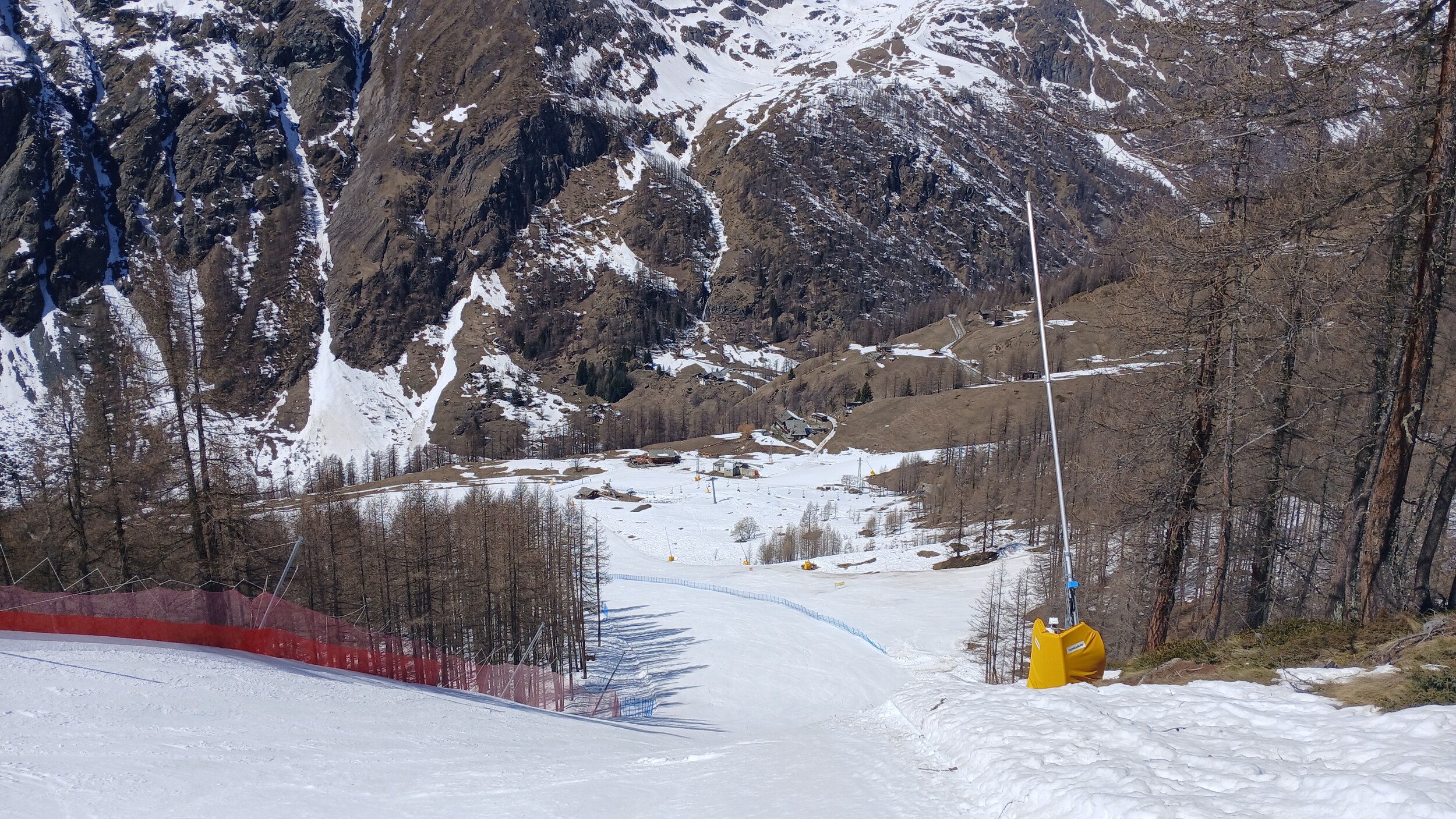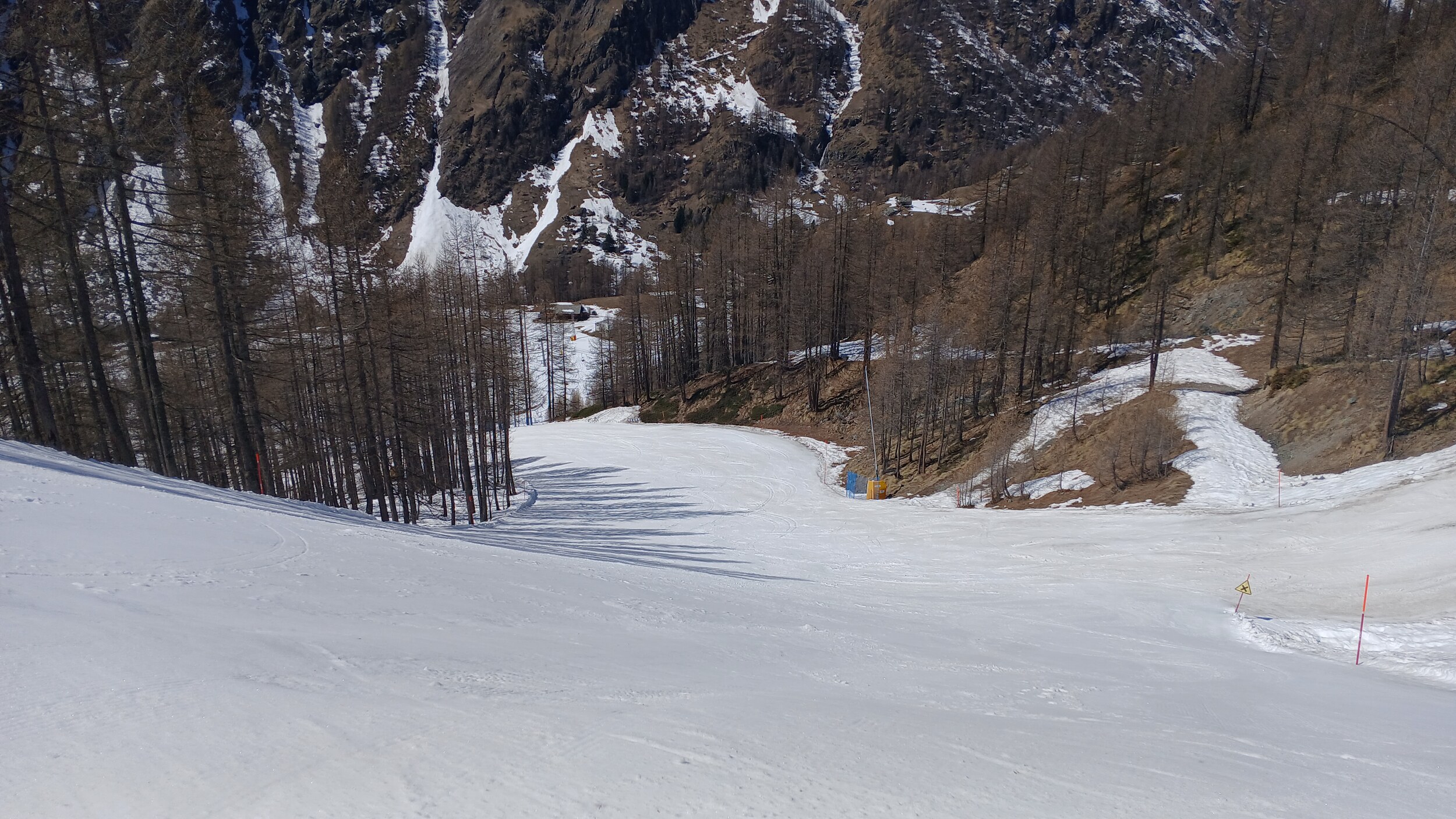 Wider erwarten war die Talabfahrt nach Campoluc noch hervorragend, sodass ich sie nach 16:30 Uhr noch drei Mal (!) fuhr. Gut, dass hier der Betriebsschluss erst um 16:45 Uhr ist, sodass ich um 16:42 Uhr noch einmal einsteigen konnte. Die tolle schwarze Talabfahrt liegt gut durch ein Tal und Bäume beschattet und hat sich so offenbar hervorragend gehalten. Echt kurios, bei über 20 Grad im Tal nach 16:30 Uhr eine Talabfahrt mehrmals zu wiederholen, aber was muss, das muss.