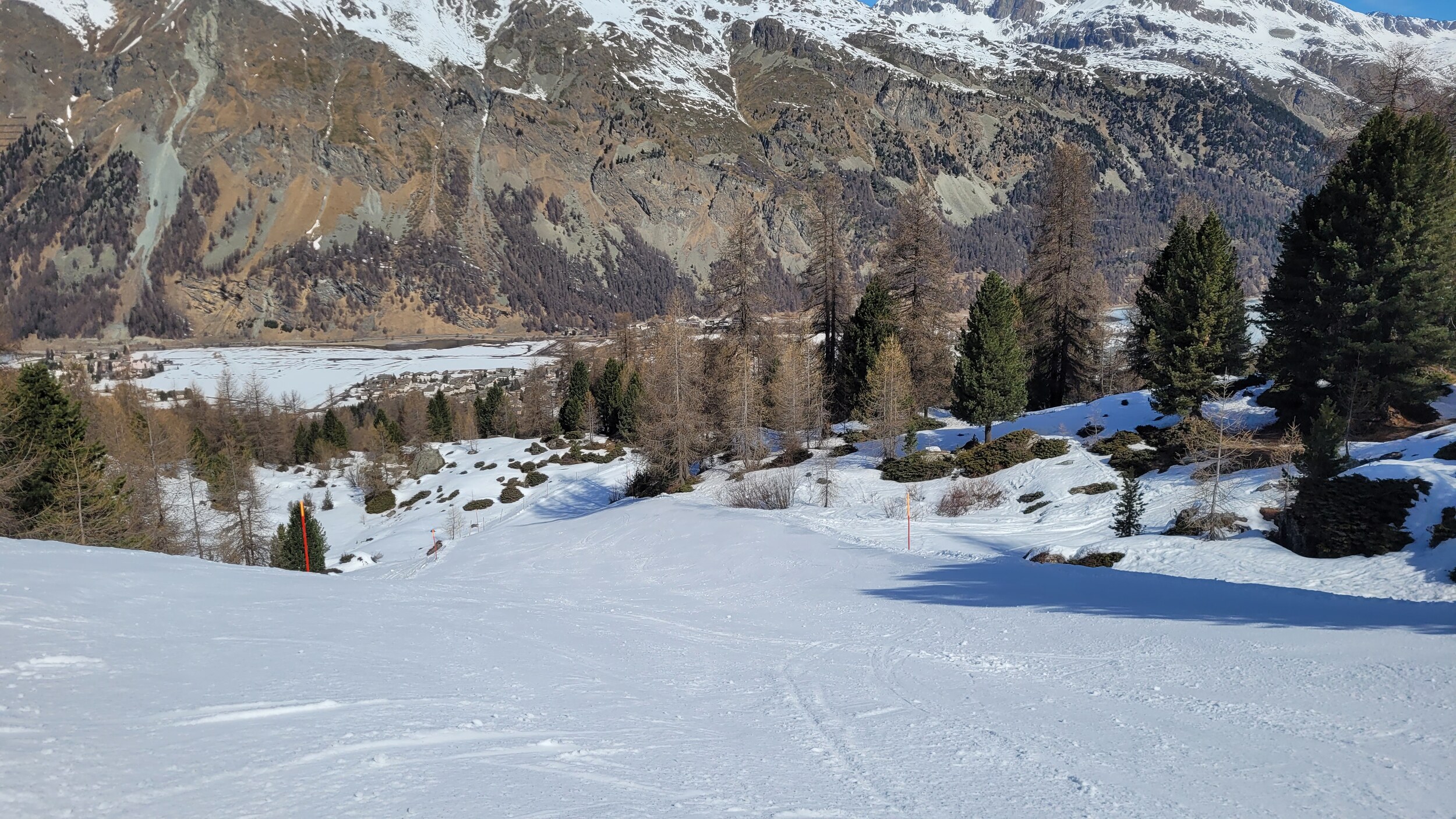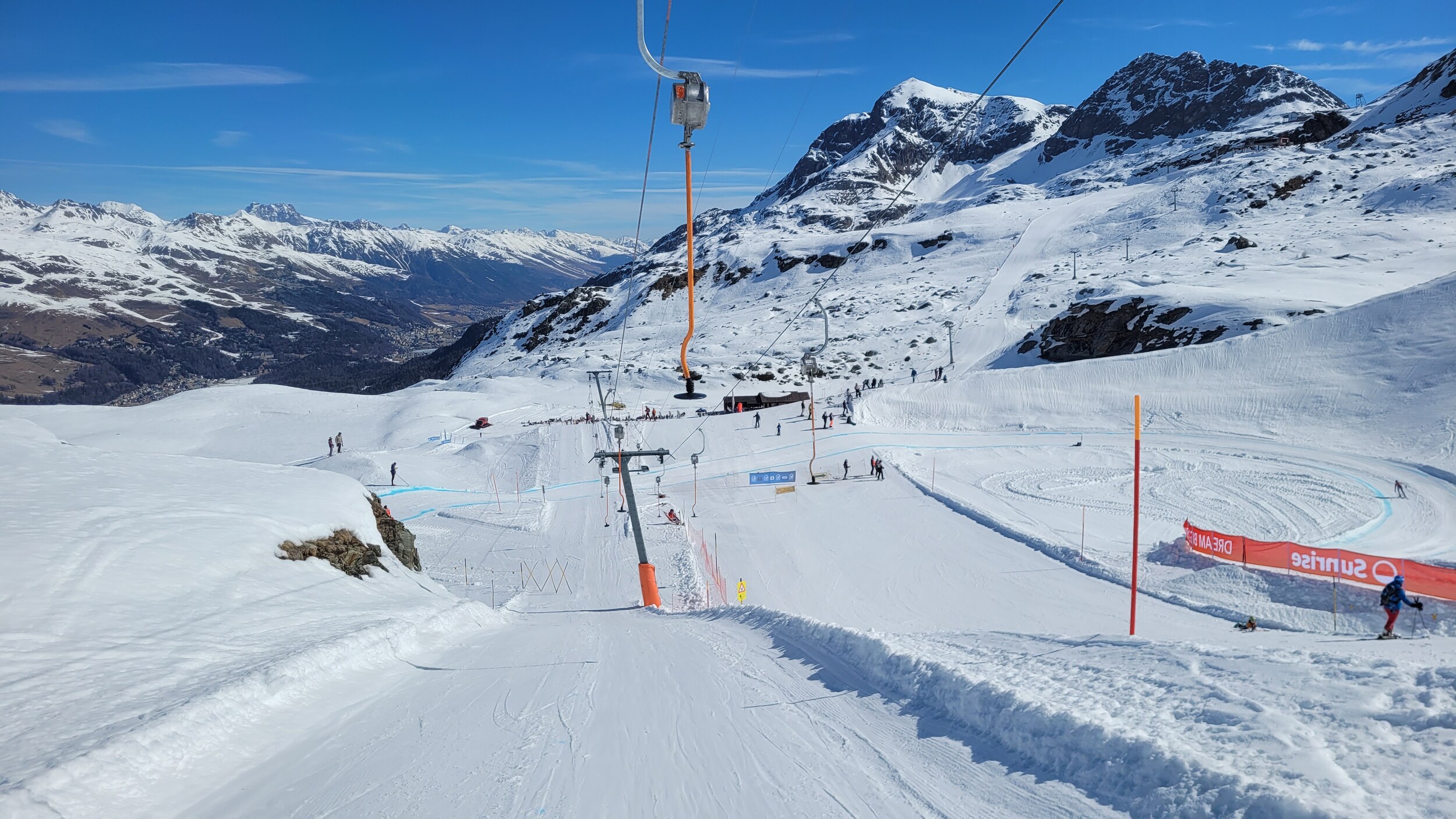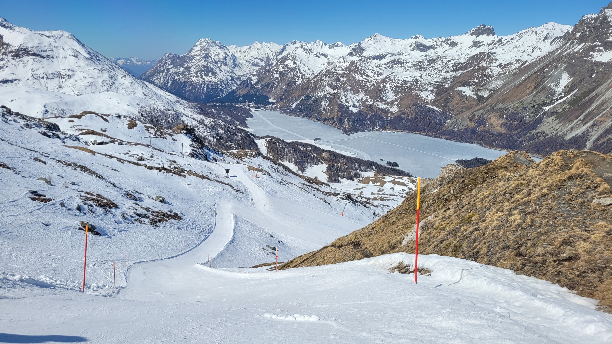Heute verwerte ich meinen letzten Ikon-Tag am Corvatsch. Das Parkhaus war nach 9h schon voll, ich parke aber auch lieber unten, solange der SL Cristins läuft. An der PB hab es etwas Rückstau, musste aber nur 10min warten. Die Piste 9/11 war teilweise etwas bröckelig. Die Seen tauen langsam auf.