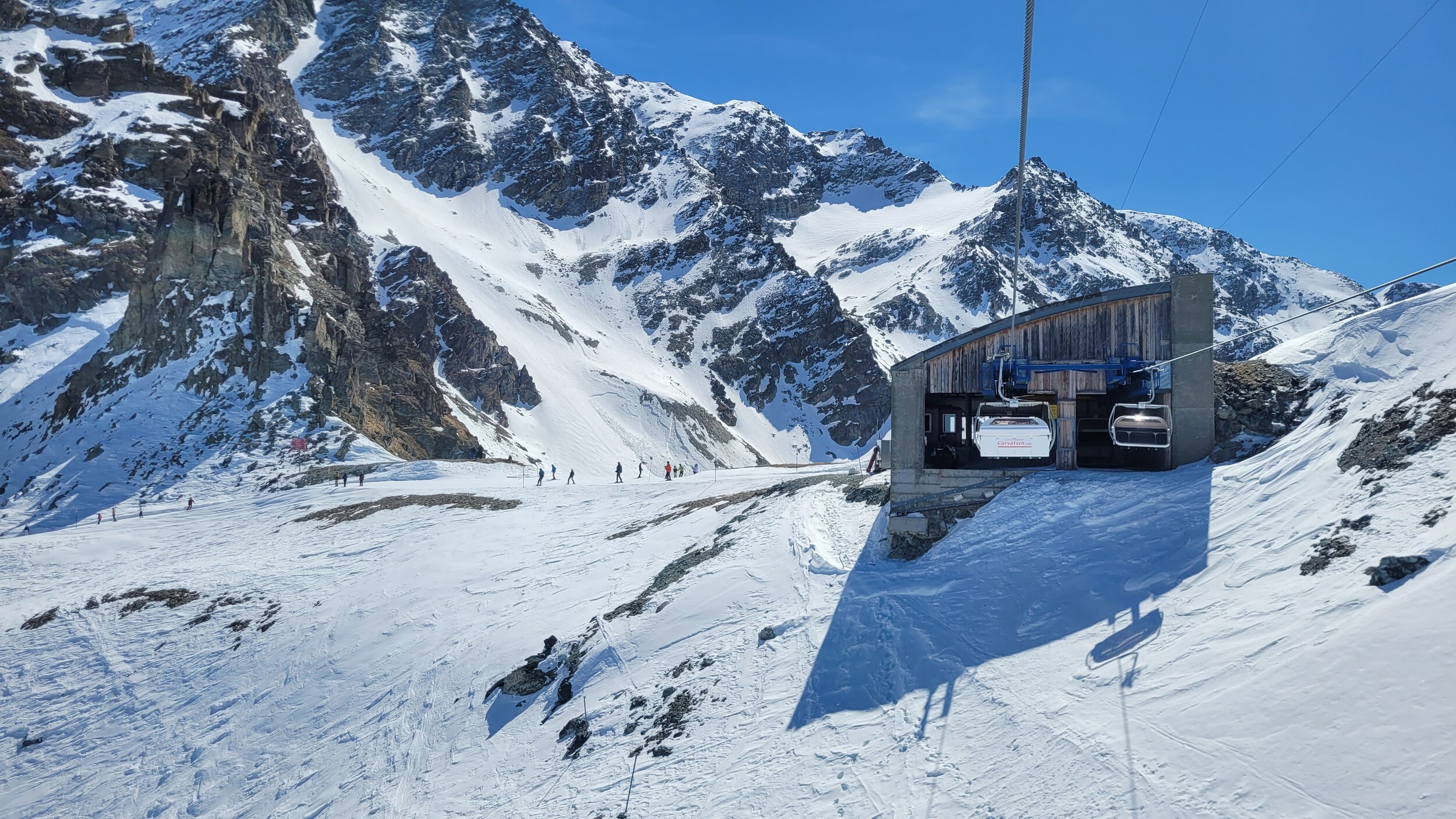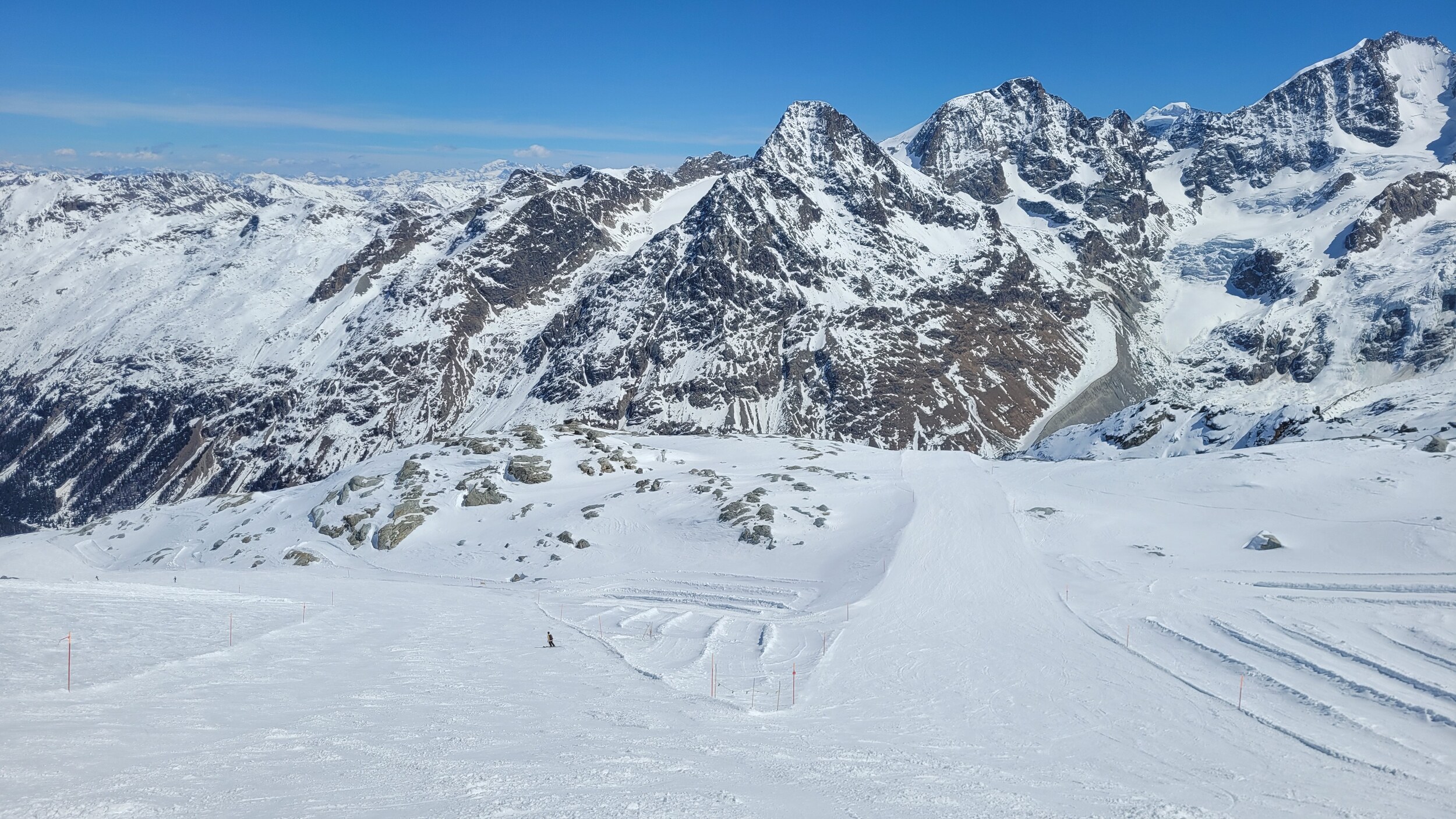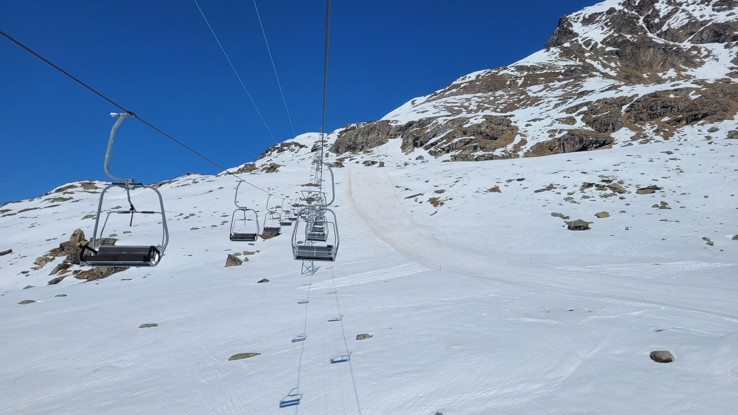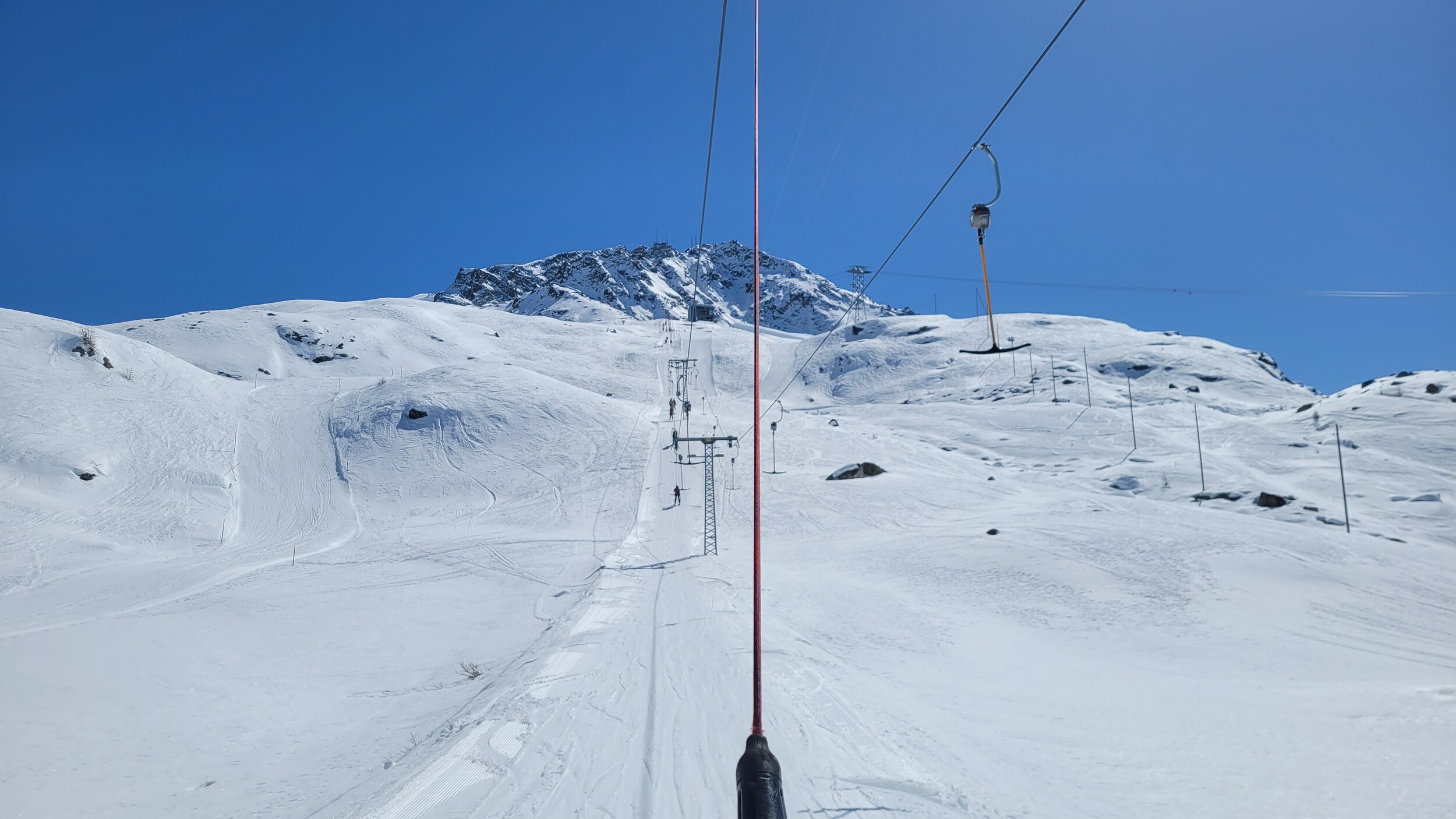 Die Furtschellas KSB wurde etwas entklappert, sonst alles wie bisher. Passt für mich, solange sie fehlerfrei weiterläuft. Die Pisten waren nach 12h immer noch top. Bei Piste 20 ist nur die Variante links offen (20a): Der Endhang am Crap Mellan SL hält sich auch sehr gut, obwohl es sehr mild ist. Die Piste 13 war auch noch so gut, dass ich eine Extrarunde gemacht habe. Der Furtschellas-Sektor hat voll überzeugt, und das ein Tag vor Saisonschluss. Jetzt muss ich langsam mal auf den Gipfel.. .. von dem die Sicht immer wieder atemberaubend ist. Ganz oben ist es 14h sulzig, weiter unten haben sich die Pisten besser gehalten. An Mandra gibt es ein paar Minuten Wartezeit, der Park ist recht gut besucht. Es riecht auch entsprechend nach Gras