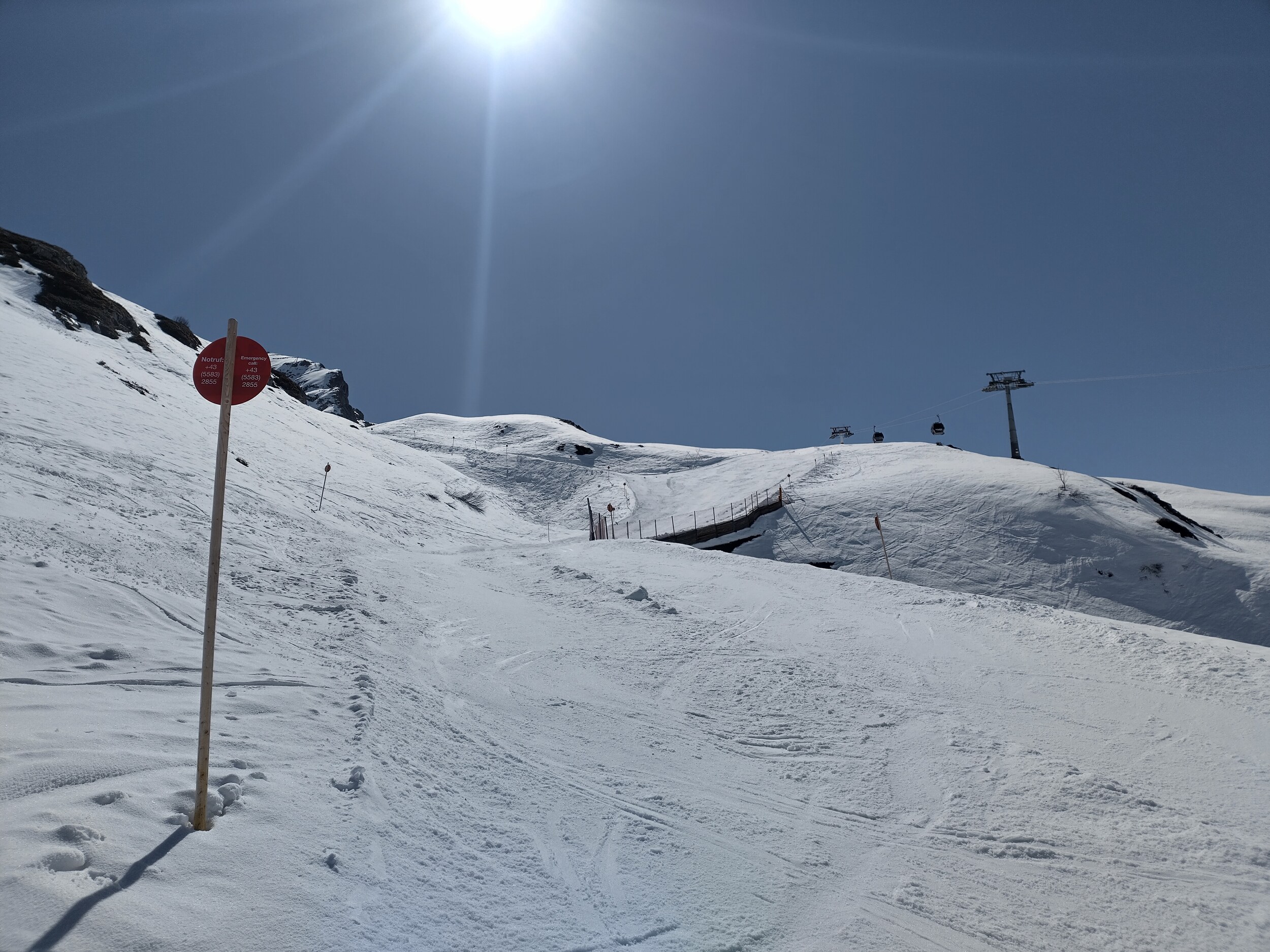 Mit der ersten Gondel rauf, aber dann die anderen grosszügig vorgelassen betreffend Vorspuren im leichten Gegenanstieg