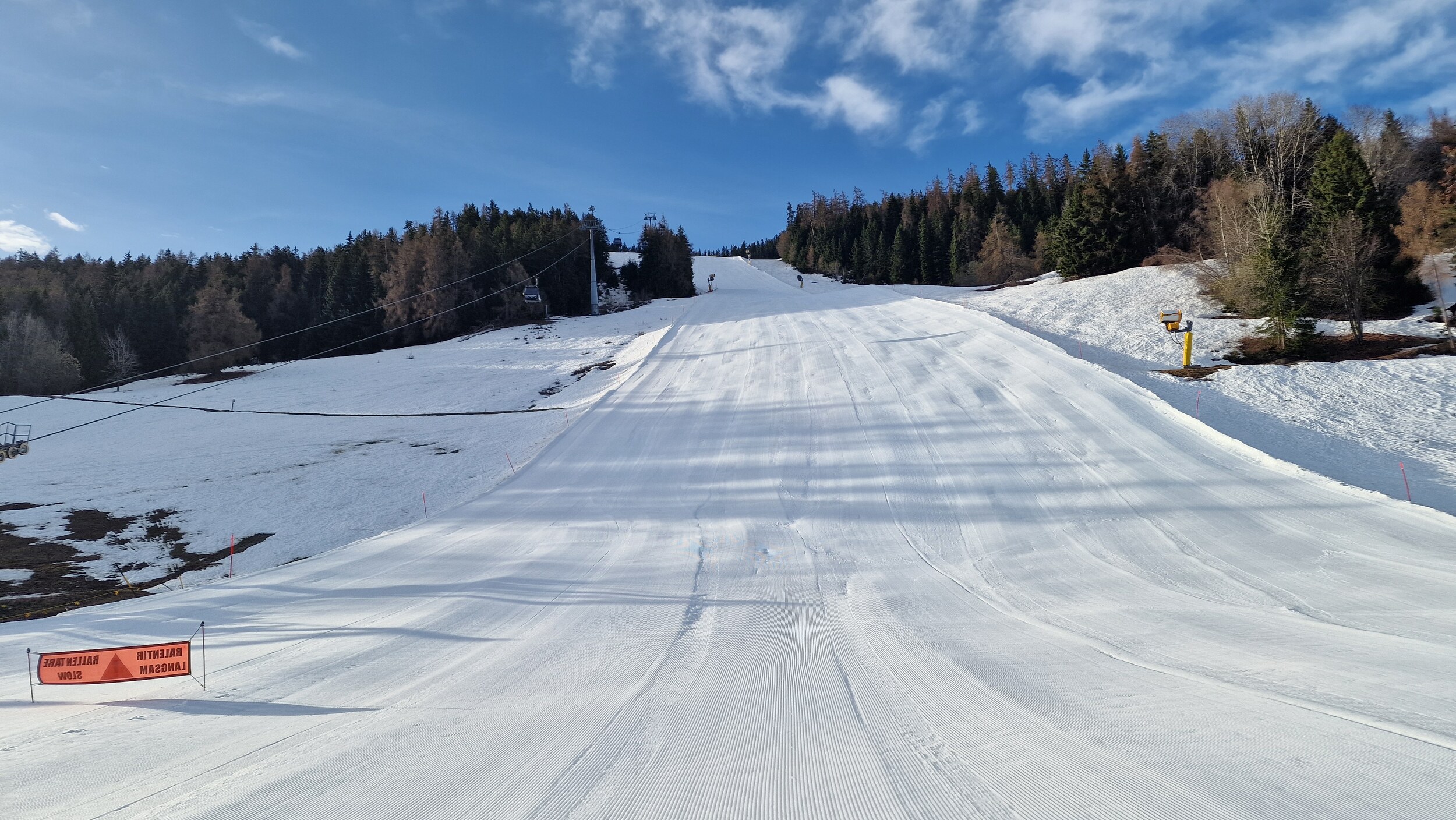 Am Nachmittag Frühlingsschnee, aber trotzdem gut. Ein wunderschöner Tag. Fast Vollbetrieb.