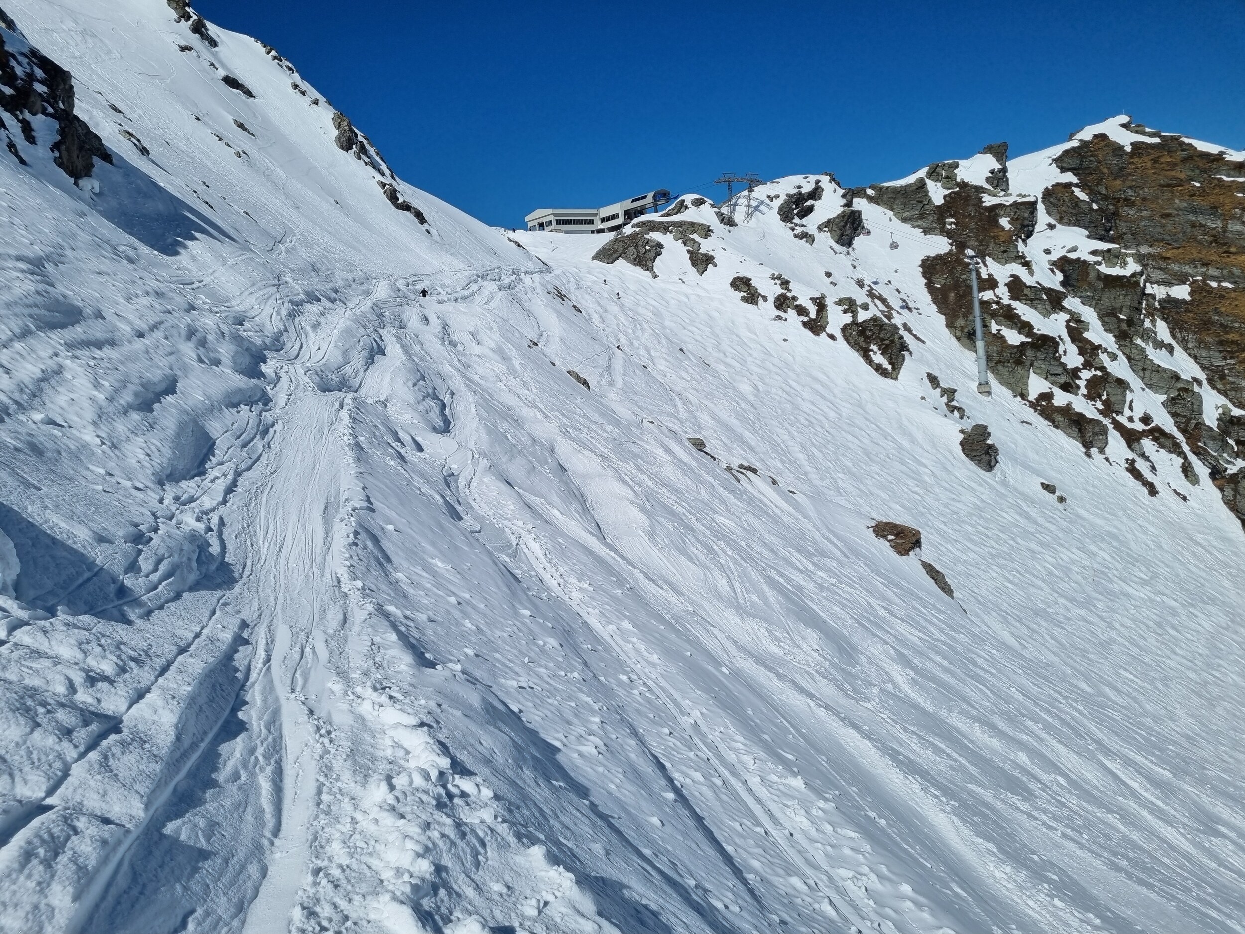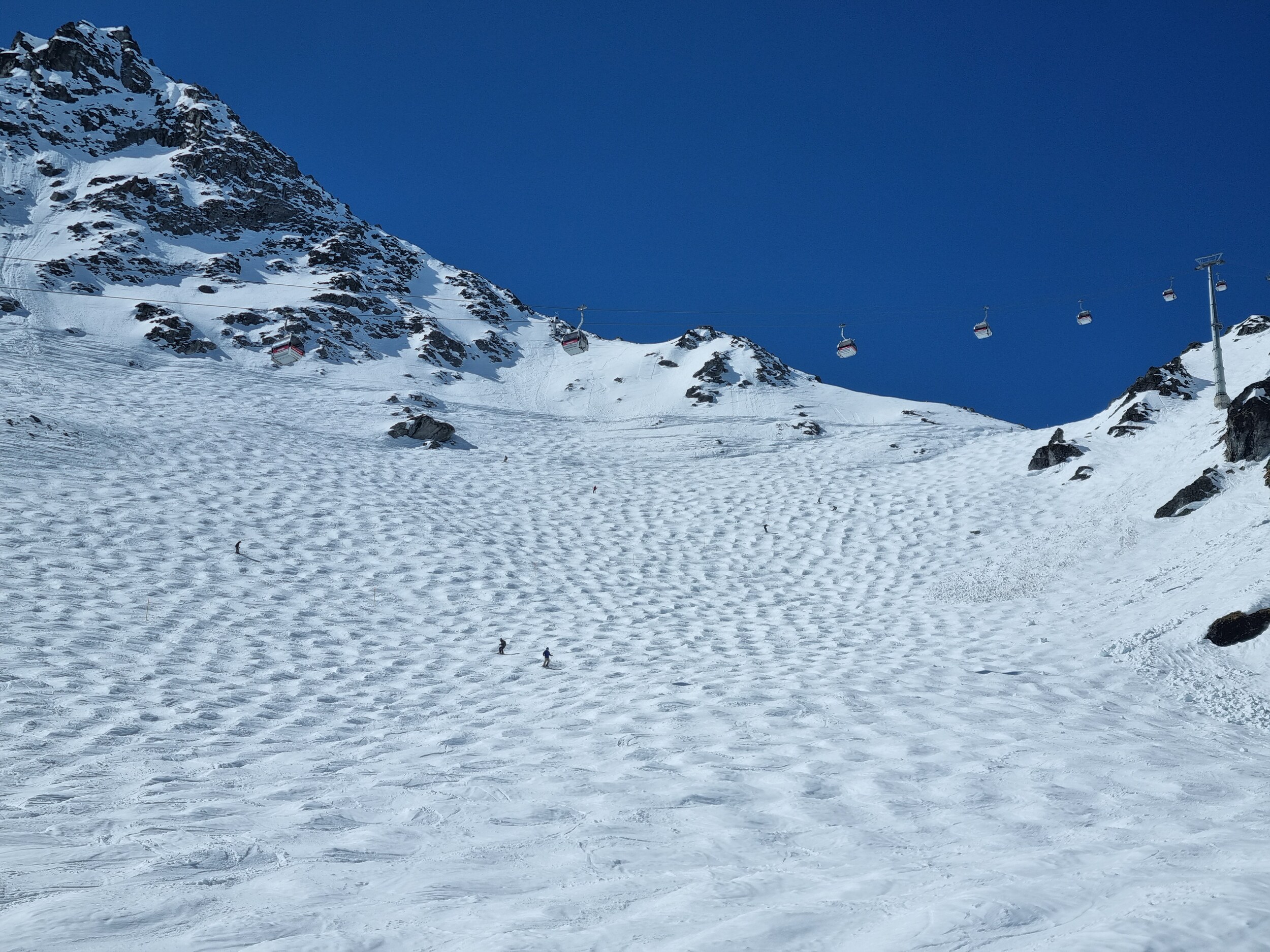 Sehr warm, Start daher sehr früh um Punkt 0845 wichtig. Talabfahrt Veysonnaz war oben sehr gut, unterer Teil aber sehr grenzwertig präpariert.