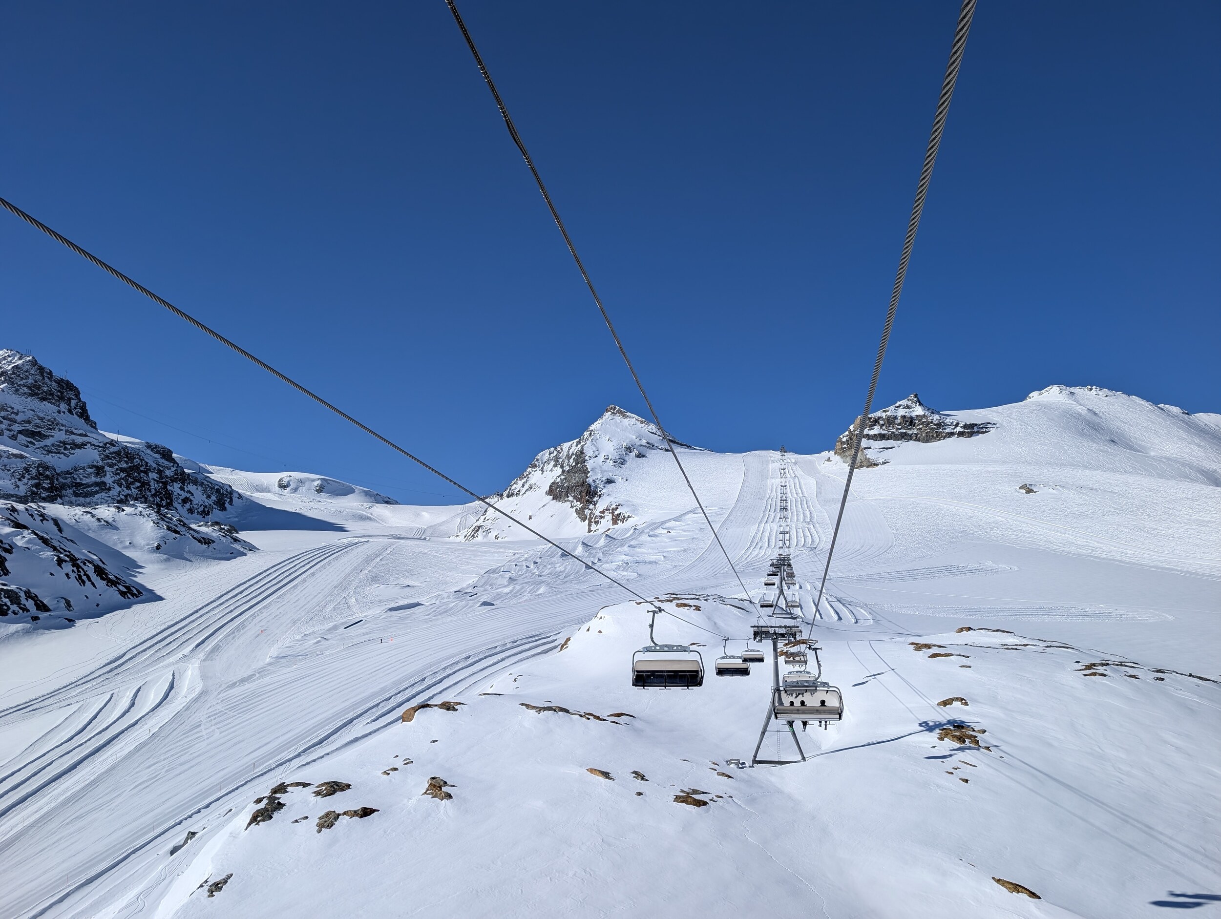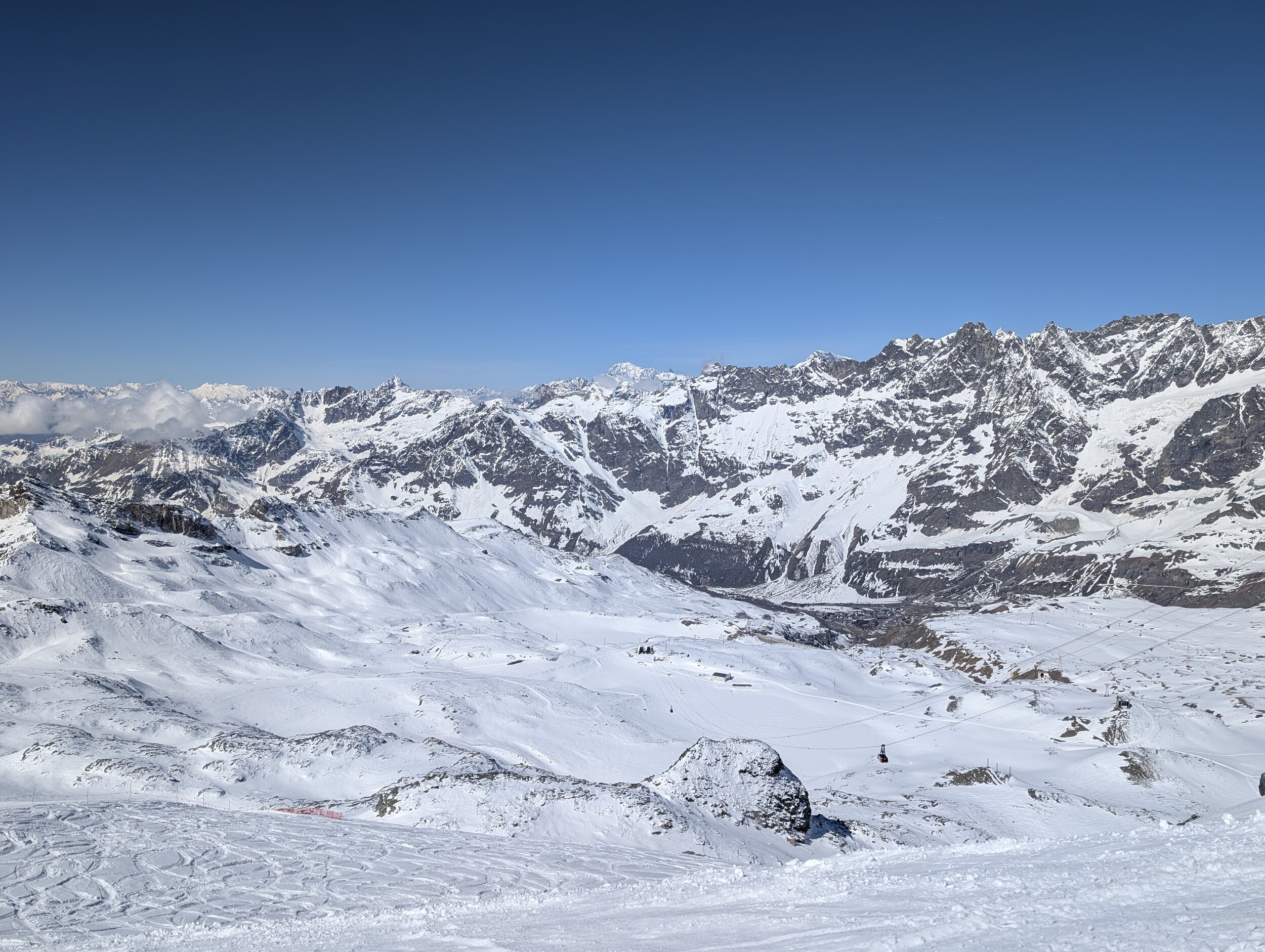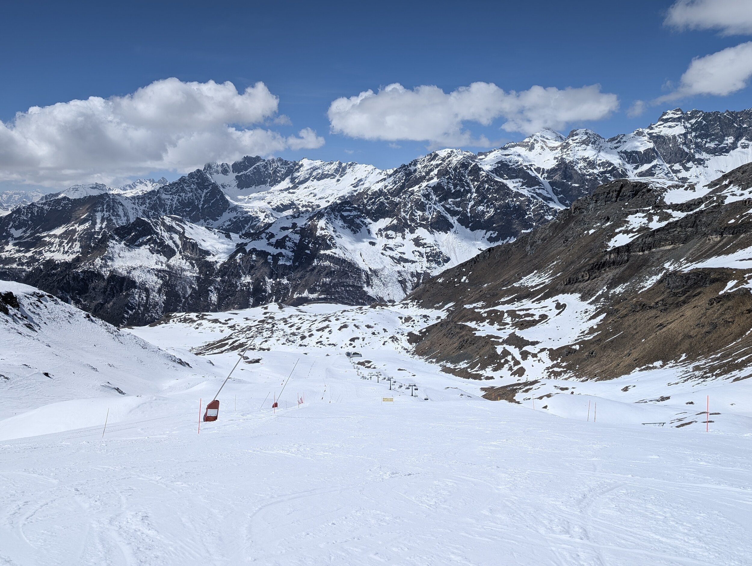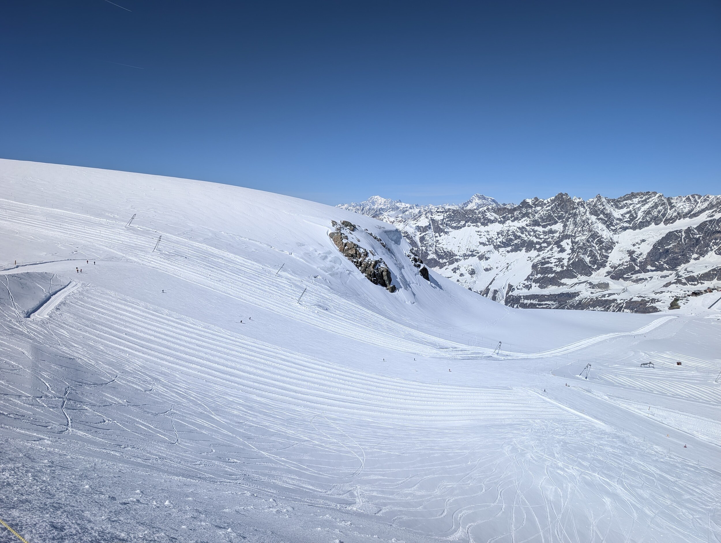 Zum Start einige Fahrten am Furggsattel mit Pulverschnee bis ca. 3000 Meter über Meer, anschliessend wurden die Pisten in Richtung Trockener Steg sowie auch Richtung Furgg hart. Hart, mit guten Kanten aber richtig krass zu carven. Top! Anschliessend einmal auf den Gipfel um immerhin ein wenlg ins Schnaufen zu kommen. Der Walk vom Ausstieg der 3S in Richtung Piste fühlt sich im Kopf jedes Mal ähnlich an. Die 3S hat übrigens etwas gezickt, scheinbar hat ein Sensor angeschlagen, genau dort wo jeweils die Kabinen geschlossen werden. Die Ventina war gegen 11.15 Uhr ziemlich knollig und leider nicht so schön zu fahren. Dafür weiter unten dann umso besser. So nehmen wir die 1800hm bis zum Cielo Alto (meine Erstbefahrung) in Angriff. Oben noch hart wurde es Höhenmeter für Höhenmeter weicher ehe wir am Cielo Alto eine super weiche und auch super leere Piste geniessen durften. Nach einem kurzen Kaffeestopp auf Plan Maison machen wir uns auf in Richtung Valtournenche wo wir gegen Mittag auf perfekt aufgesulzte Pisten getroffen sind. Die Reine Blanche ein menschenleerer Sulztraum von oben bis unten.