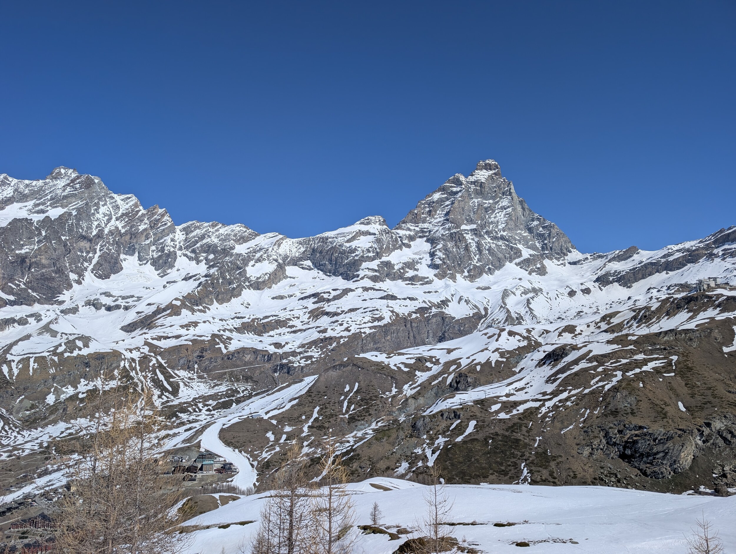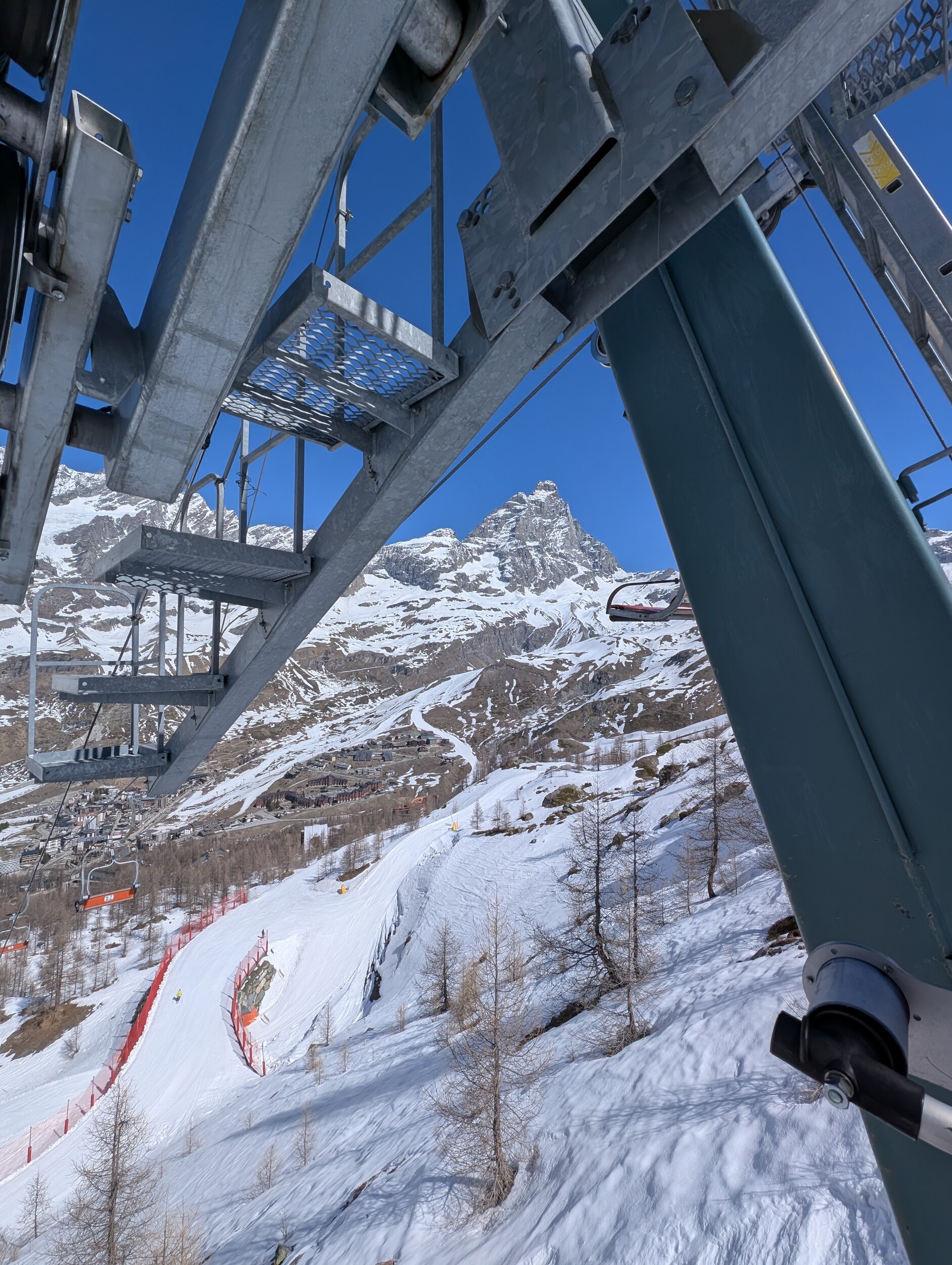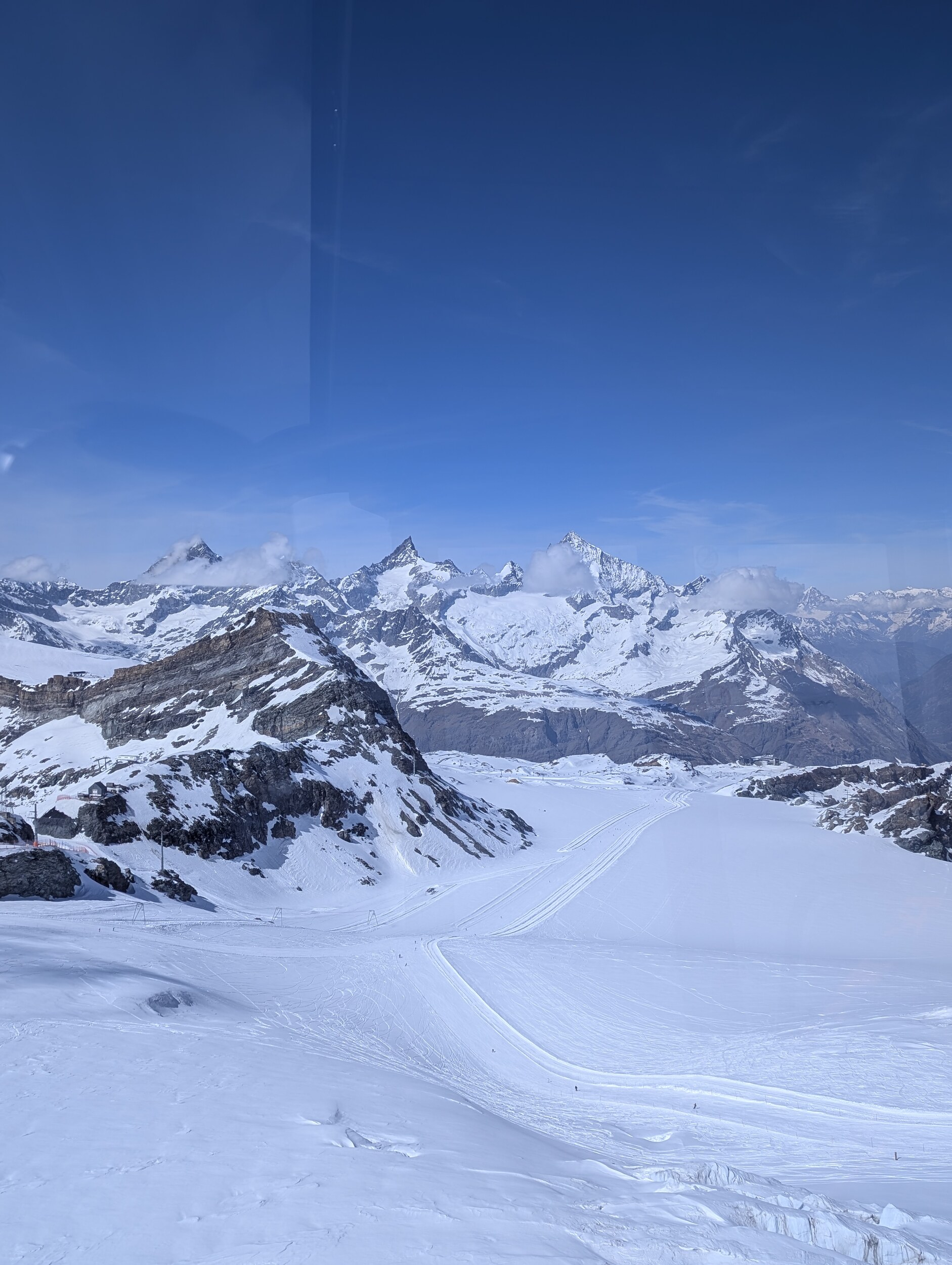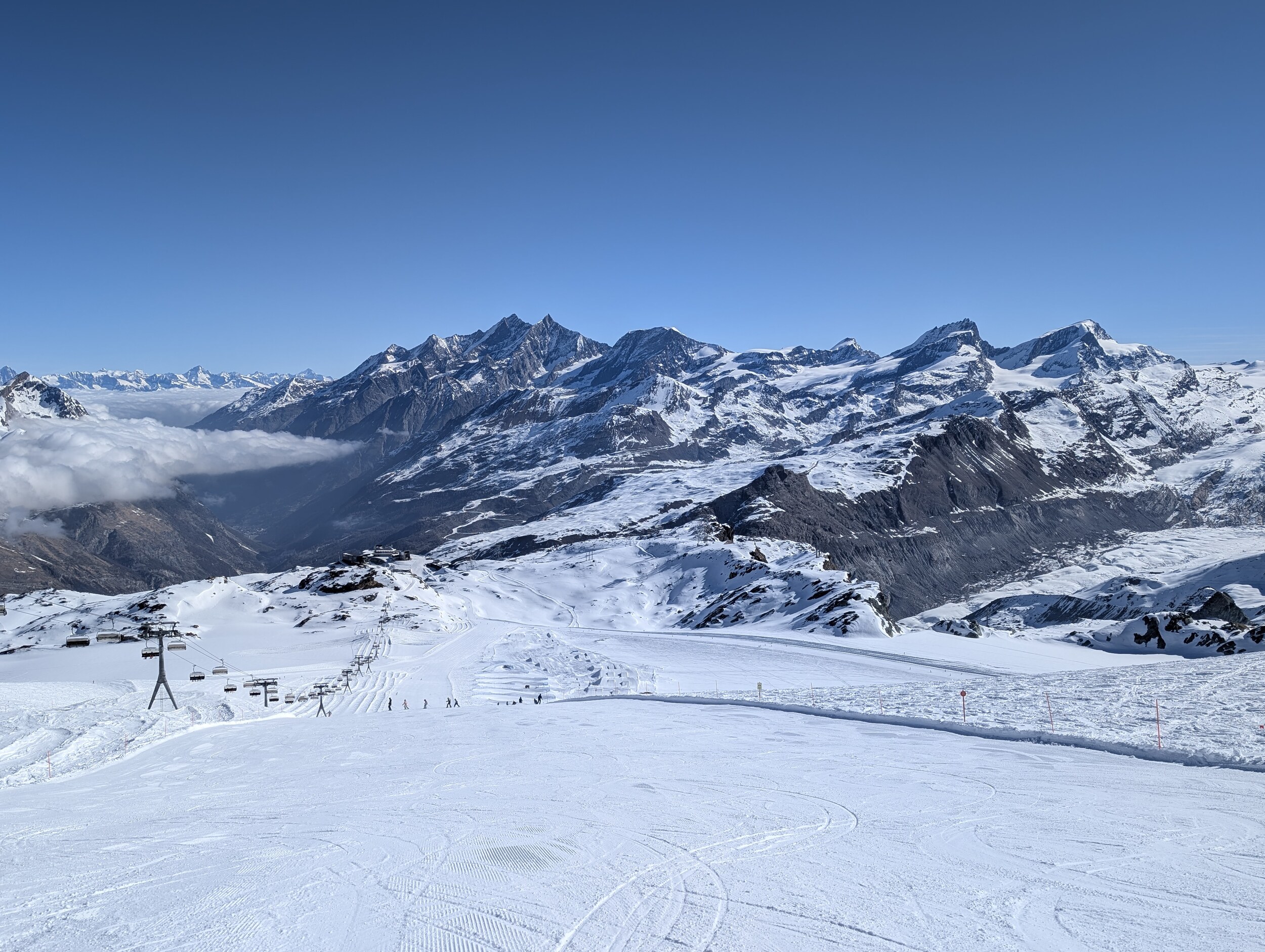 Zum Start einige Fahrten am Furggsattel mit Pulverschnee bis ca. 3000 Meter über Meer, anschliessend wurden die Pisten in Richtung Trockener Steg sowie auch Richtung Furgg hart. Hart, mit guten Kanten aber richtig krass zu carven. Top! Anschliessend einmal auf den Gipfel um immerhin ein wenlg ins Schnaufen zu kommen. Der Walk vom Ausstieg der 3S in Richtung Piste fühlt sich im Kopf jedes Mal ähnlich an. Die 3S hat übrigens etwas gezickt, scheinbar hat ein Sensor angeschlagen, genau dort wo jeweils die Kabinen geschlossen werden. Die Ventina war gegen 11.15 Uhr ziemlich knollig und leider nicht so schön zu fahren. Dafür weiter unten dann umso besser. So nehmen wir die 1800hm bis zum Cielo Alto (meine Erstbefahrung) in Angriff. Oben noch hart wurde es Höhenmeter für Höhenmeter weicher ehe wir am Cielo Alto eine super weiche und auch super leere Piste geniessen durften. Nach einem kurzen Kaffeestopp auf Plan Maison machen wir uns auf in Richtung Valtournenche wo wir gegen Mittag auf perfekt aufgesulzte Pisten getroffen sind. Die Reine Blanche ein menschenleerer Sulztraum von oben bis unten.