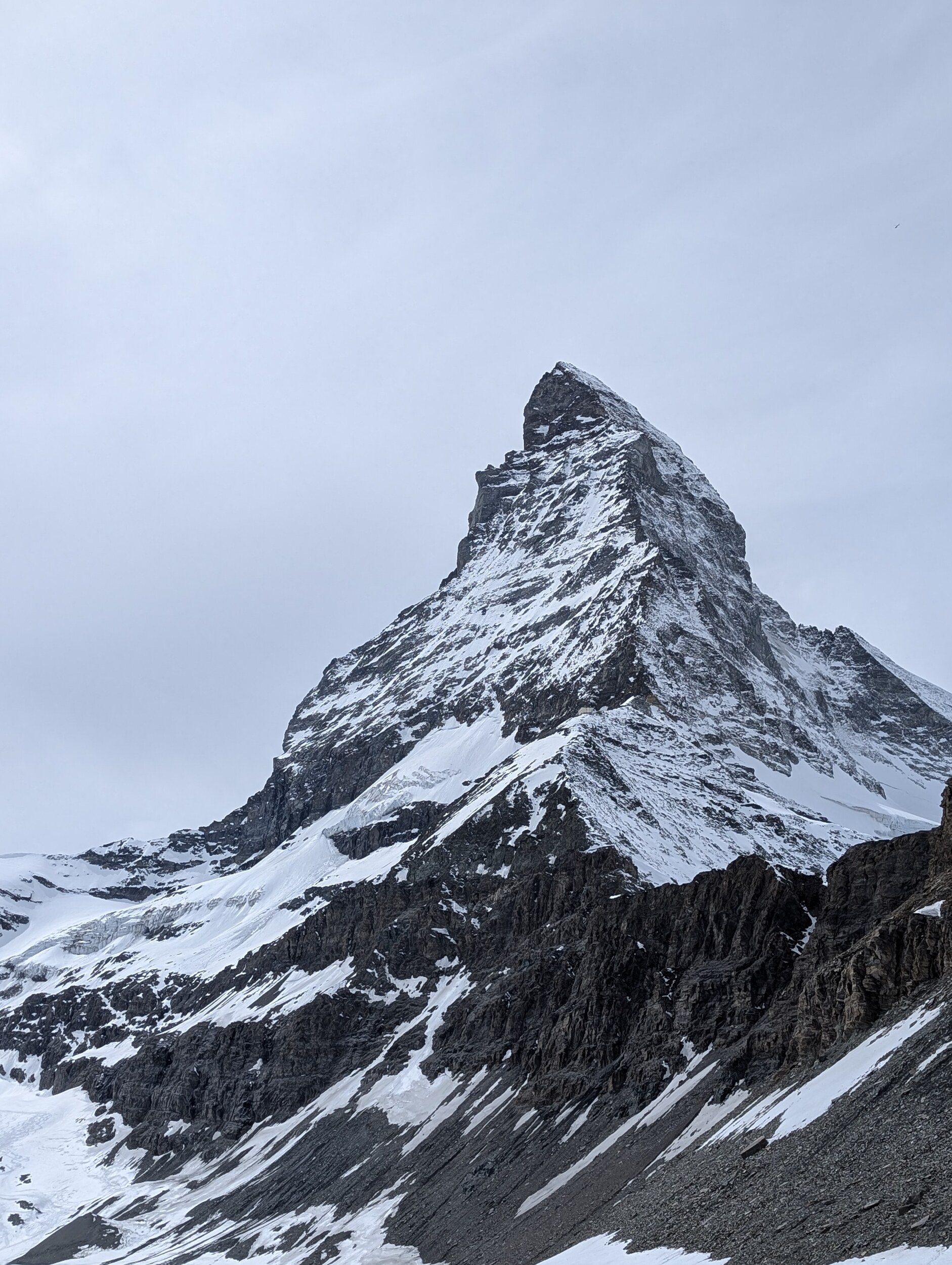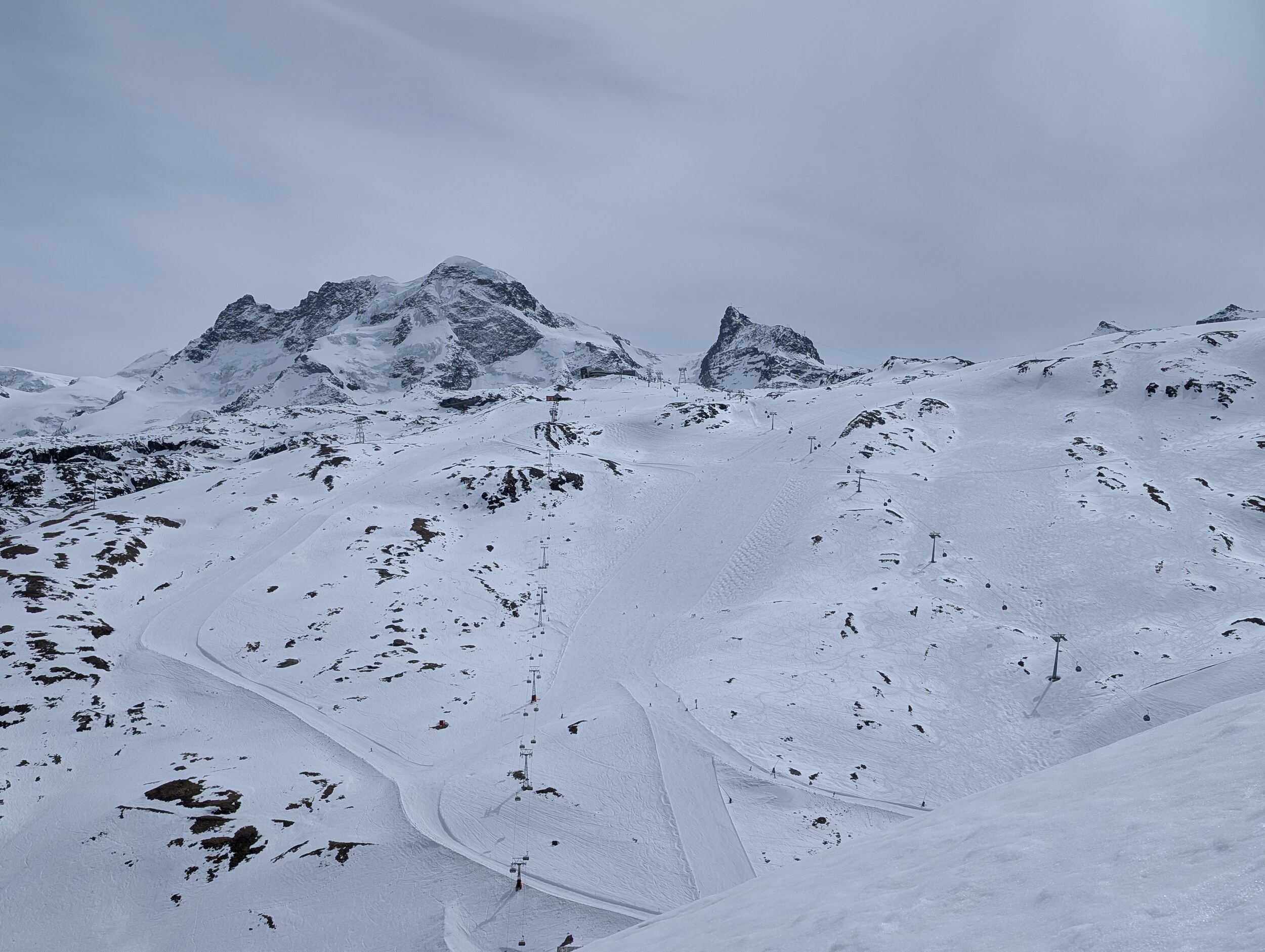 Die Pisten unter dem Matterhorn leider bereits sehr weich und der Sessel ultralangsam. Also nur eine Fahrt und dann via Aroleid-Schwarzsee runter ins Tal. Die schwarze Talabfahrt ist nicht mehr schön zu fahren. Super viele Steine, teilweise grosse Felsblöcke in der Mitte der Piste, und um 14.30 Uhr sehr fest zerfahren. Kann gerne schliessen (die Lawinenhänge sind auch grossflächig gesprengt worden, Schnee liegt genug, wenn nur die Steine nicht wären...). Gut, dass wir keine erwischt haben. Nachdem wir mit einem Grinsen die Kelle gefahren sind, sagen wir uns dass wir uns Hirli definitiv hätten ersparen können, wenn wir gewusst hätten, dass Hohtälli mit der White Hare auch zwischen 15 und 16 Uhr noch absolut top und ultraleer zu fahren war. Wiederholungsfahren und dann via Riffelberg ins Tal. Dann also morgen nochmals