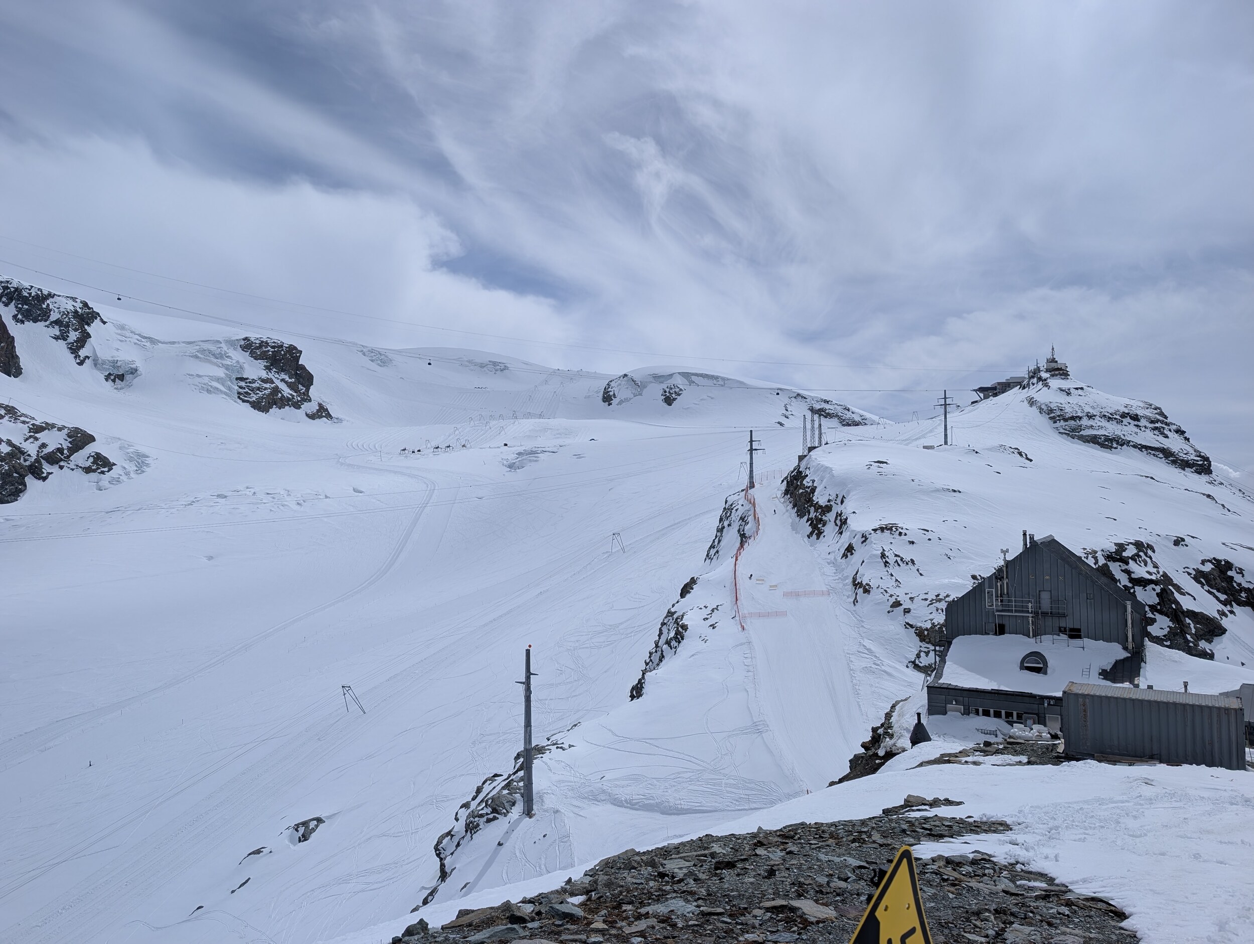Zum Start einige Fahrten am Furggsattel mit Pulverschnee bis ca. 3000 Meter über Meer, anschliessend wurden die Pisten in Richtung Trockener Steg sowie auch Richtung Furgg hart. Hart, mit guten Kanten aber richtig krass zu carven. Top! Anschliessend einmal auf den Gipfel um immerhin ein wenlg ins Schnaufen zu kommen. Der Walk vom Ausstieg der 3S in Richtung Piste fühlt sich im Kopf jedes Mal ähnlich an. Die 3S hat übrigens etwas gezickt, scheinbar hat ein Sensor angeschlagen, genau dort wo jeweils die Kabinen geschlossen werden. Die Ventina war gegen 11.15 Uhr ziemlich knollig und leider nicht so schön zu fahren. Dafür weiter unten dann umso besser. So nehmen wir die 1800hm bis zum Cielo Alto (meine Erstbefahrung) in Angriff. Oben noch hart wurde es Höhenmeter für Höhenmeter weicher ehe wir am Cielo Alto eine super weiche und auch super leere Piste geniessen durften. Nach einem kurzen Kaffeestopp auf Plan Maison machen wir uns auf in Richtung Valtournenche wo wir gegen Mittag auf perfekt aufgesulzte Pisten getroffen sind. Die Reine Blanche ein menschenleerer Sulztraum von oben bis unten.