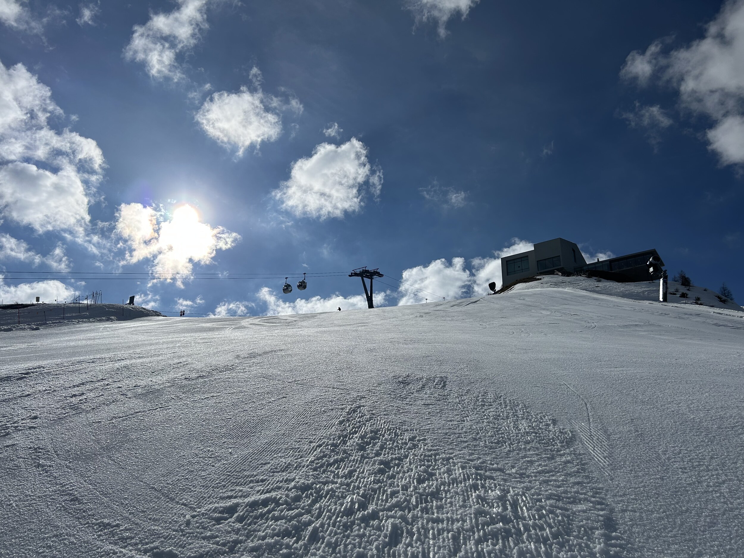 Es geht weiter Richtung Sonne und Pre de Peres. Dort ist der Schnee im Trainingsareal wirklich genial. Über Sonne und Marchner (auch noch gut) geht es nun wieder Richtung Alpen zum Mittagessen.