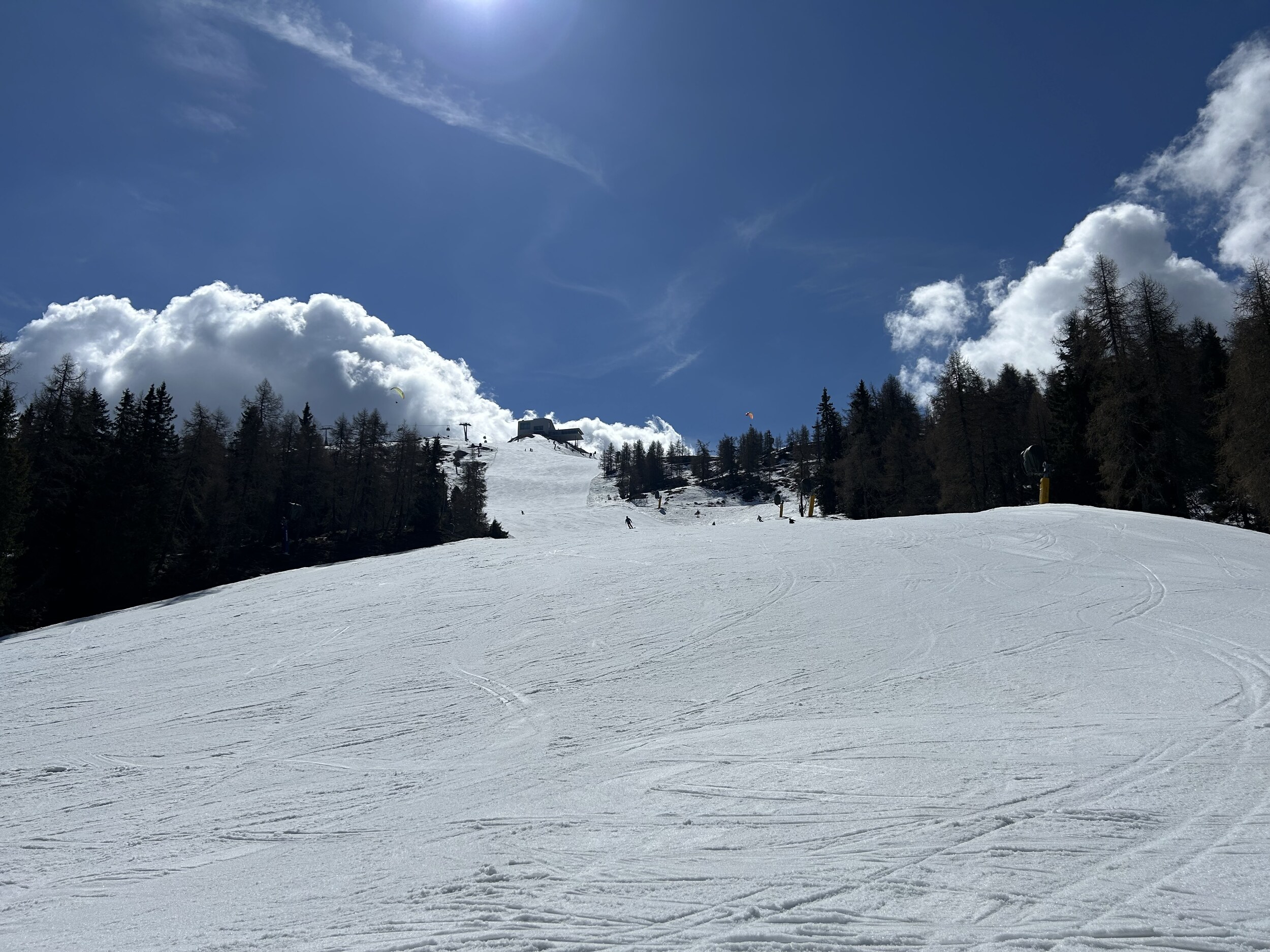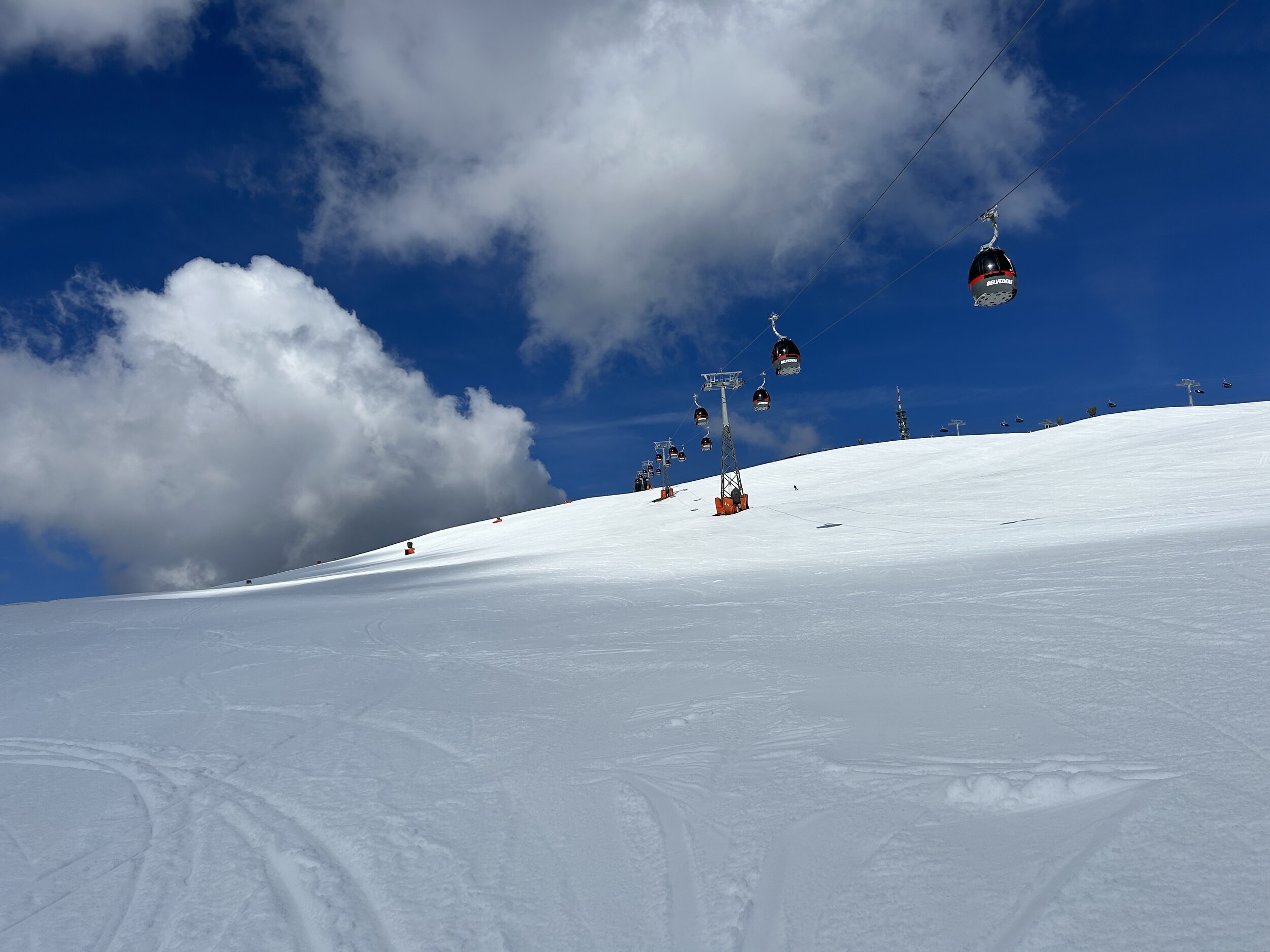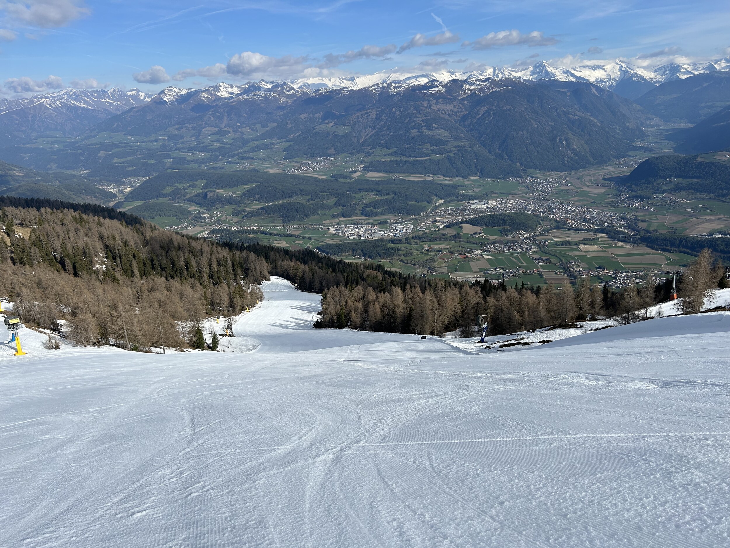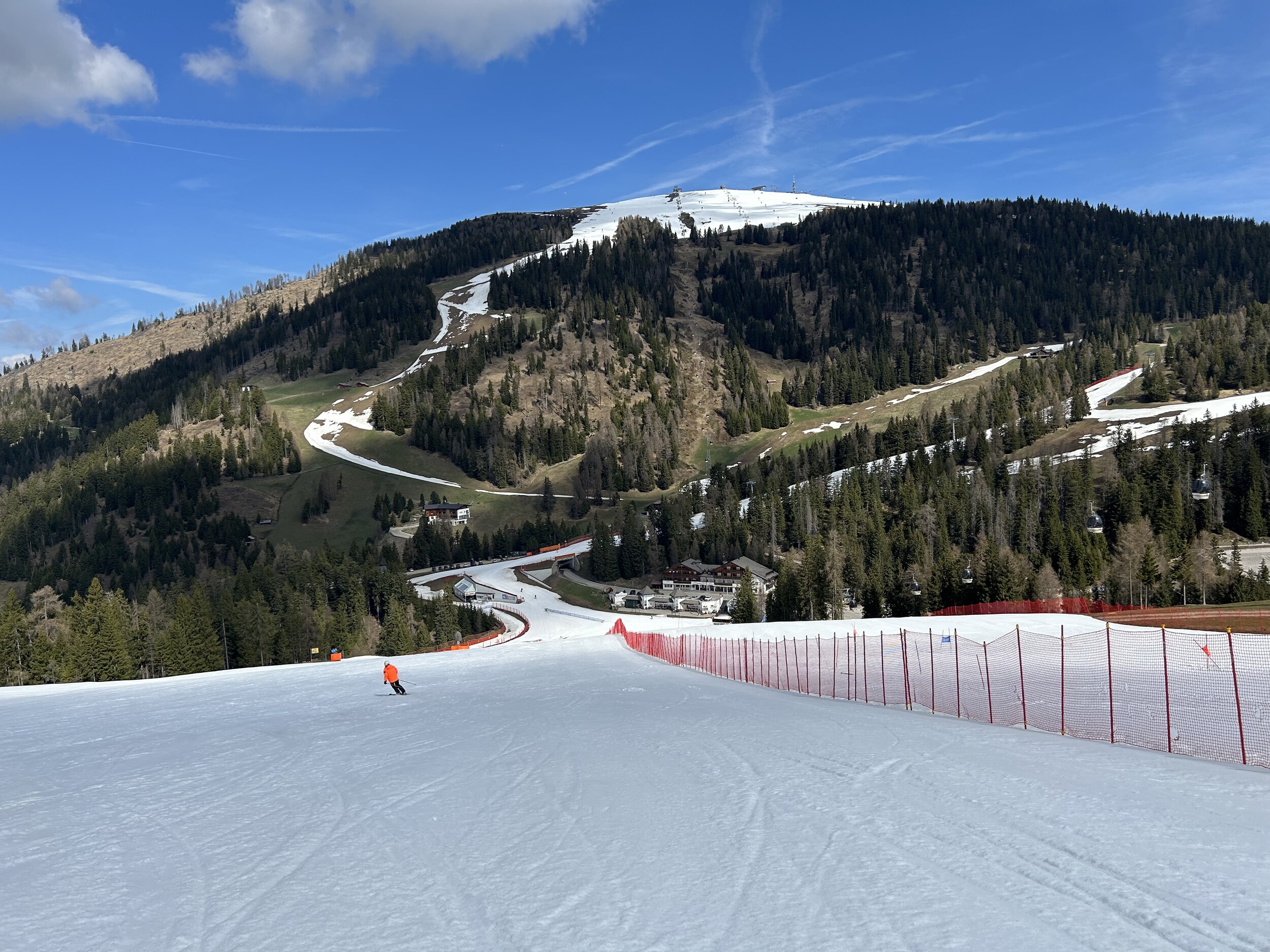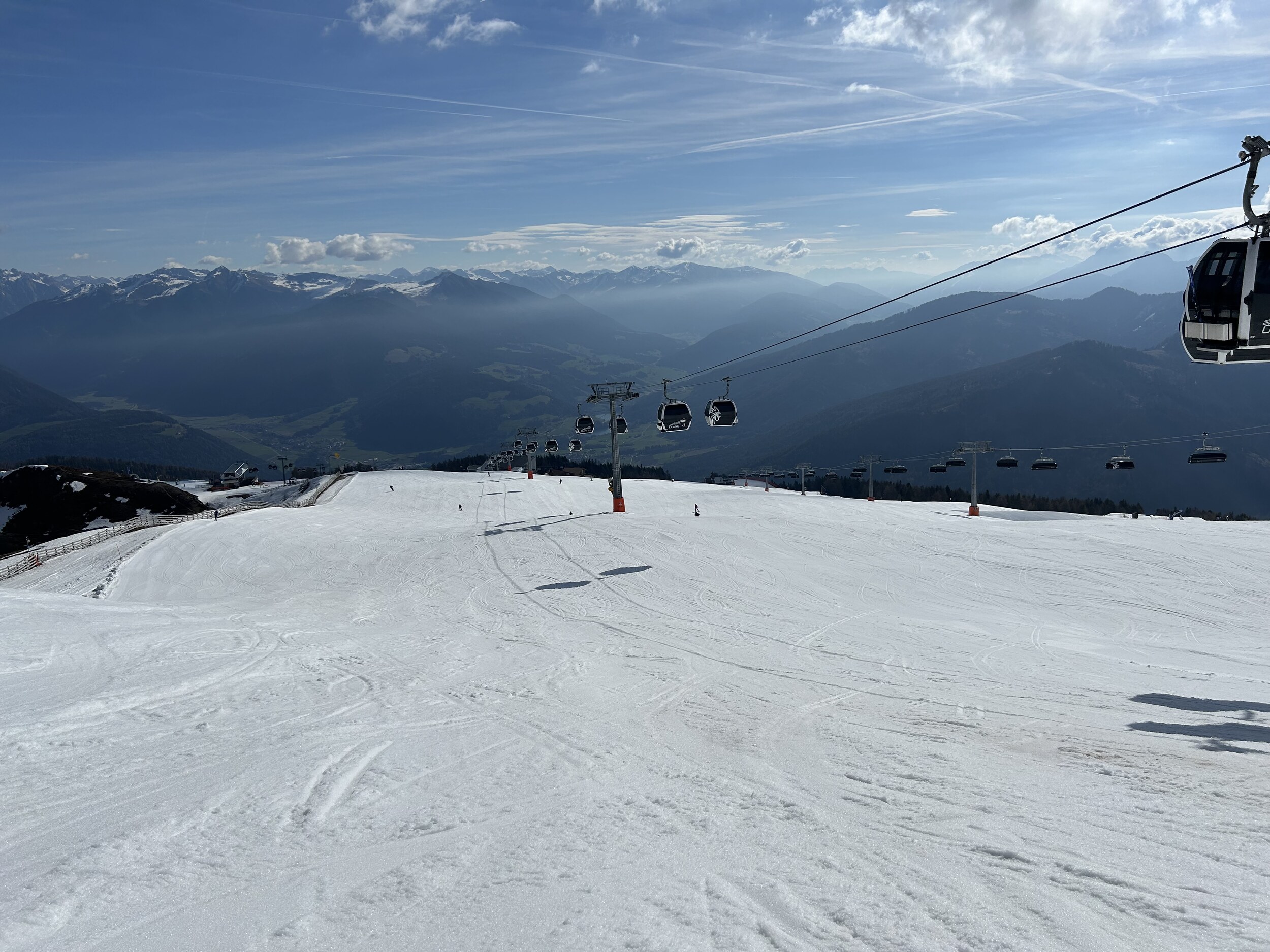 Am vorletzten Betriebstag ging sich doch noch ein Besuch am Kronplatz aus. Leider ist es mittlerweile sehr warm, aber oben war es am Morgen doch angefroren. Weich wurde ea ab 10.00 Uhr fast überall, blieb aber gut zum fahren, da sehr wenig los.