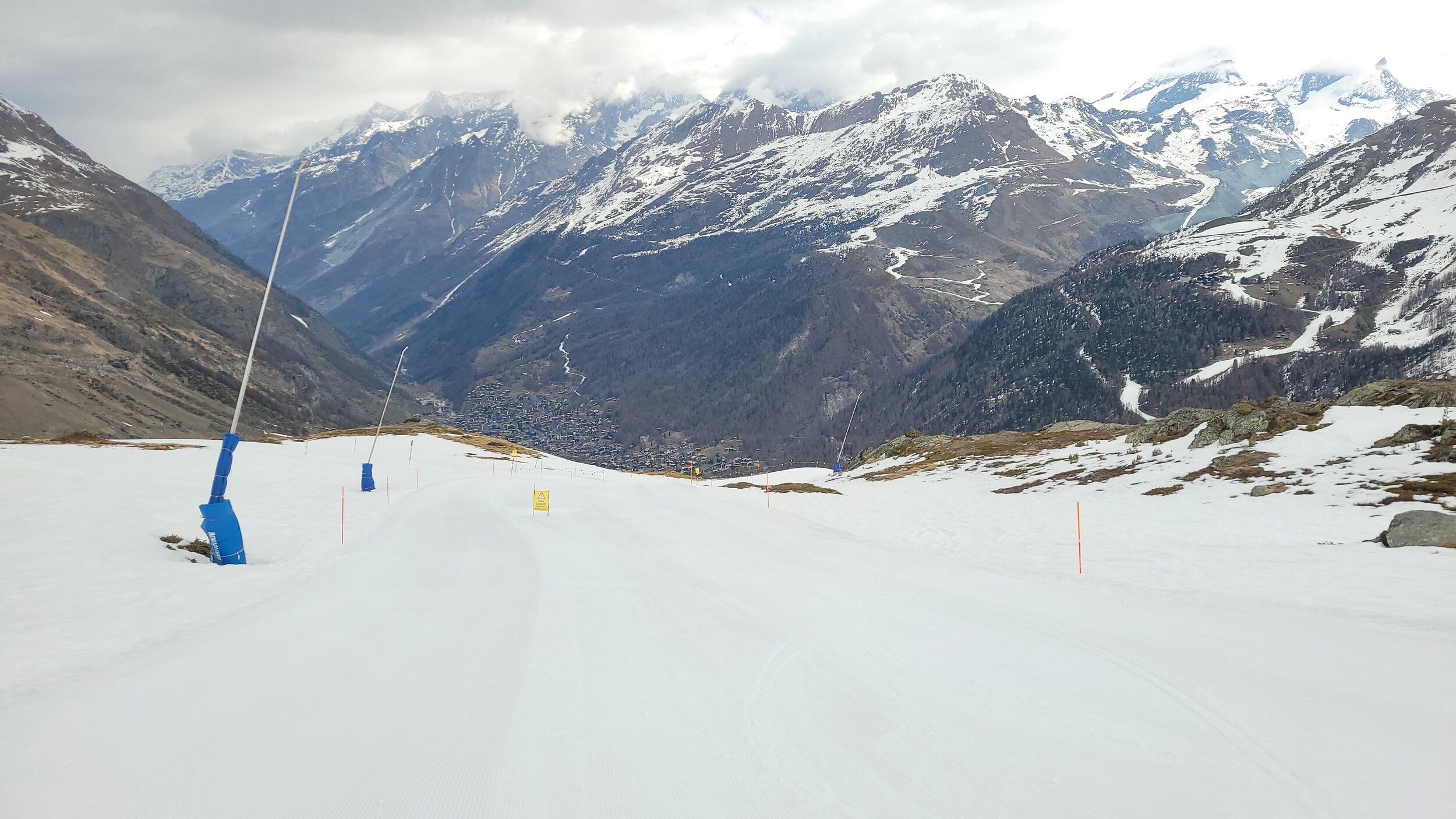 Die Pisten unter dem Matterhorn leider bereits sehr weich und der Sessel ultralangsam. Also nur eine Fahrt und dann via Aroleid-Schwarzsee runter ins Tal. Die schwarze Talabfahrt ist nicht mehr schön zu fahren. Super viele Steine, teilweise grosse Felsblöcke in der Mitte der Piste, und um 14.30 Uhr sehr fest zerfahren. Kann gerne schliessen (die Lawinenhänge sind auch grossflächig gesprengt worden, Schnee liegt genug, wenn nur die Steine nicht wären...). Gut, dass wir keine erwischt haben. Nachdem wir mit einem Grinsen die Kelle gefahren sind, sagen wir uns dass wir uns Hirli definitiv hätten ersparen können, wenn wir gewusst hätten, dass Hohtälli mit der White Hare auch zwischen 15 und 16 Uhr noch absolut top und ultraleer zu fahren war. Wiederholungsfahren und dann via Riffelberg ins Tal. Dann also morgen nochmals