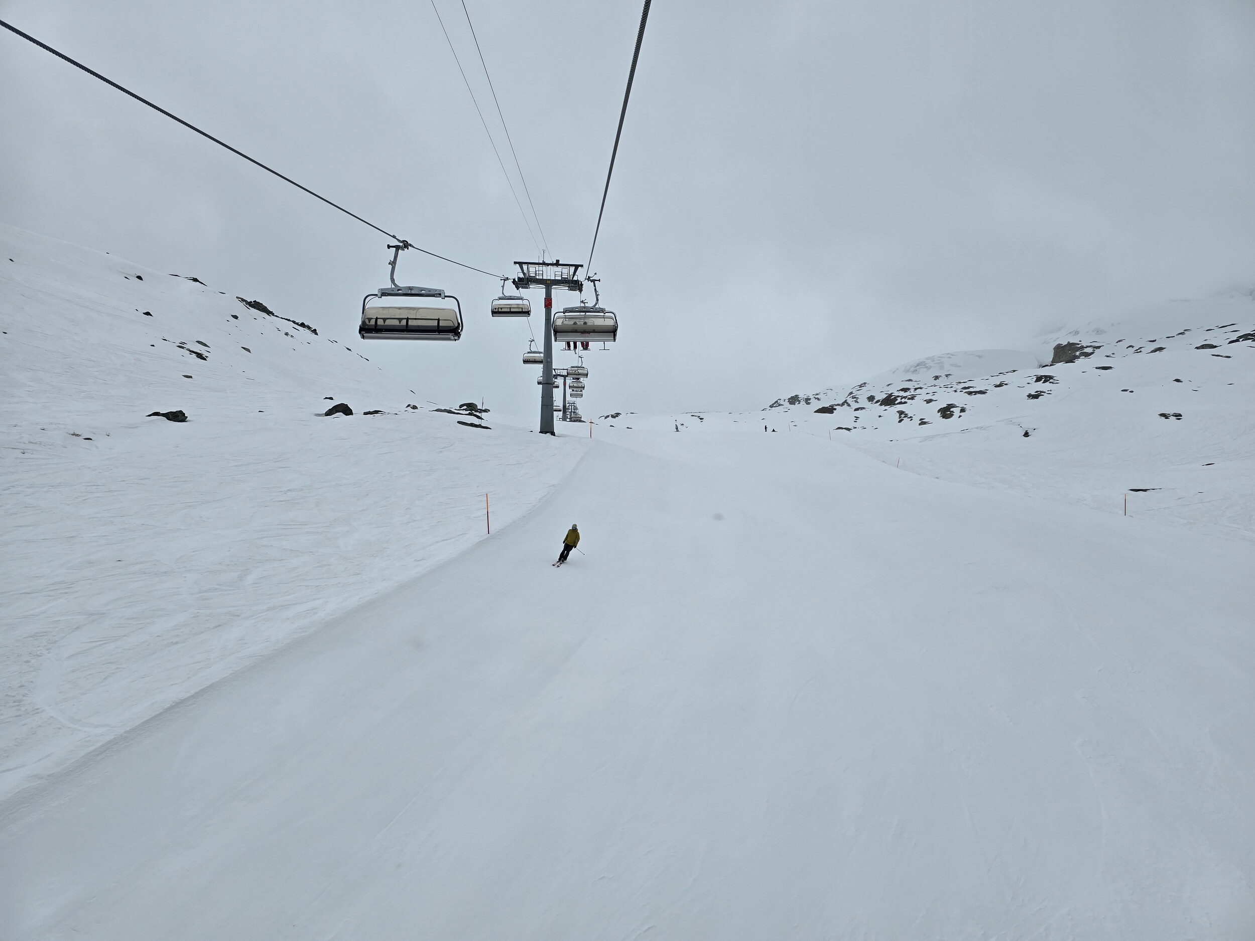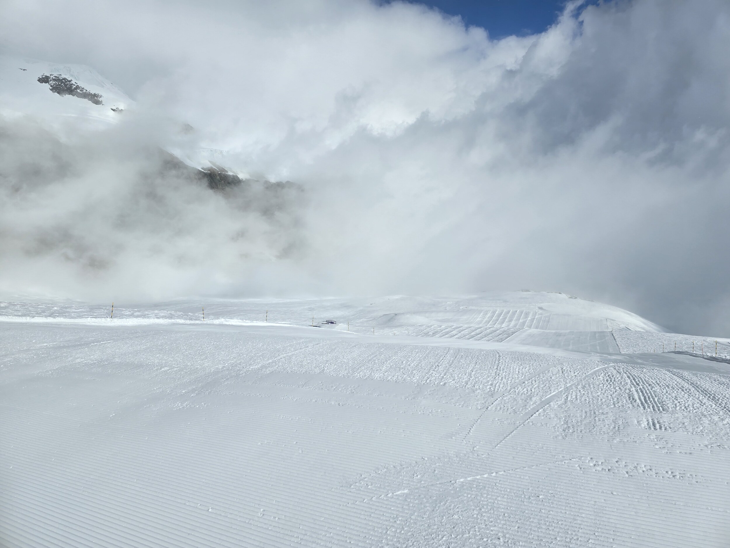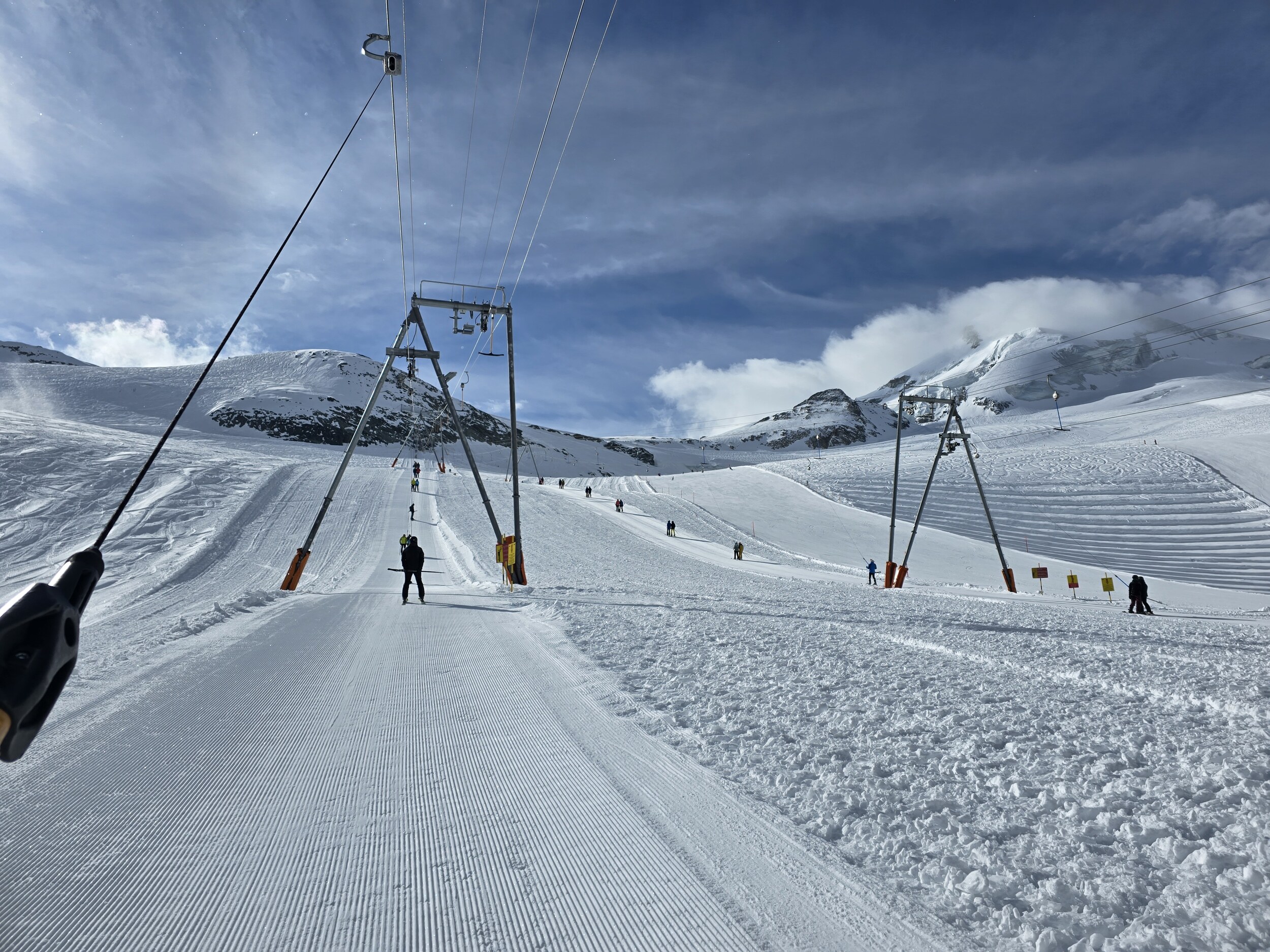 Am Nachmittag war es vorerst trüb und die Bodensicht stark eingeschränkt bzw. teilweise nicht vorhanden. Wir sind dann auch mal noch kurz hoch auf den Gletscher. Die Pisten dort waren erstaunlich gut in Schuss mit geringer Neuschneeauflage (ob aus Schneefall oder eingeweht war mir nicht klar), die Sicht hingegen miserabel. So sind wir runter zur KSB Morenia, wo sich ab ca. 14:45 die Wolken langsam gelichtet haben, sodass die Sicht Stück für Stück besser wurde. Gegen 16:00 kam dann sogar wieder die Sonne hervor. Die Pisten hielten sich deutlich besser als noch gestern. Einerseits sind sie deutlich kompakter, andererseits wurden sie heute aufgrund des Wetters weniger beansprucht. Fazit: Trotz dem nicht immer idealen Wetter hat es viel Spass gemacht. Die Pisten sind mittlerweile vor allem morgens in hervorragendem Zustand: Pulvrig, aber genügend Kompakt dass mam nicht mehr einbricht.