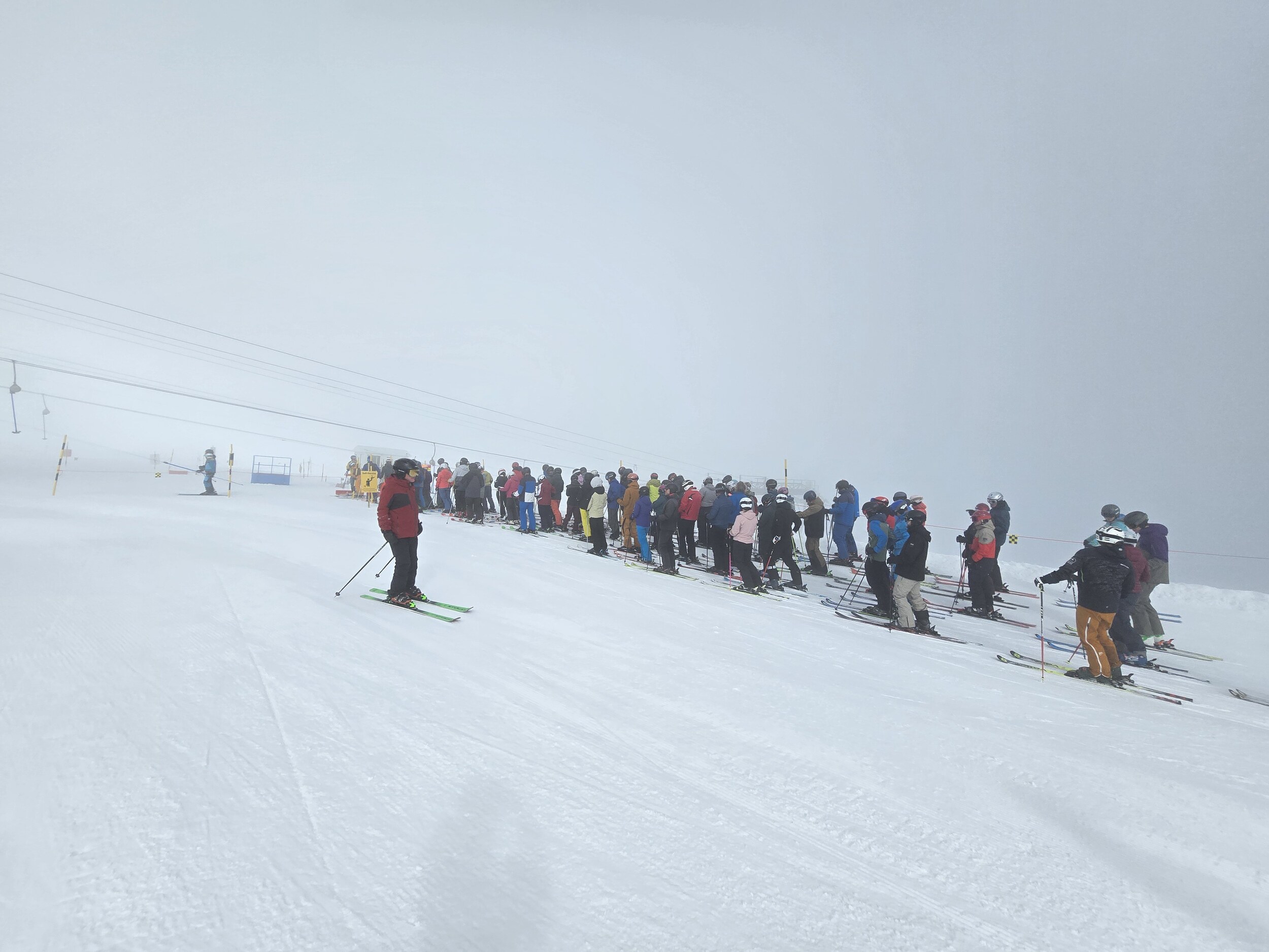 Die Piste ist sehr gut zu fahren, wenn auch bezüglich Präparation Verbesserungspotenzial vorhanden wäre. Da unerklärlicherweise nur 1 Lift läuft, bildet sich jedoch rasch eine lange Schlange Zudem zieht de Nebel zunehmend hoch.